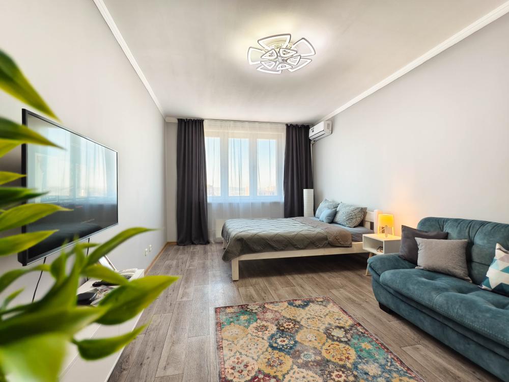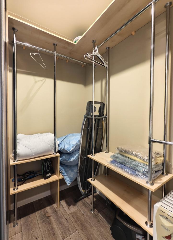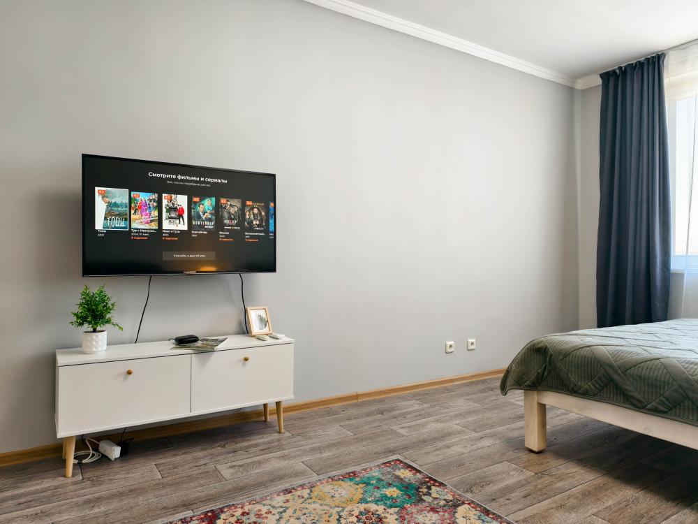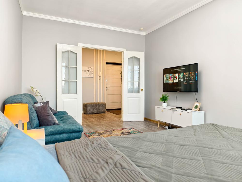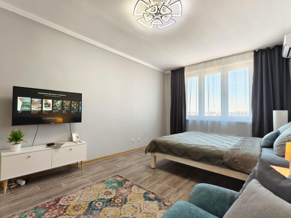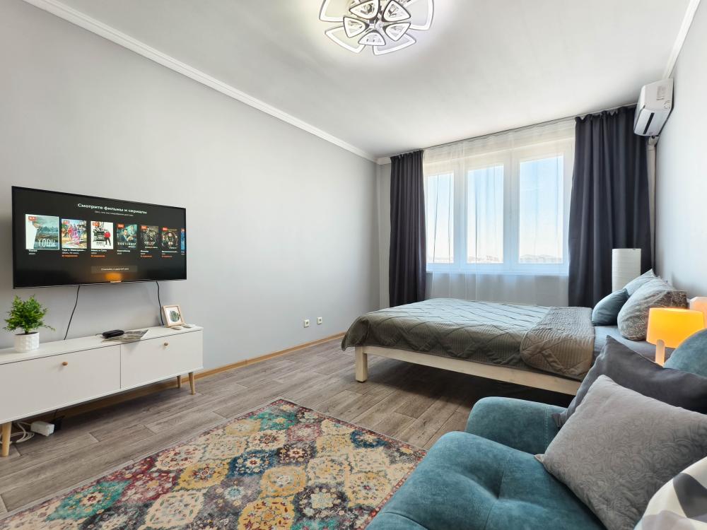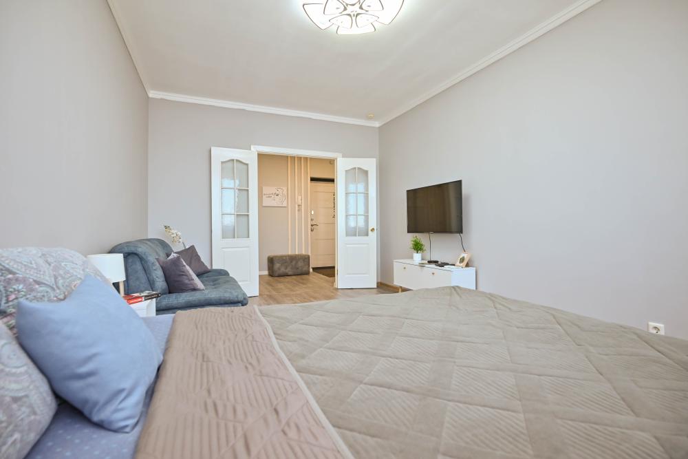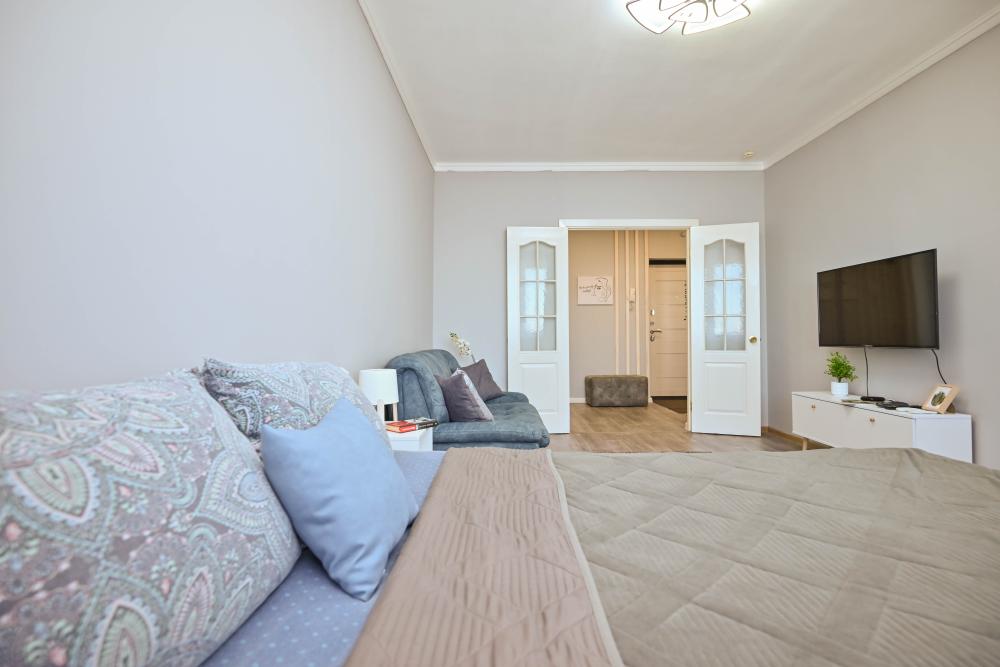 В квартире есть всё необходимое для проживания. В большой комнате находится: двуспальная кровать с комфортным ортопедическим матрасом; прикроватная тумба; диван с ортопедическим основанием и матрасом; телевизор с большим выбором каналов; большой комод для вещей; гладильная доска с утюгом. Для хранения верхней одежды предусмотрена гардеробная с зеркалом в полный рост. Кухня в современном дизайне имеет все удобства для приготовления пищи. Большой балкон с красивым видом на город . Ванная комната оснащена белоснежным санфаянсом со всеми удобствами.