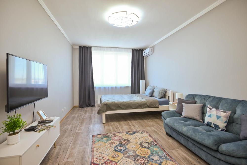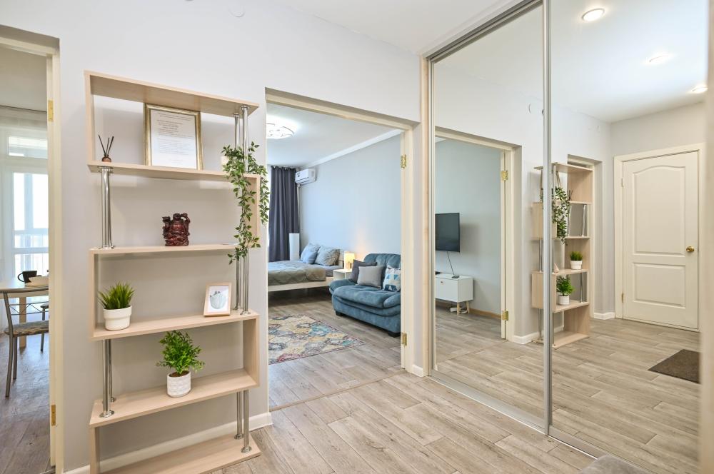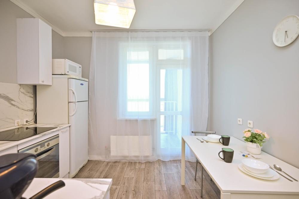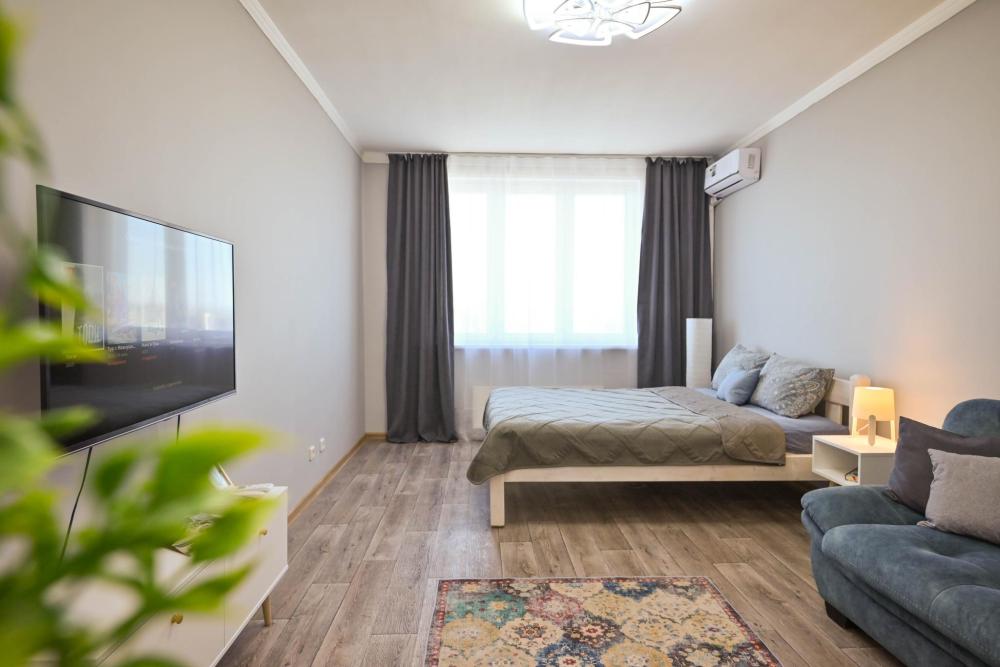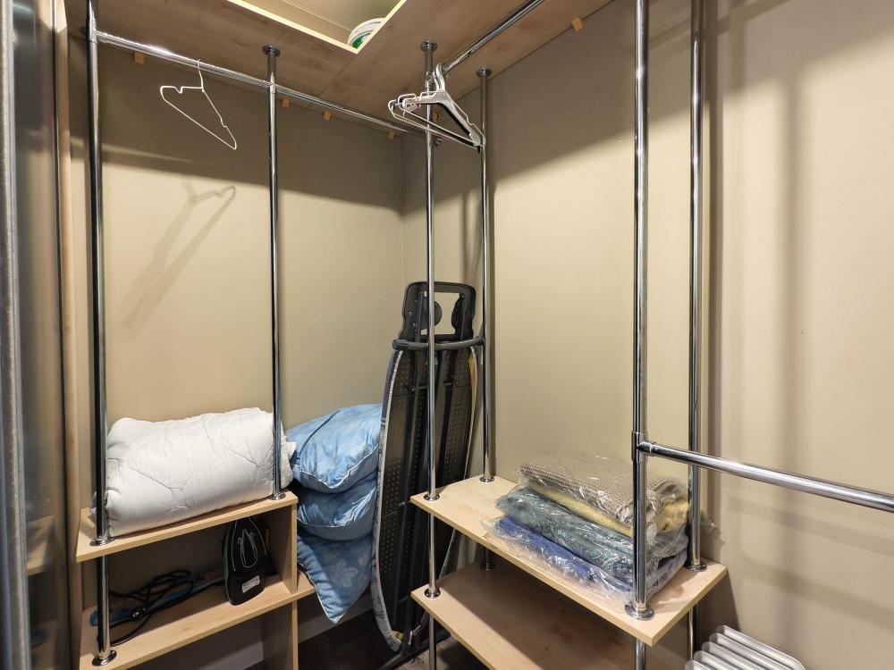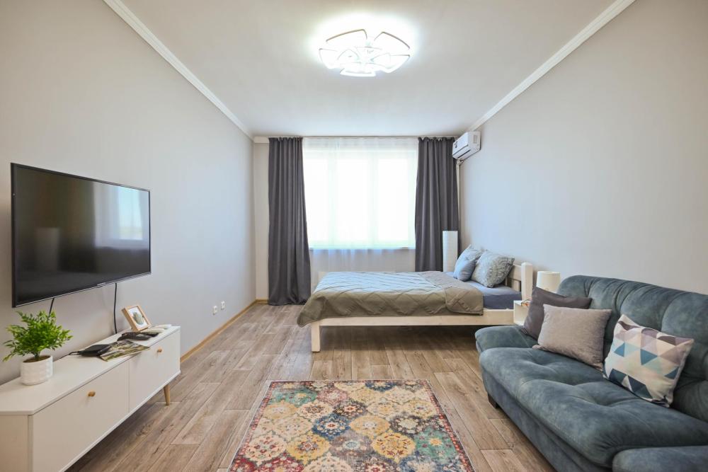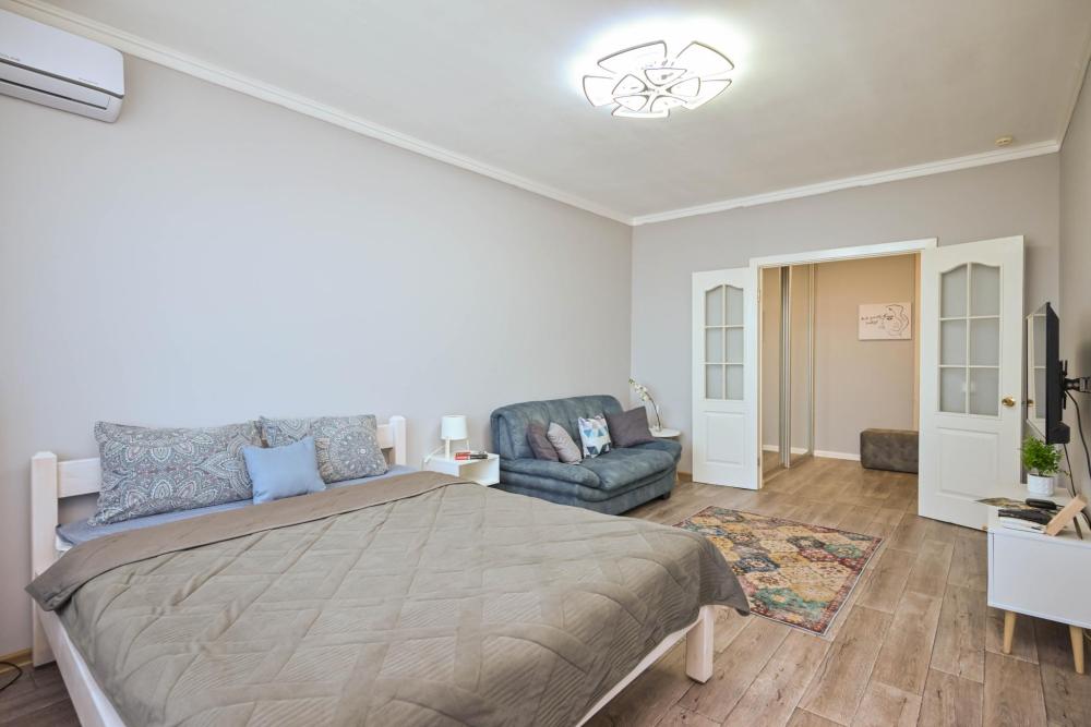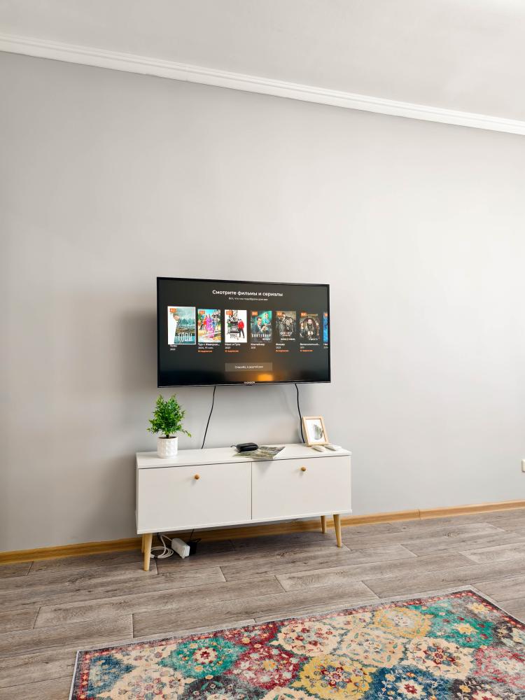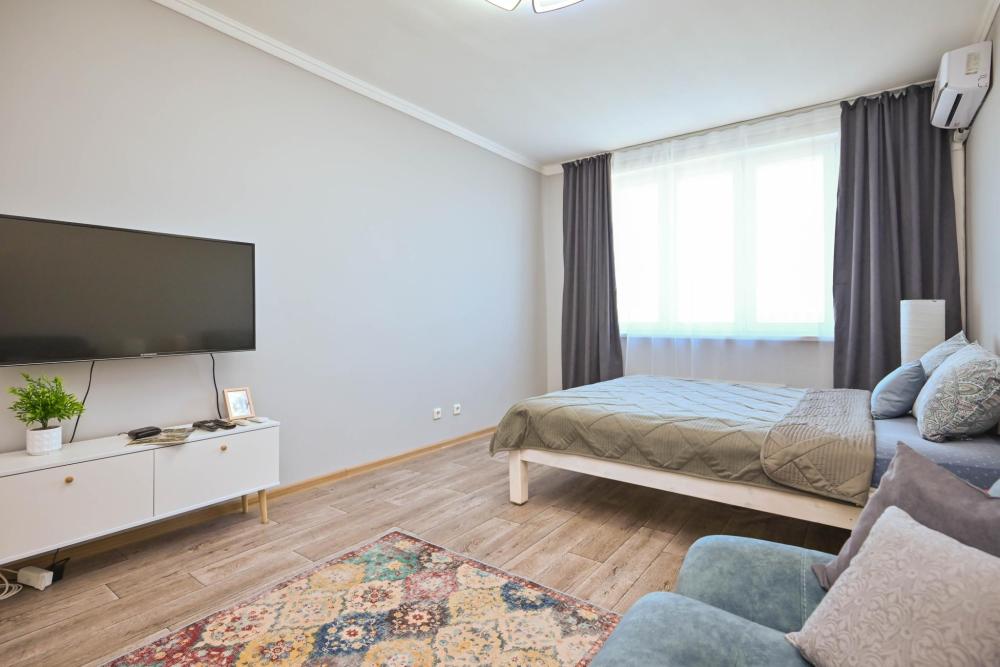 В квартире есть всё необходимое для проживания. В большой комнате находится: двуспальная кровать с комфортным ортопедическим матрасом; прикроватная тумба; диван с ортопедическим основанием и матрасом; телевизор с большим выбором каналов; большой комод для вещей; гладильная доска с утюгом. Для хранения верхней одежды предусмотрена гардеробная с зеркалом в полный рост. Кухня в современном дизайне имеет все удобства для приготовления пищи. Большой балкон с красивым видом на город . Ванная комната оснащена белоснежным санфаянсом со всеми удобствами.