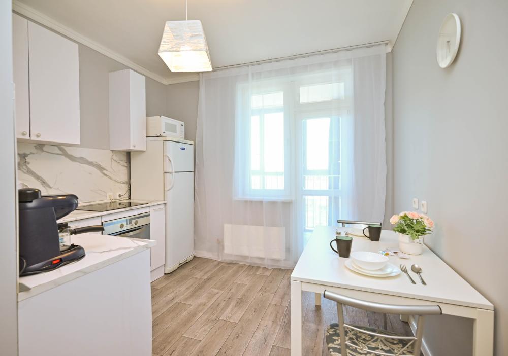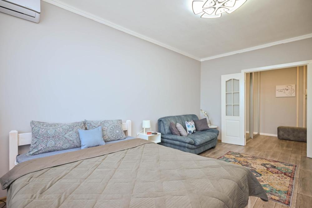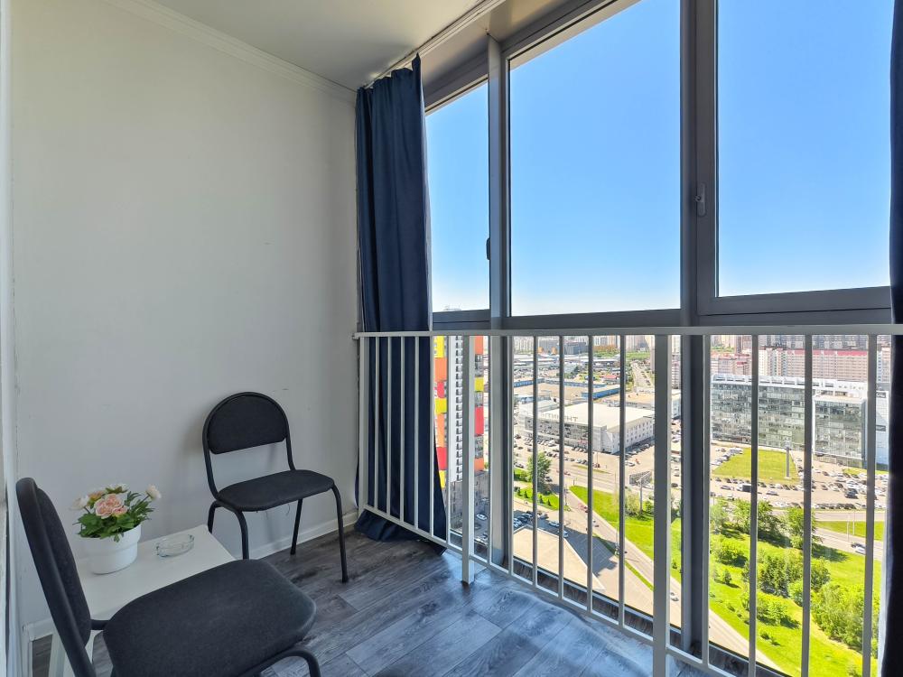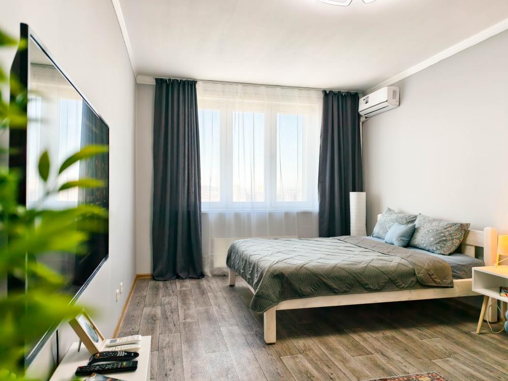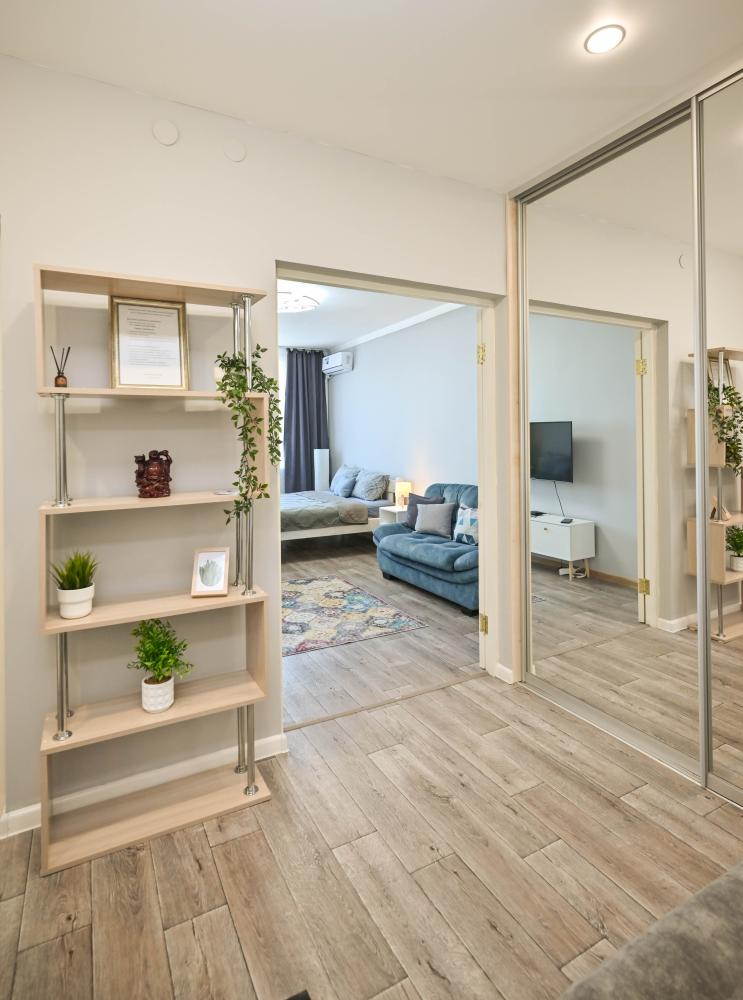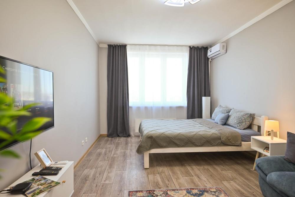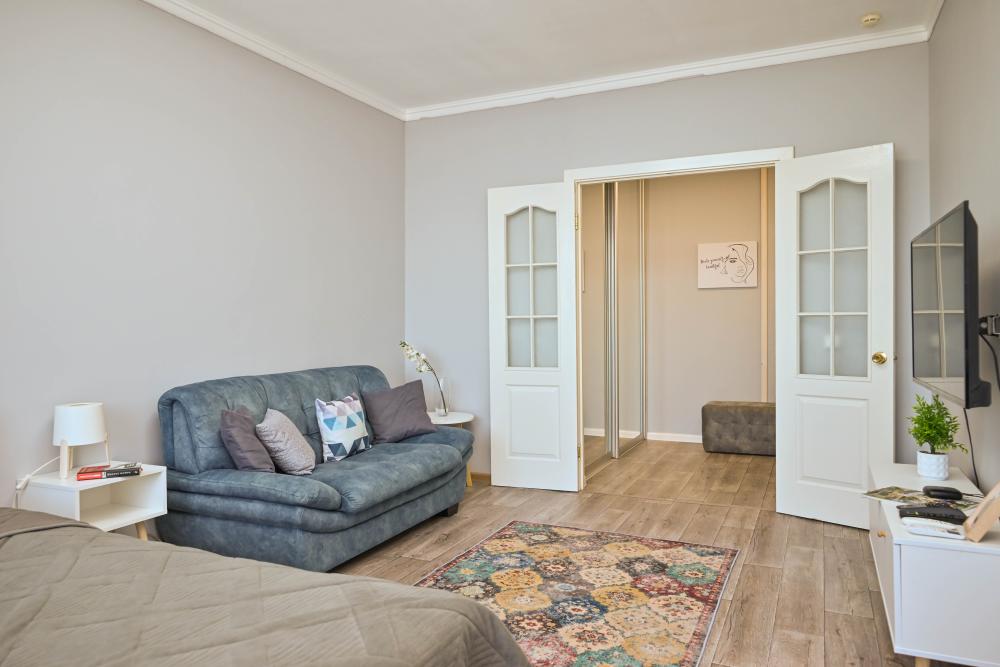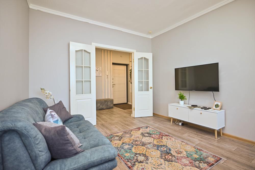 В квартире есть всё необходимое для проживания. В большой комнате находится: двуспальная кровать с комфортным ортопедическим матрасом; прикроватная тумба; диван с ортопедическим основанием и матрасом; телевизор с большим выбором каналов; большой комод для вещей; гладильная доска с утюгом. Для хранения верхней одежды предусмотрена гардеробная с зеркалом в полный рост. Кухня в современном дизайне имеет все удобства для приготовления пищи. Большой балкон с красивым видом на город . Ванная комната оснащена белоснежным санфаянсом со всеми удобствами.