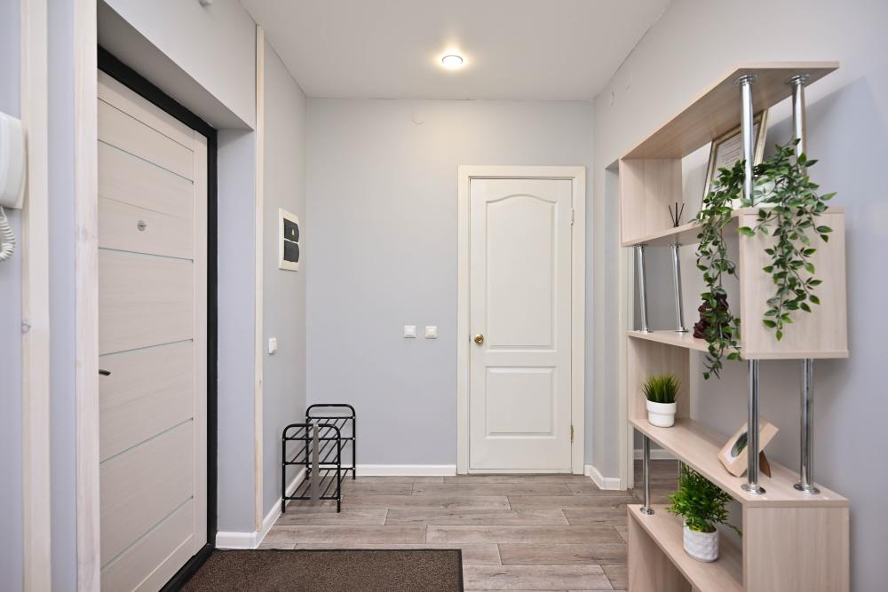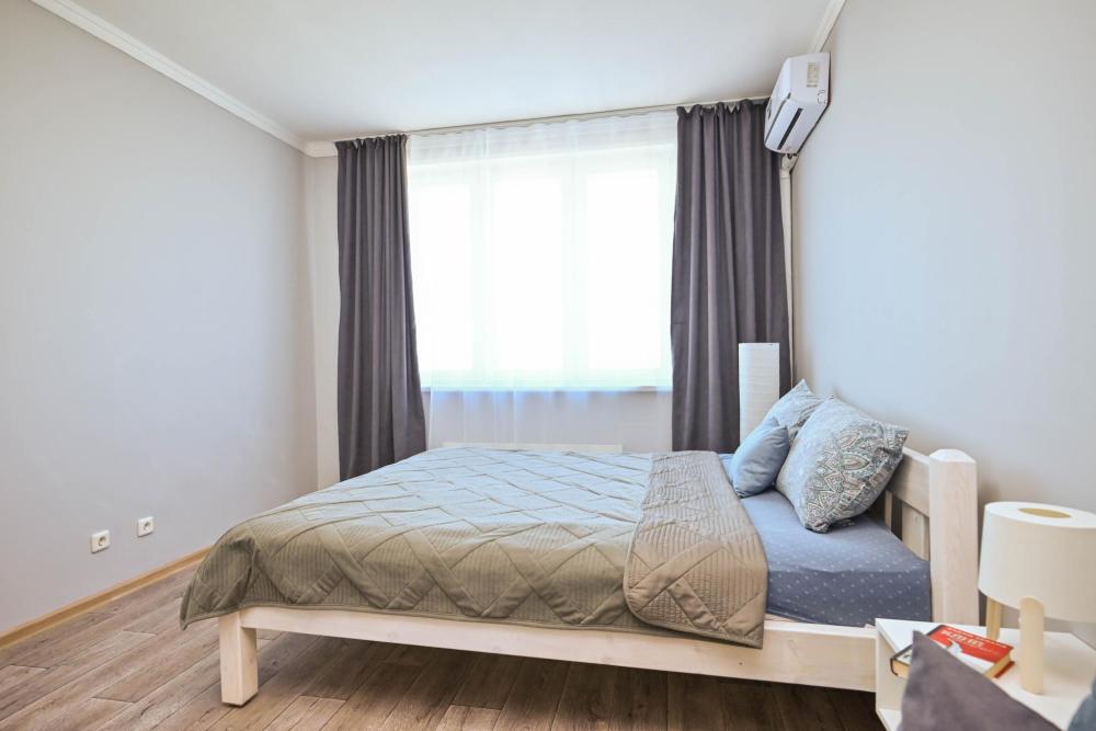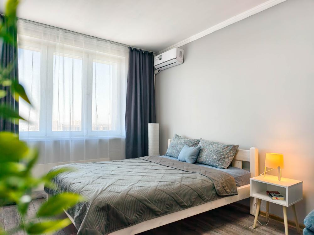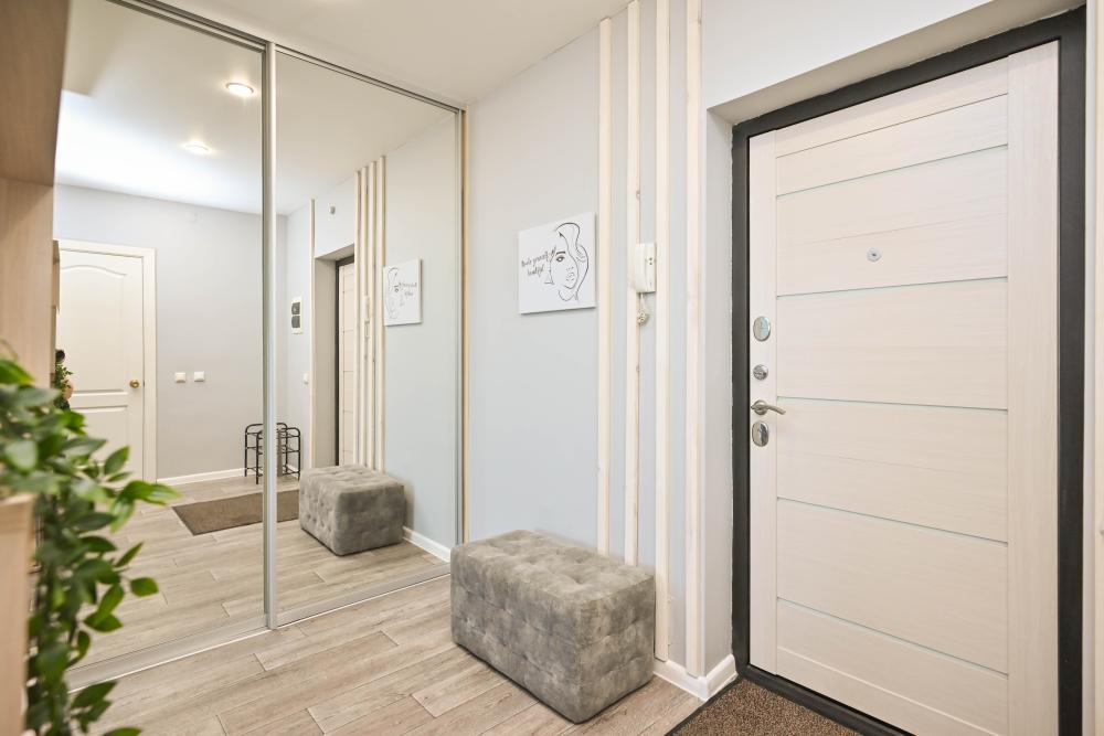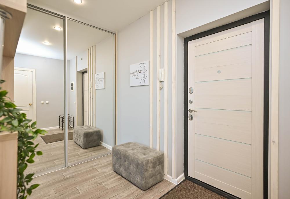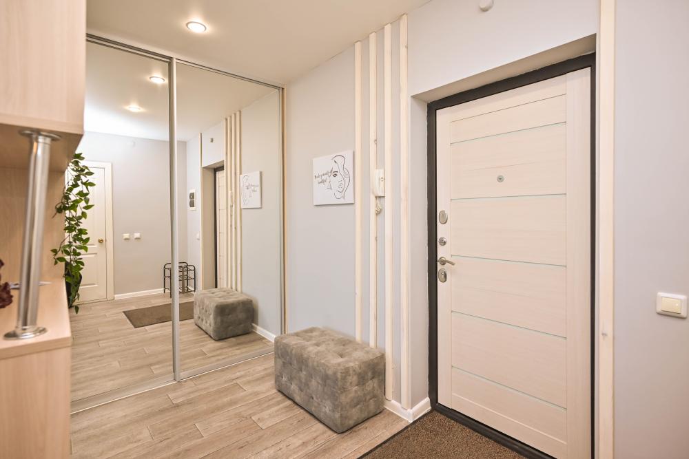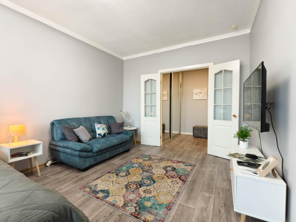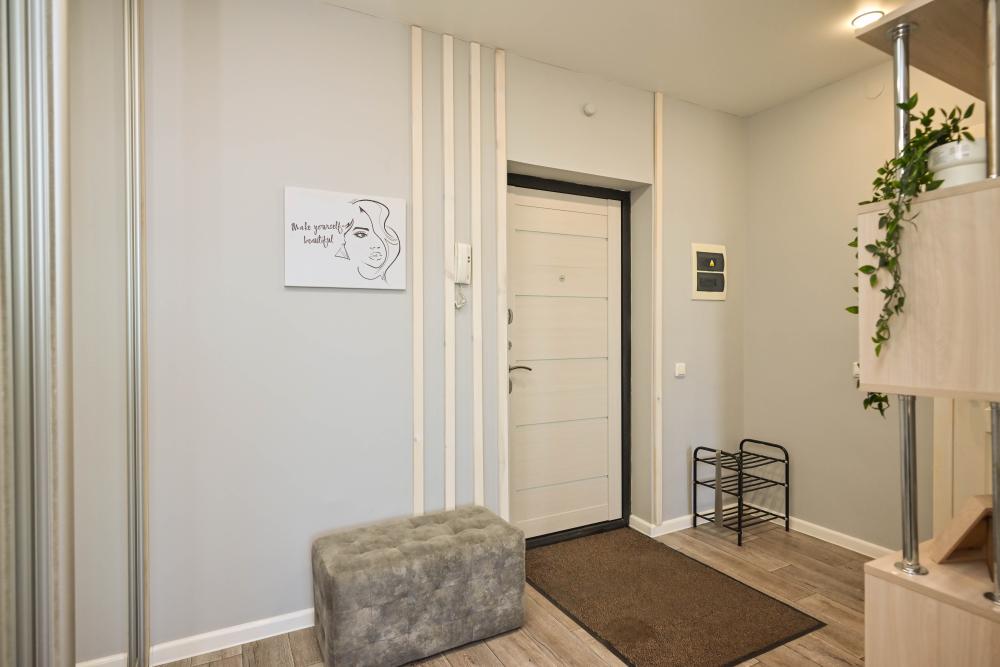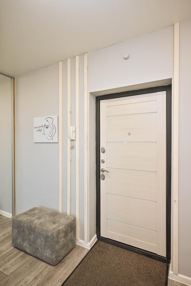 В квартире есть всё необходимое для проживания. В большой комнате находится: двуспальная кровать с комфортным ортопедическим матрасом; прикроватная тумба; диван с ортопедическим основанием и матрасом; телевизор с большим выбором каналов; большой комод для вещей; гладильная доска с утюгом. Для хранения верхней одежды предусмотрена гардеробная с зеркалом в полный рост. Кухня в современном дизайне имеет все удобства для приготовления пищи. Большой балкон с красивым видом на город . Ванная комната оснащена белоснежным санфаянсом со всеми удобствами.