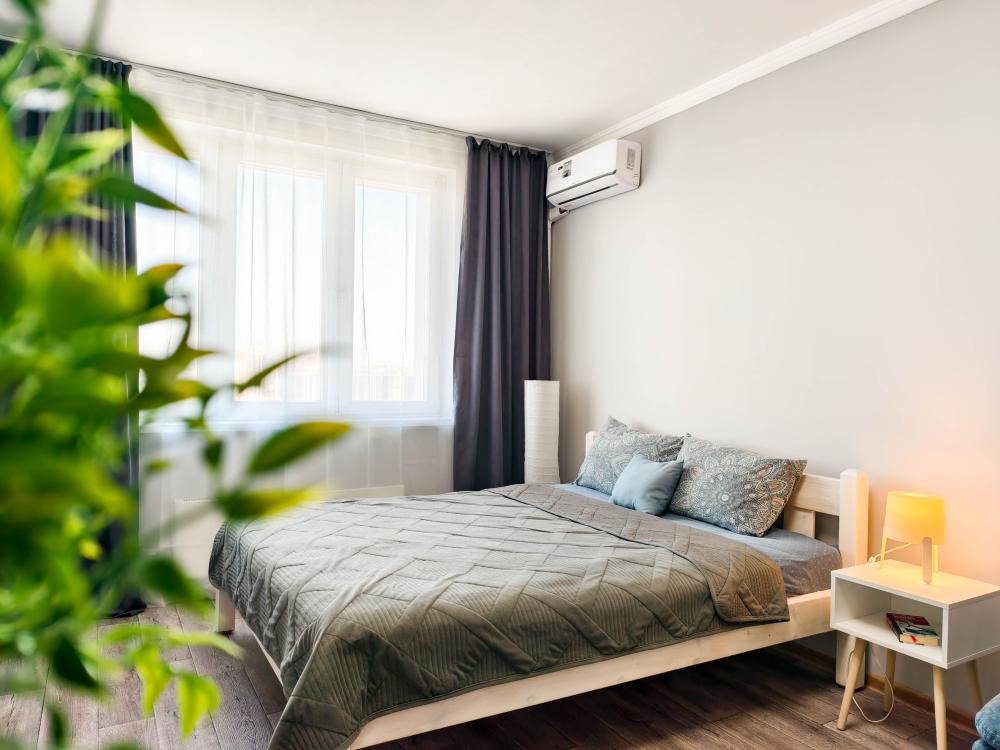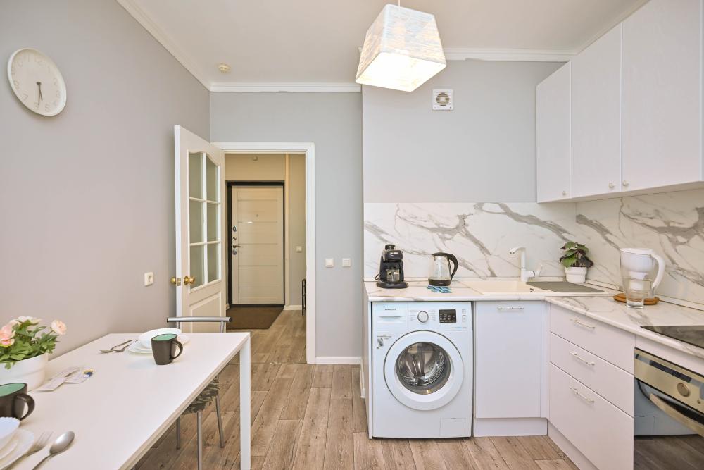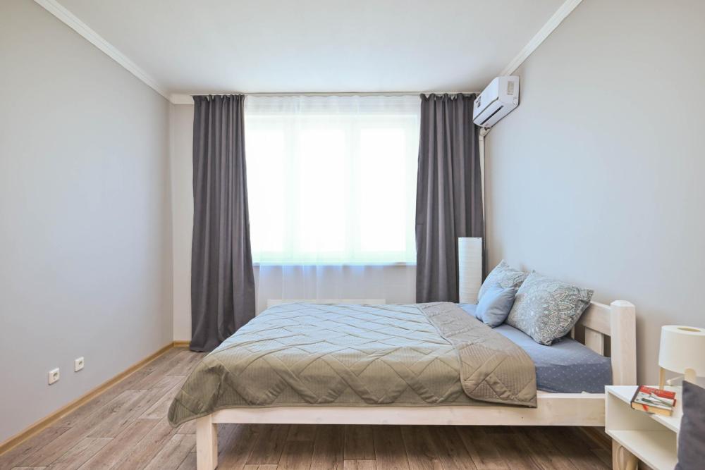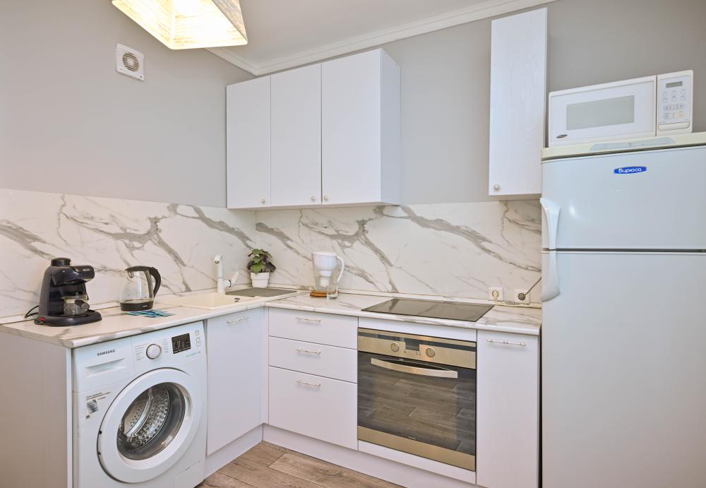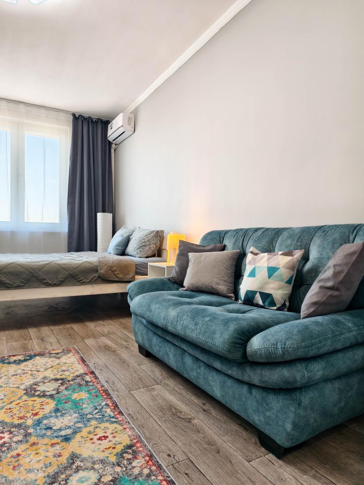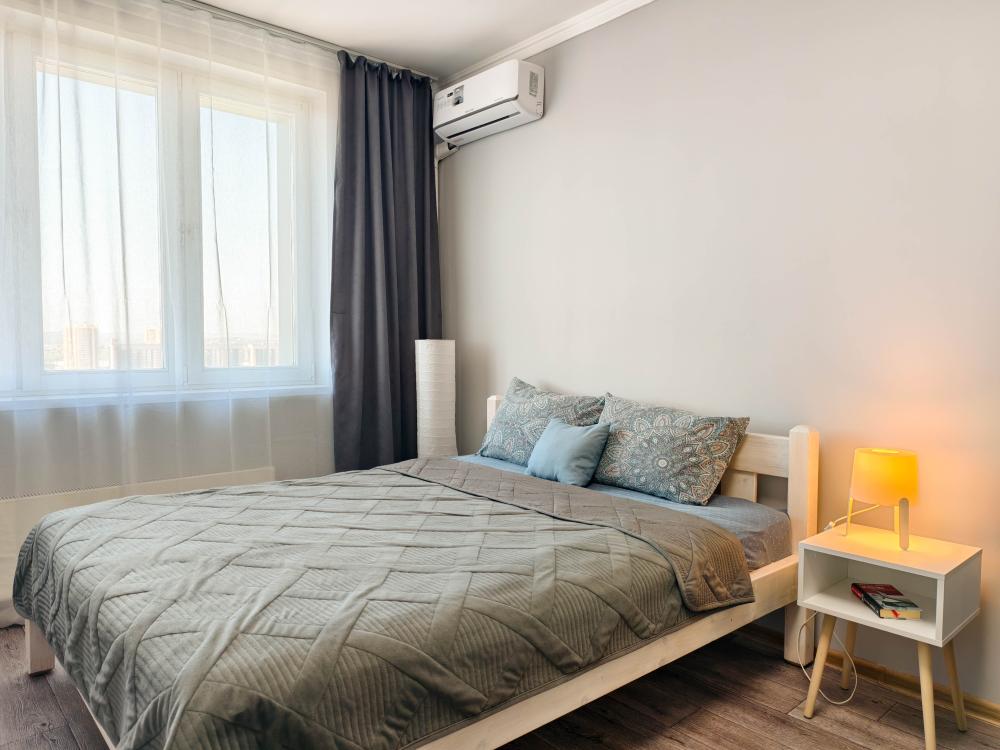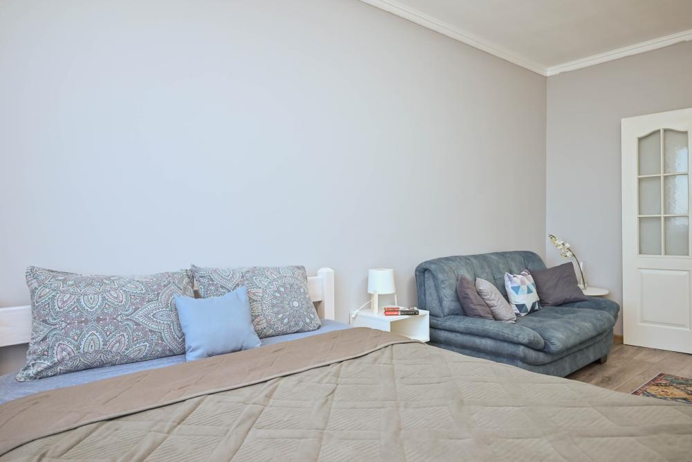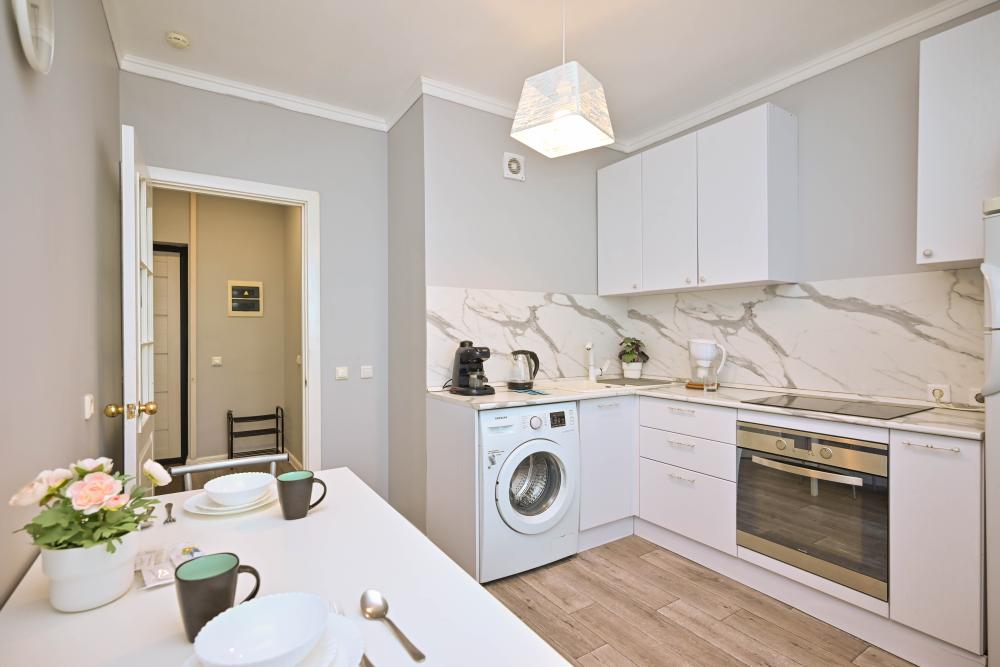 В квартире есть всё необходимое для проживания. В большой комнате находится: двуспальная кровать с комфортным ортопедическим матрасом; прикроватная тумба; диван с ортопедическим основанием и матрасом; телевизор с большим выбором каналов; большой комод для вещей; гладильная доска с утюгом. Для хранения верхней одежды предусмотрена гардеробная с зеркалом в полный рост. Кухня в современном дизайне имеет все удобства для приготовления пищи. Большой балкон с красивым видом на город . Ванная комната оснащена белоснежным санфаянсом со всеми удобствами.
