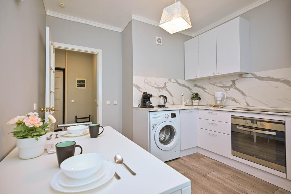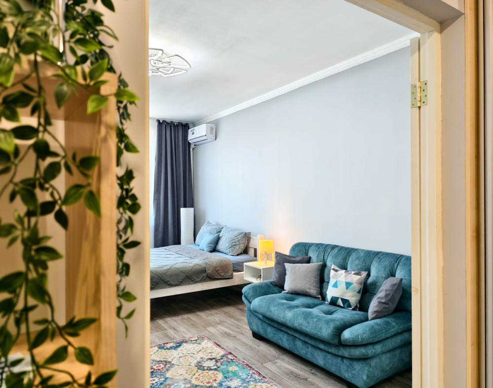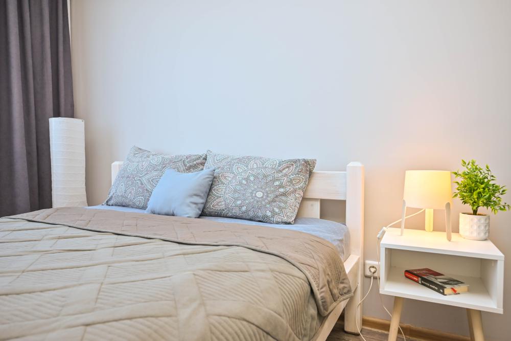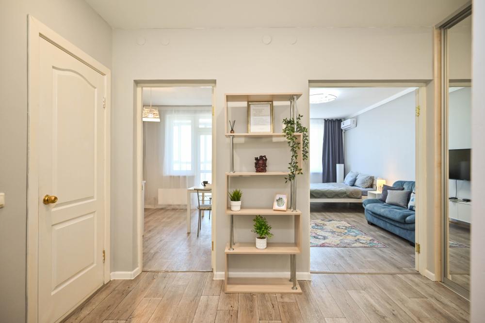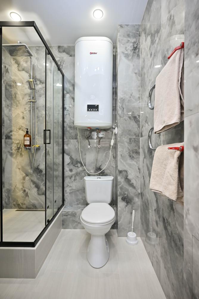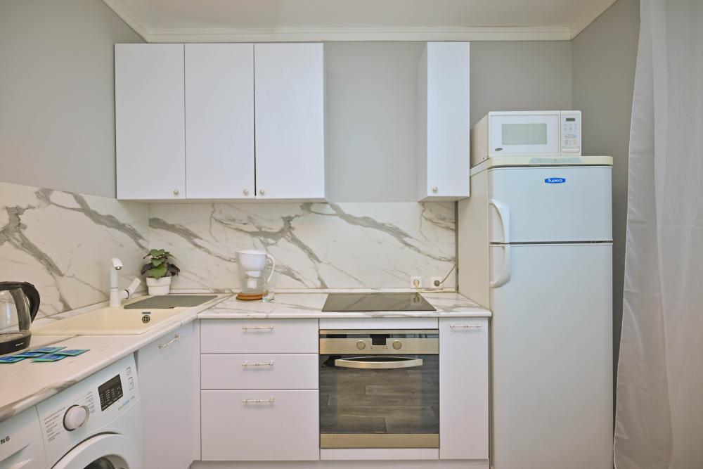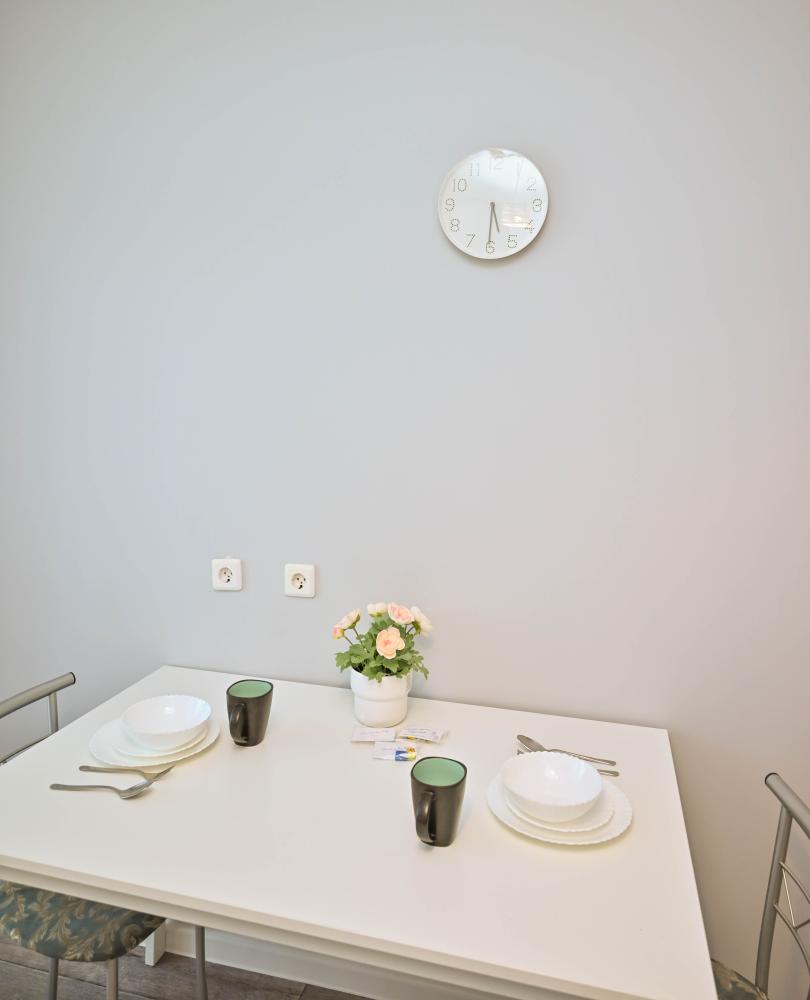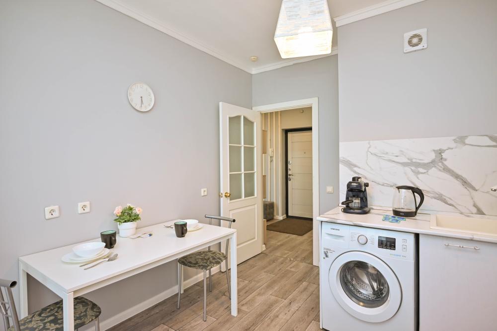 В квартире есть всё необходимое для проживания. В большой комнате находится: двуспальная кровать с комфортным ортопедическим матрасом; прикроватная тумба; диван с ортопедическим основанием и матрасом; телевизор с большим выбором каналов; большой комод для вещей; гладильная доска с утюгом. Для хранения верхней одежды предусмотрена гардеробная с зеркалом в полный рост. Кухня в современном дизайне имеет все удобства для приготовления пищи. Большой балкон с красивым видом на город . Ванная комната оснащена белоснежным санфаянсом со всеми удобствами.