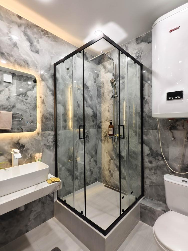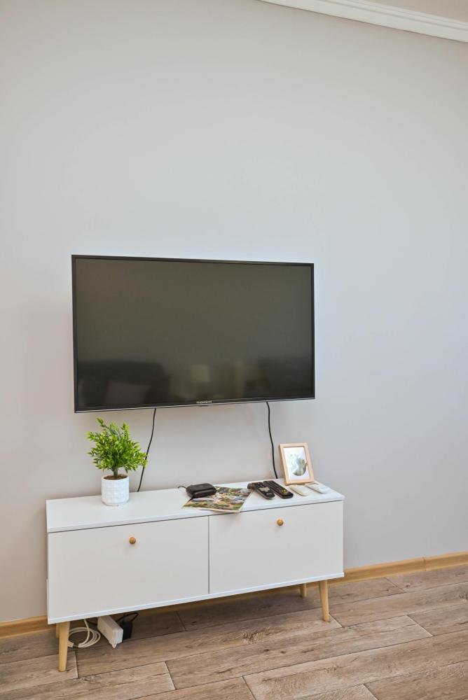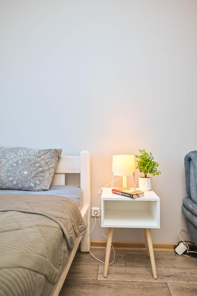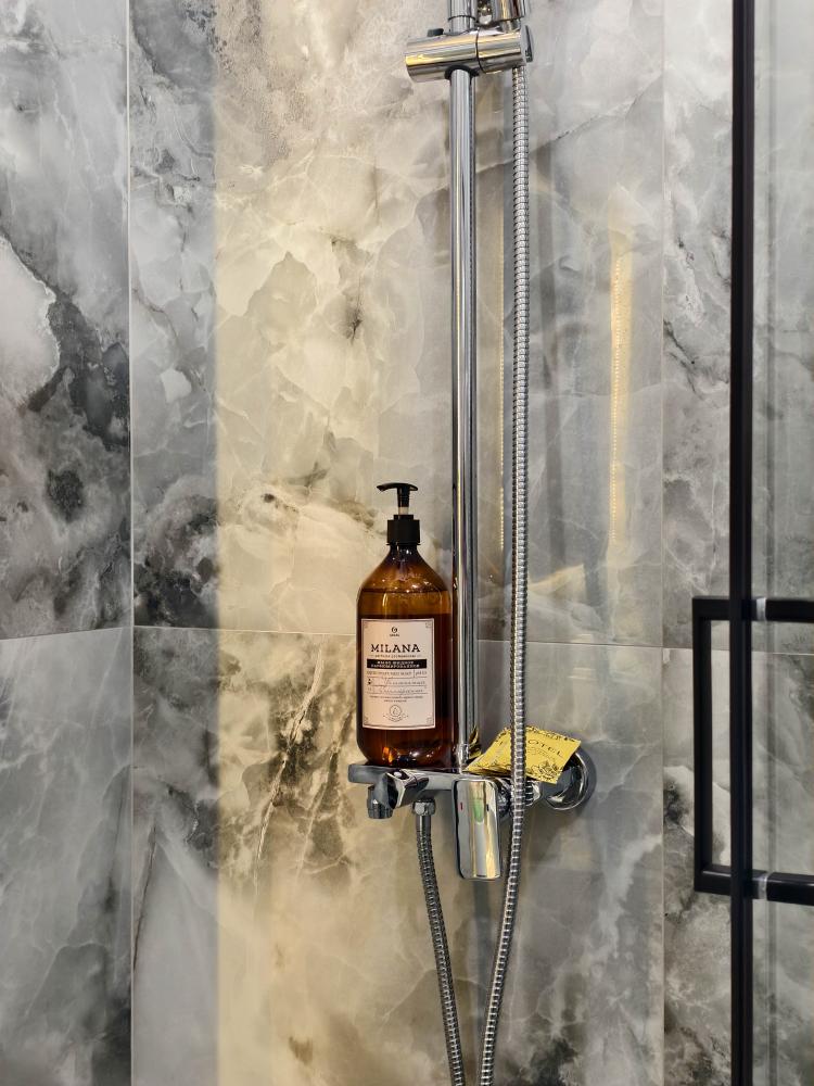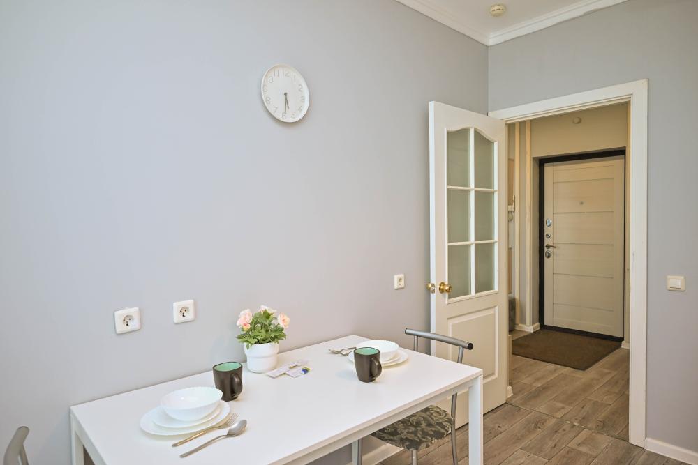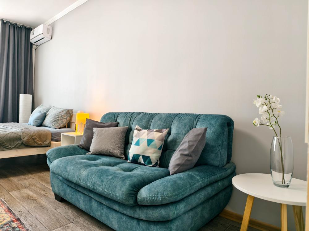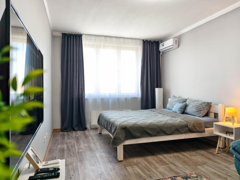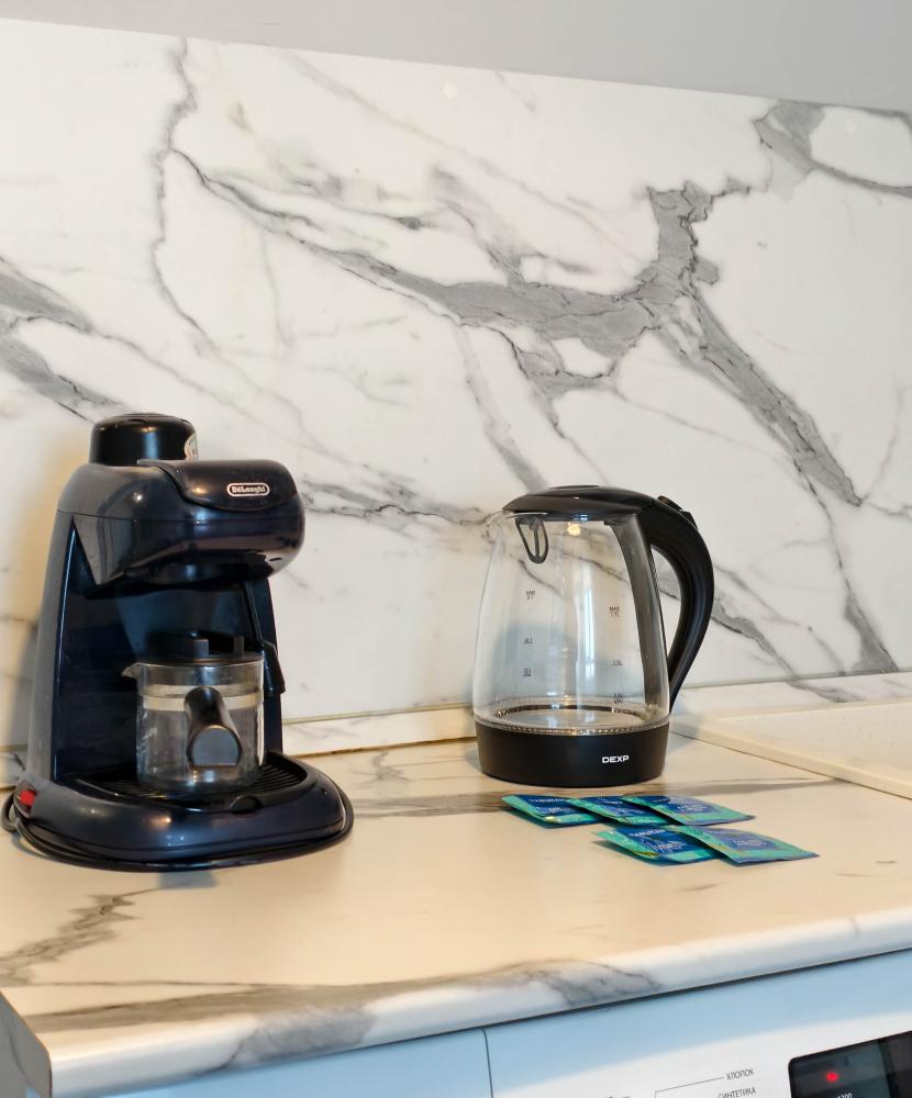 В квартире есть всё необходимое для проживания. В большой комнате находится: двуспальная кровать с комфортным ортопедическим матрасом; прикроватная тумба; диван с ортопедическим основанием и матрасом; телевизор с большим выбором каналов; большой комод для вещей; гладильная доска с утюгом. Для хранения верхней одежды предусмотрена гардеробная с зеркалом в полный рост. Кухня в современном дизайне имеет все удобства для приготовления пищи. Большой балкон с красивым видом на город . Ванная комната оснащена белоснежным санфаянсом со всеми удобствами.