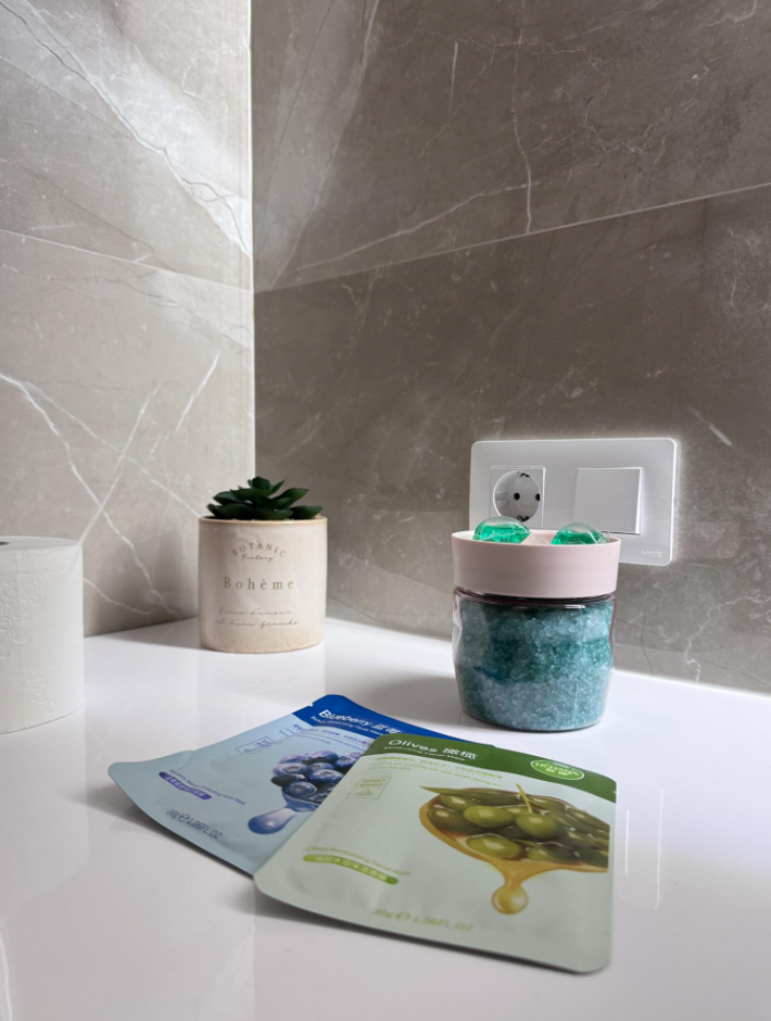 Графин с чистейшей водой, маски для лица, соль для ванны, свечи для романтических вечеров – всё для вашего удовольствия!
