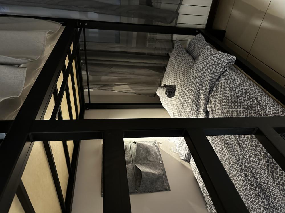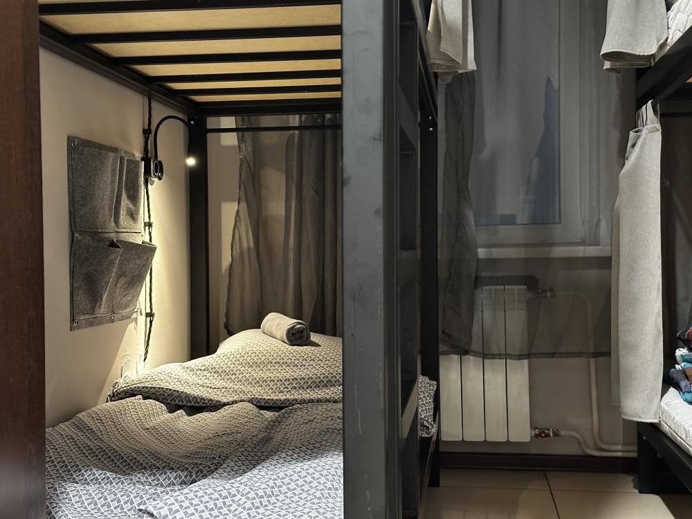 Комната с 12 уютными спальными местами и санузлом в комнате. Каждое место оборудовано личной розеткой, светильником, крючком и мягким конвертом с карманами для личных вещей. Также со всех сторон присутствуют шторки для уединения. В комнате располагаются индивидуальные шкафчики с замком и вешалка для верхней одежды.