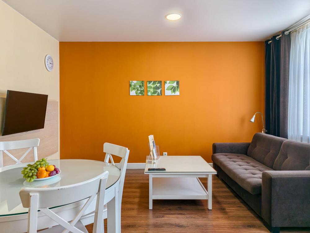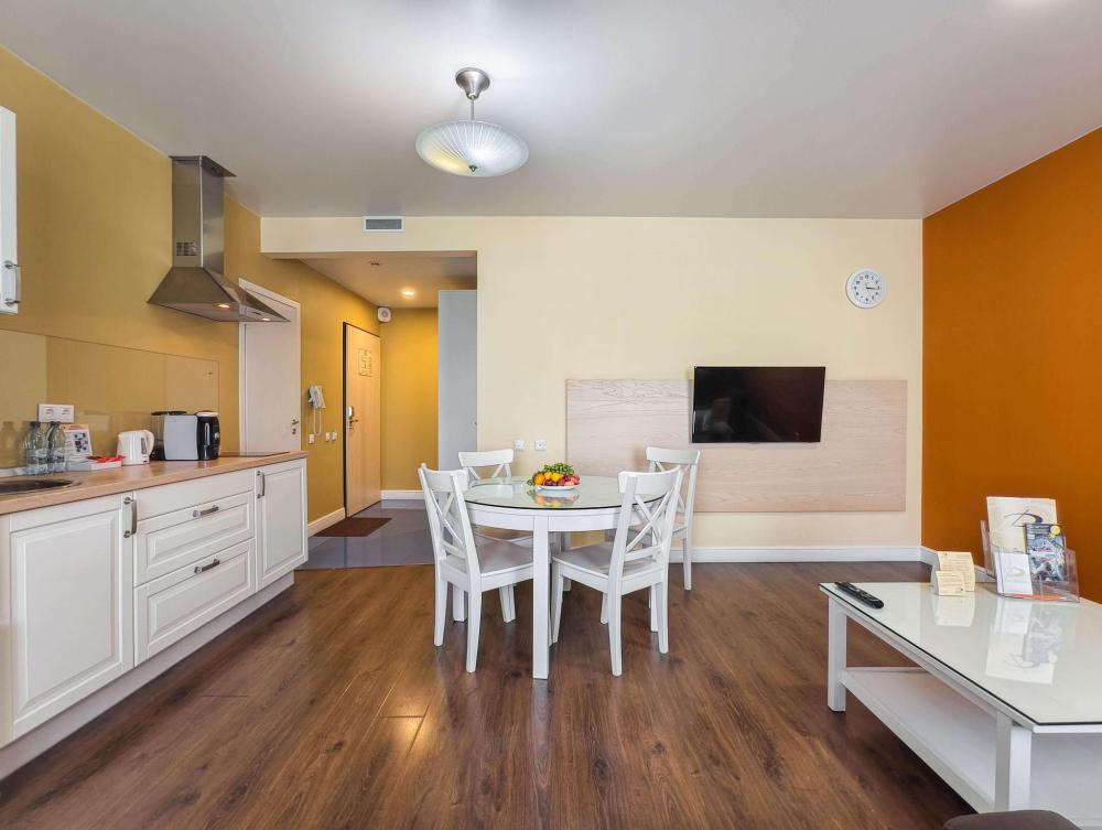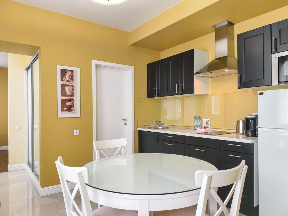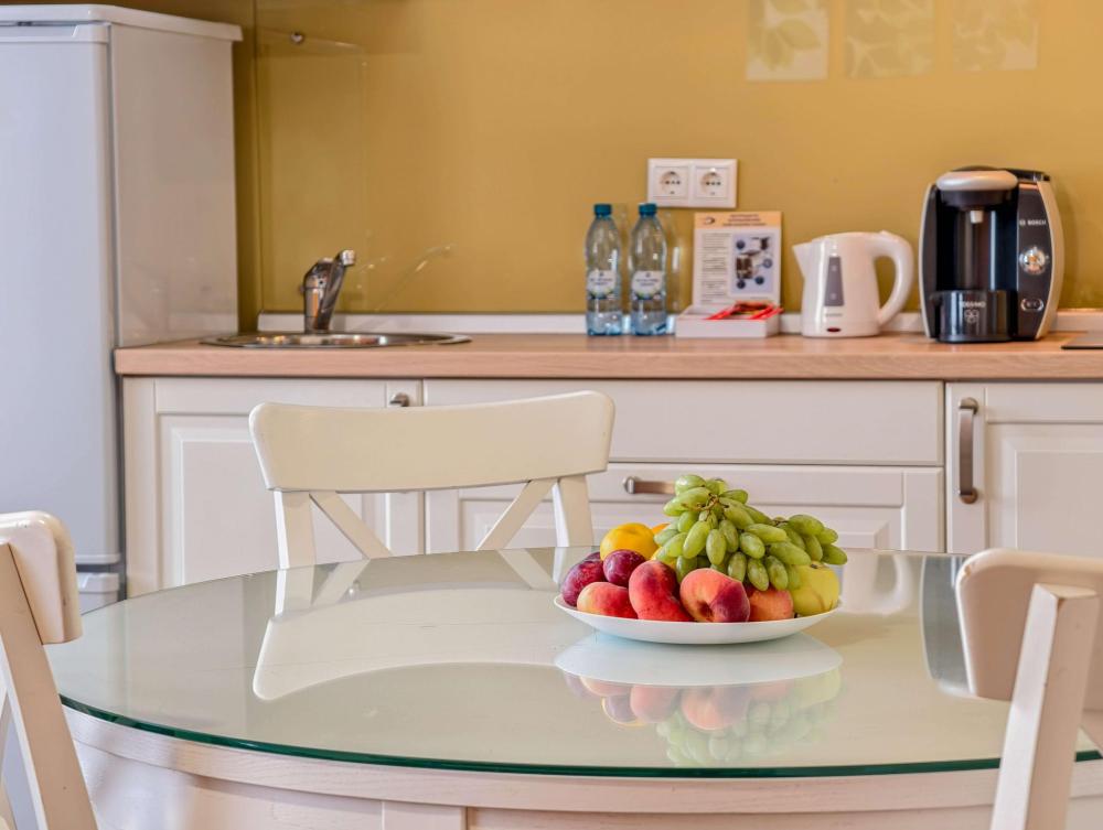 В номере: Двуспальная кровать, Мягкая мебель, Кондиционер, Холодильник, Кофемашина, Варочная панель, Микроволновая печь, Чайник, Оборудованная кухня.