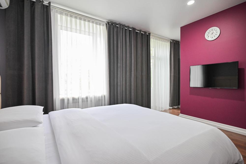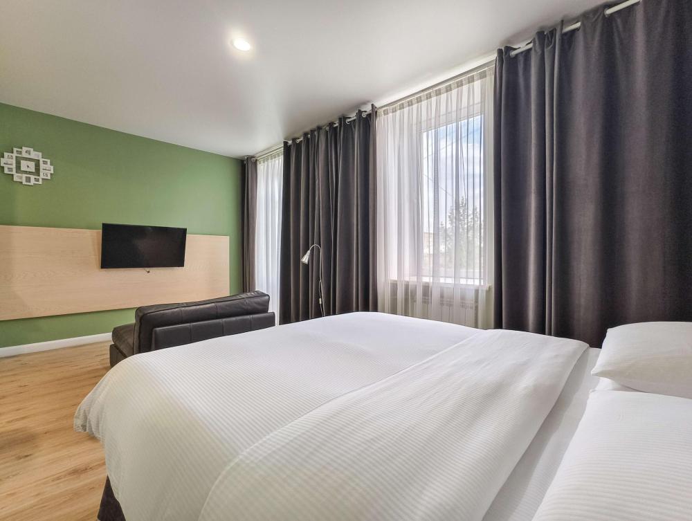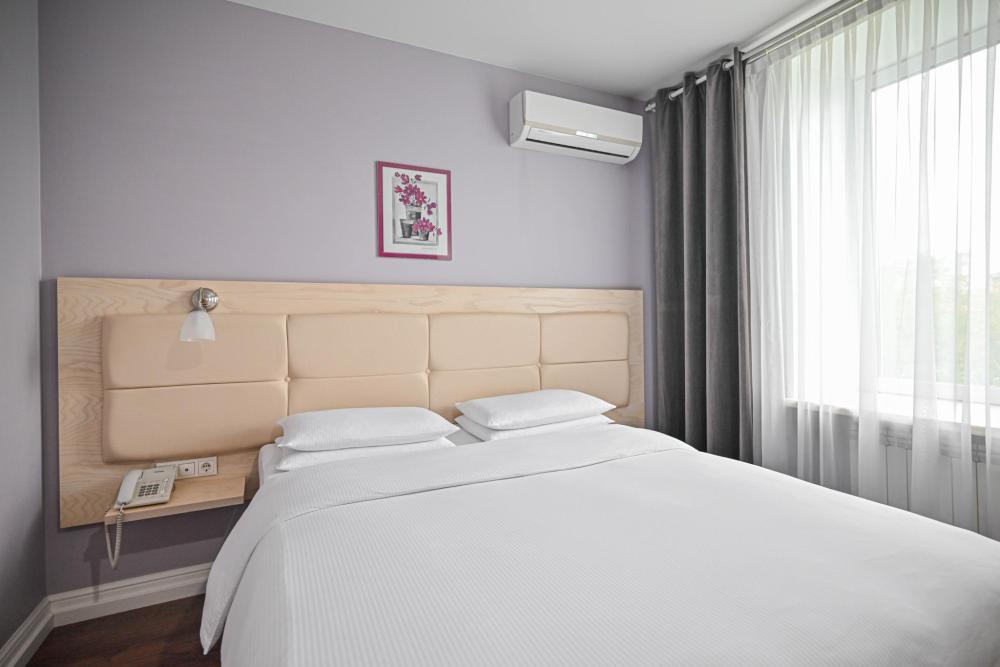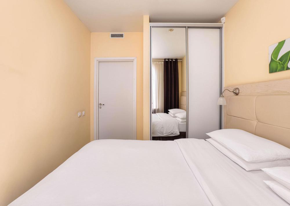 В номере: двуспальная кровать 160*200, Мини–холодильник, Чайник, Халаты и тапочки, Набор гостеприимства с чайными принадлежностями.