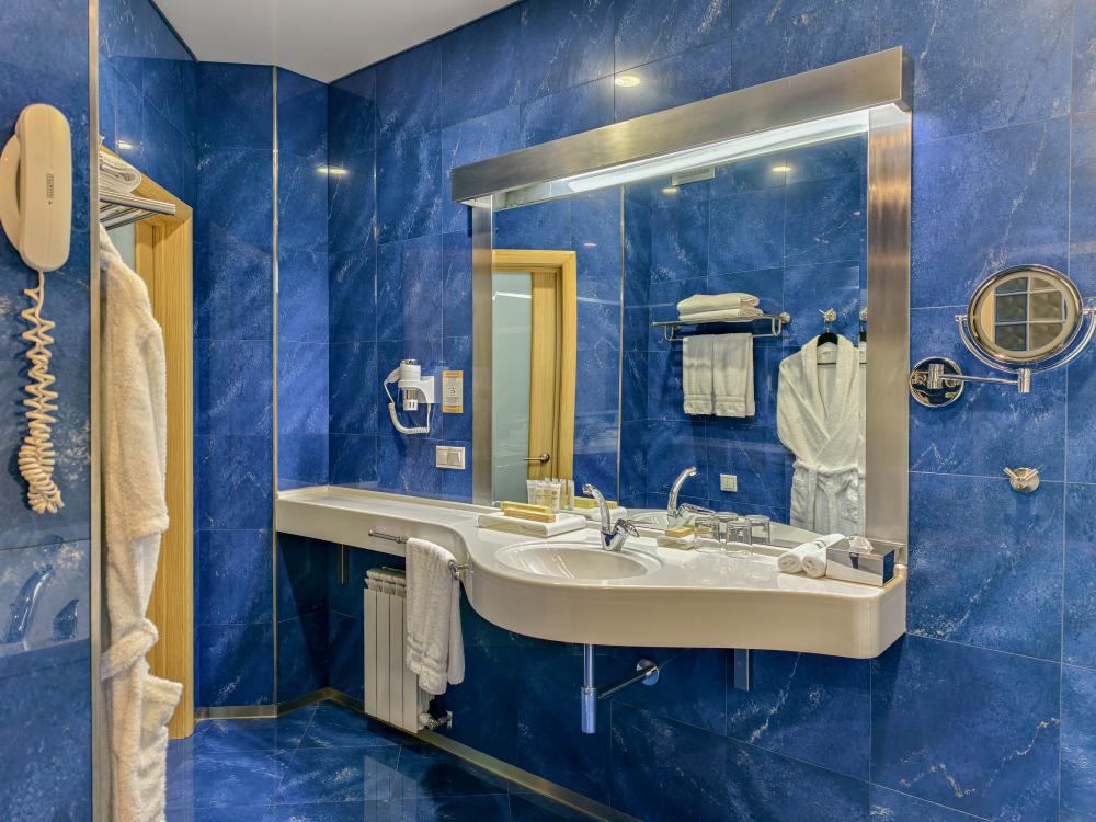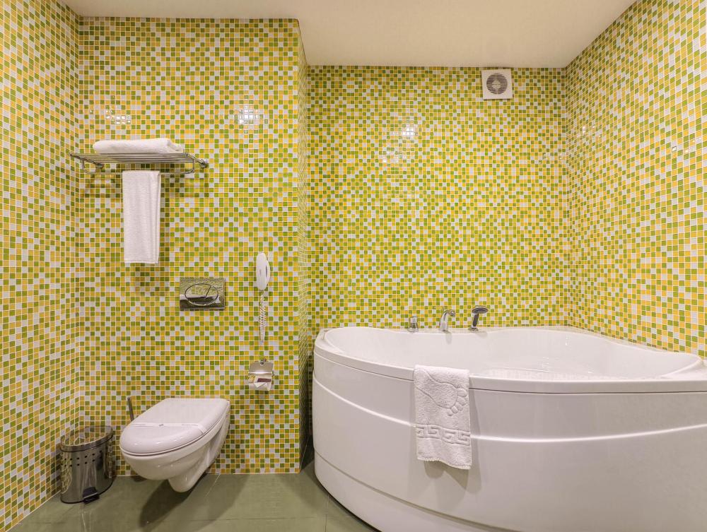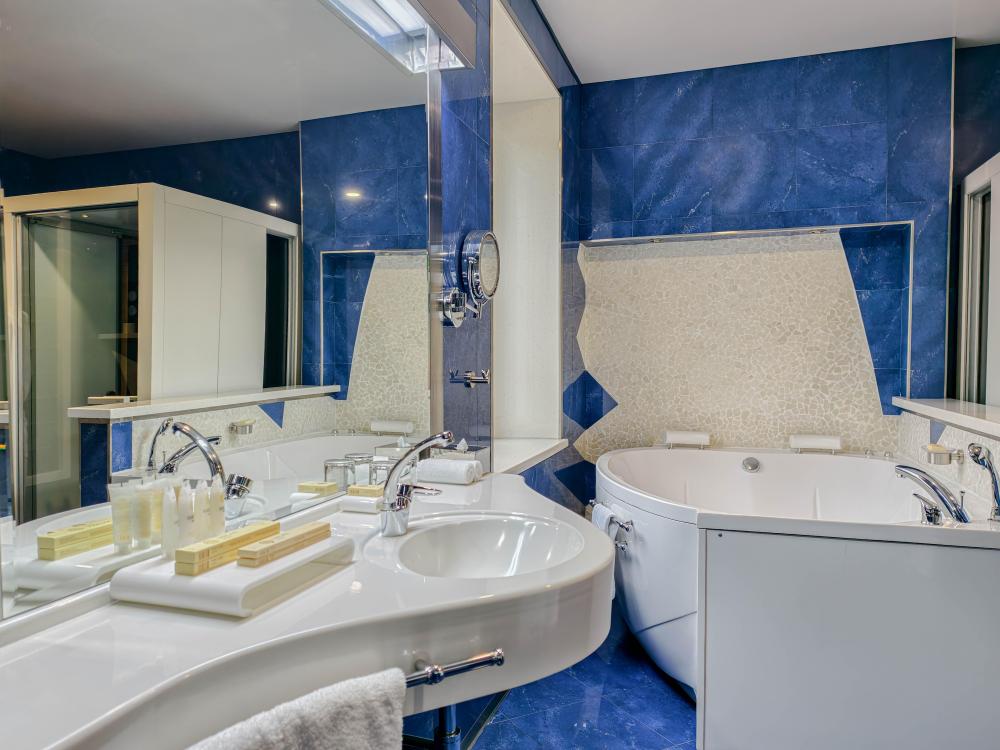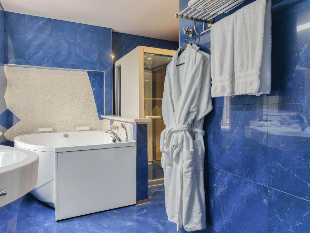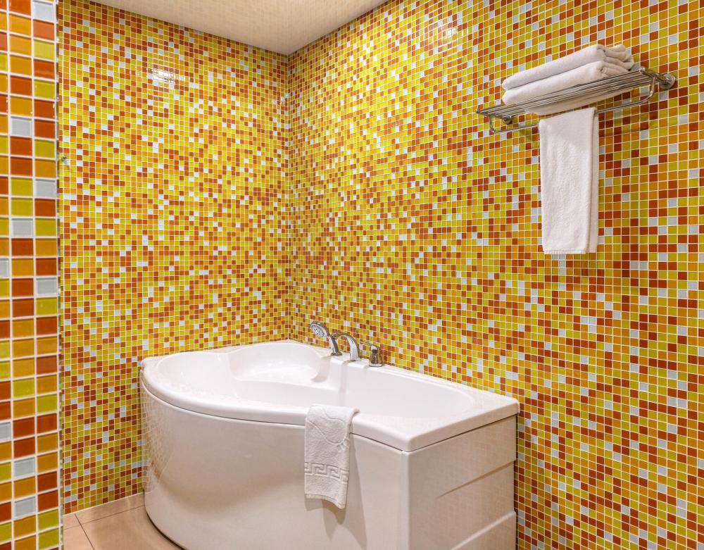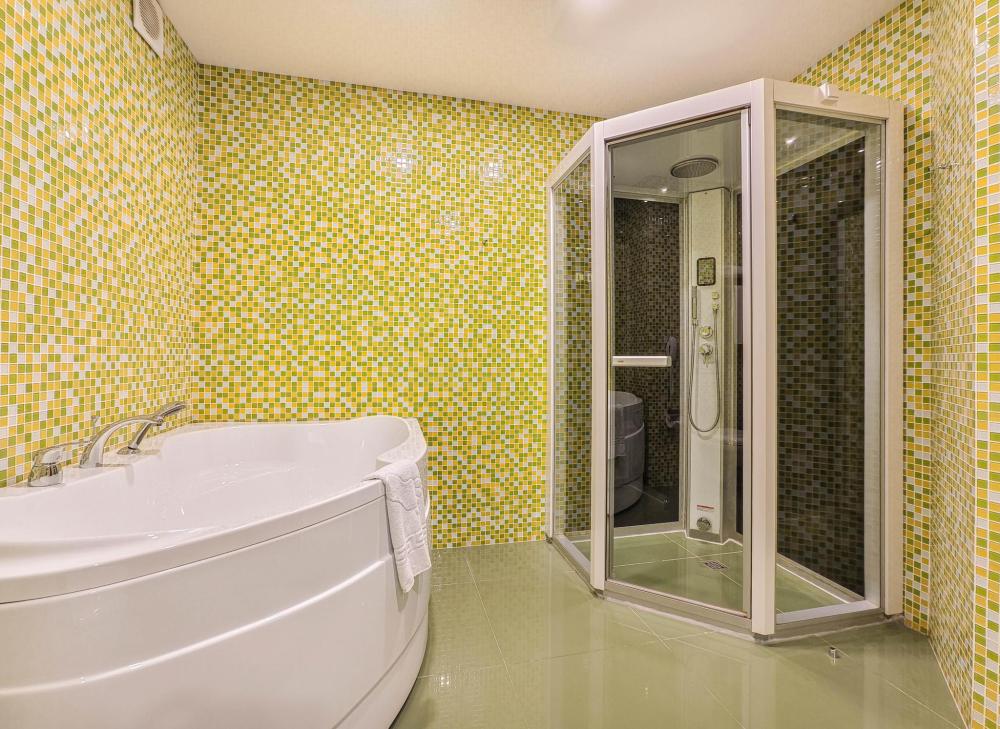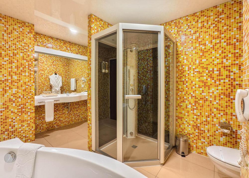 Превосходный двухкомнатный номер площадью 80 кв.м. для настоящих ценителей комфорта и домашнего уюта. Площадь ванной комнаты составляет 15 кв.м. В комплектацию входит угловая ванная с гидромассажем, сауна для 2 человек, полноценный набор предметов индивидуального пользования, халаты и тапочки.