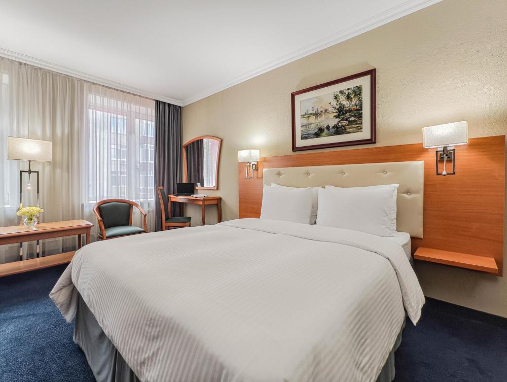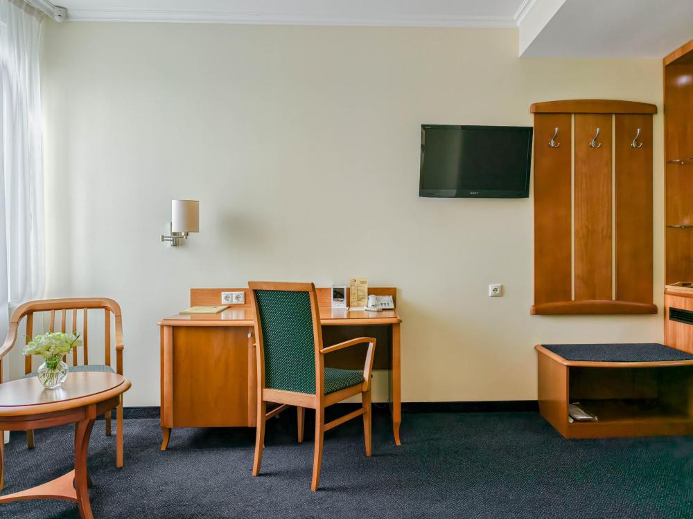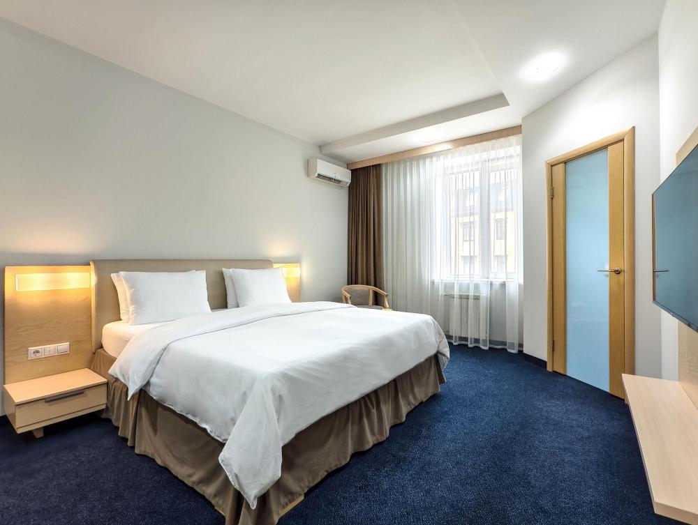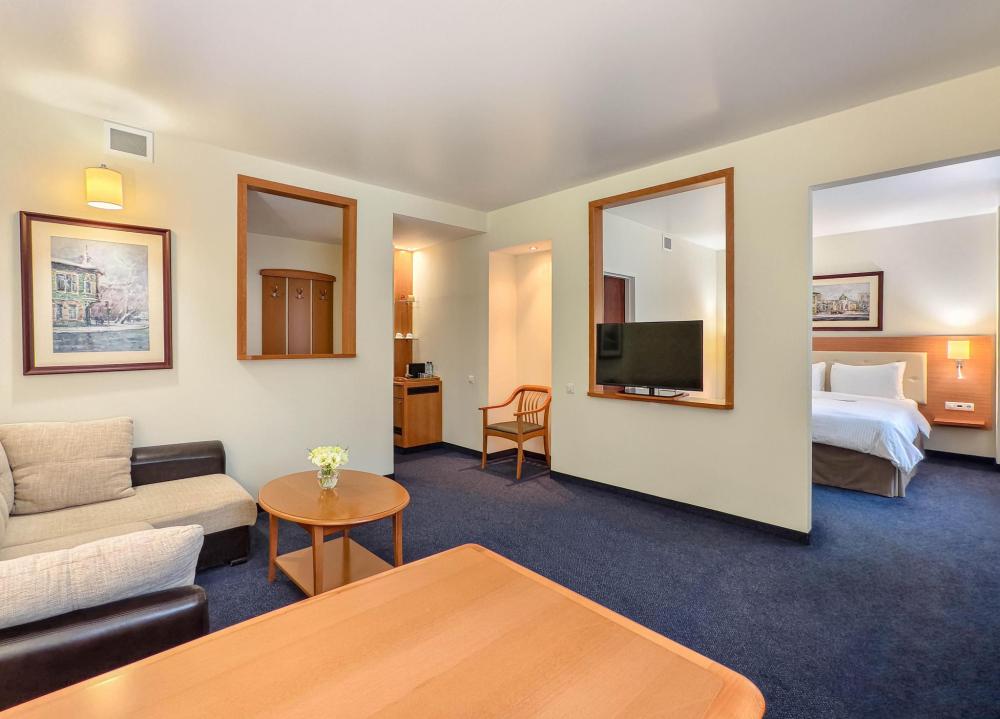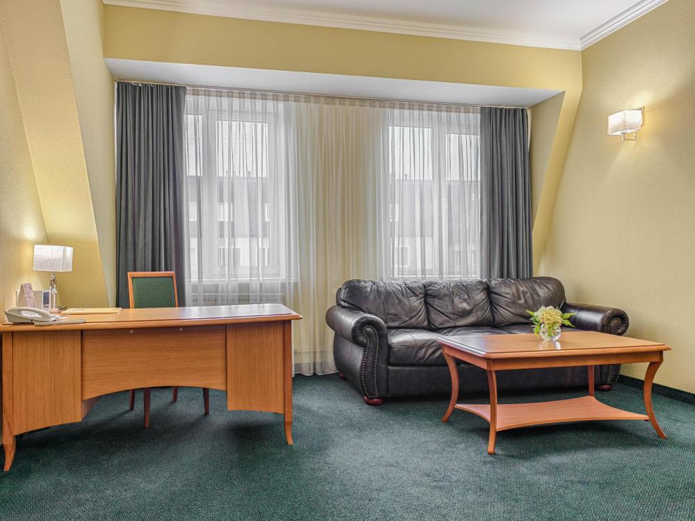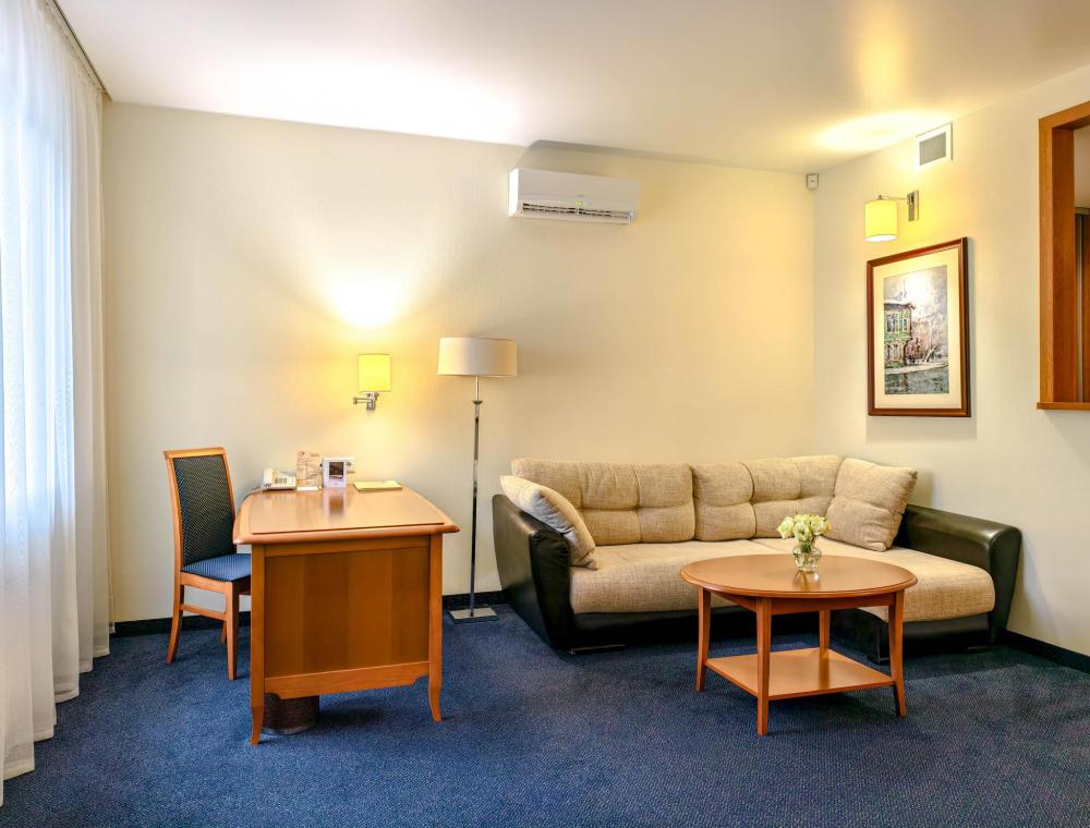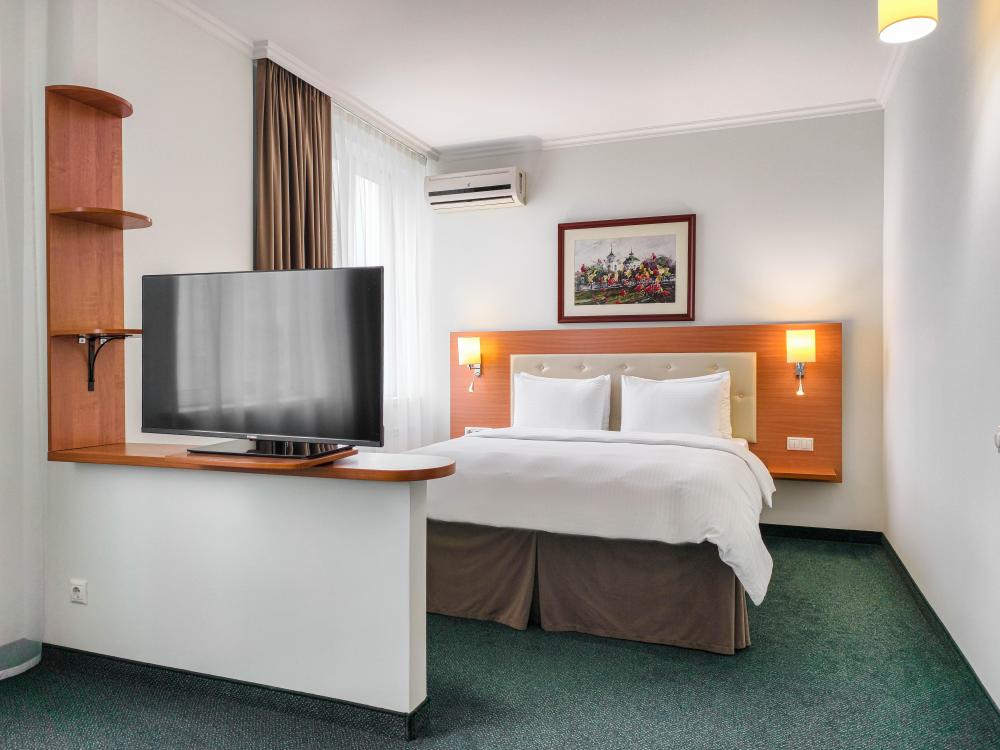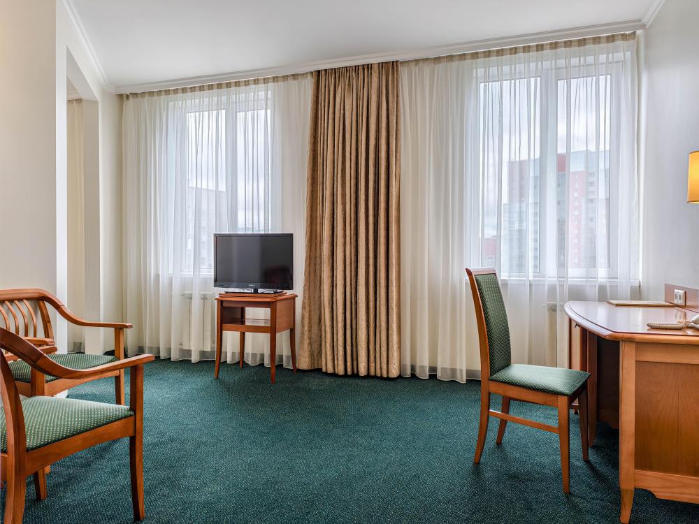 Превосходный номер площадью от 50 до 60 м2. Номер поделён на 2 зоны для работы и отдыха. За удобным письменным столом работа станет лёгкой и непринуждённой. На большой кровати с антистрессовым матрасом Вы сможете отдохнуть после рабочего дня, посмотреть любимые телепередачи на широком экране.