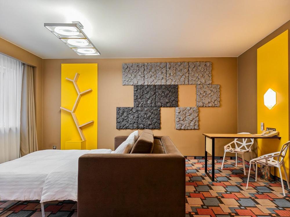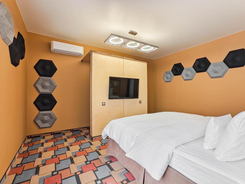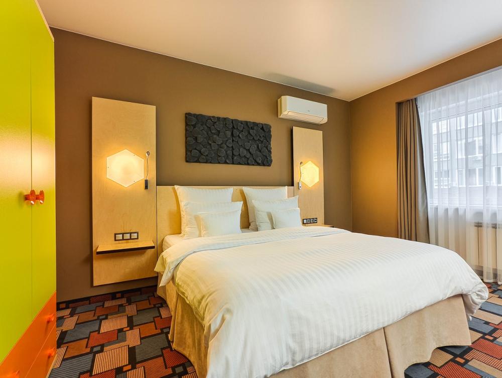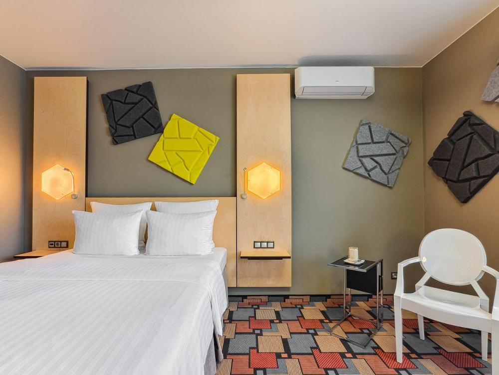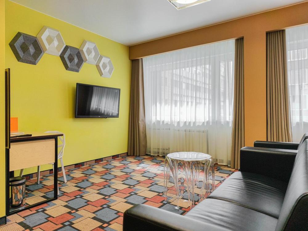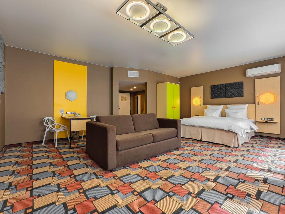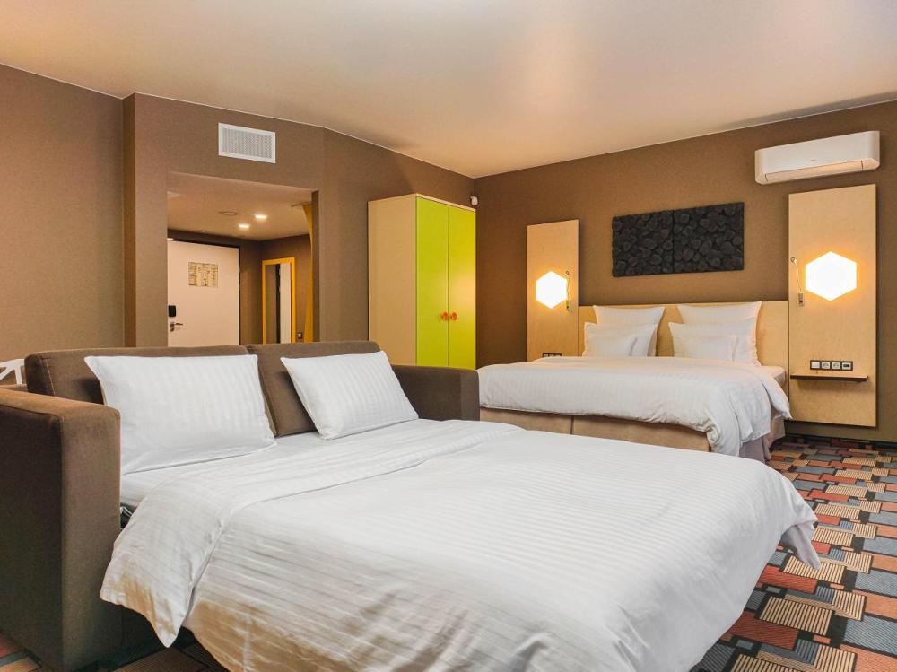 В номере: двуспальная кровать и диван-кровать, Индивидуальная вентиляция, Мини–холодильник, Мягкая мебель, Кондиционер, Двуспальная кровать, Чайник, Халаты и тапочки, Набор гостеприимства с чайными принадлежностями, Яркий стильный интерьер, Кабельное ТВ, TV диагональю 47, 42", Душевая кабина, Фен, Гостиничная парфюмерия.
