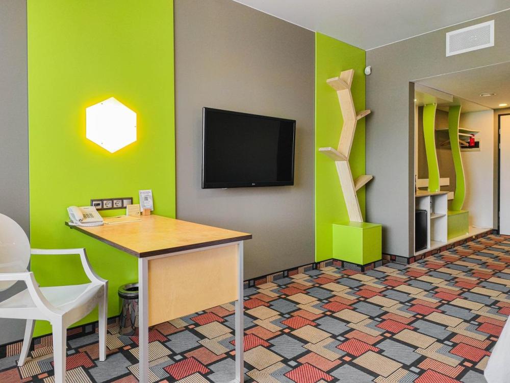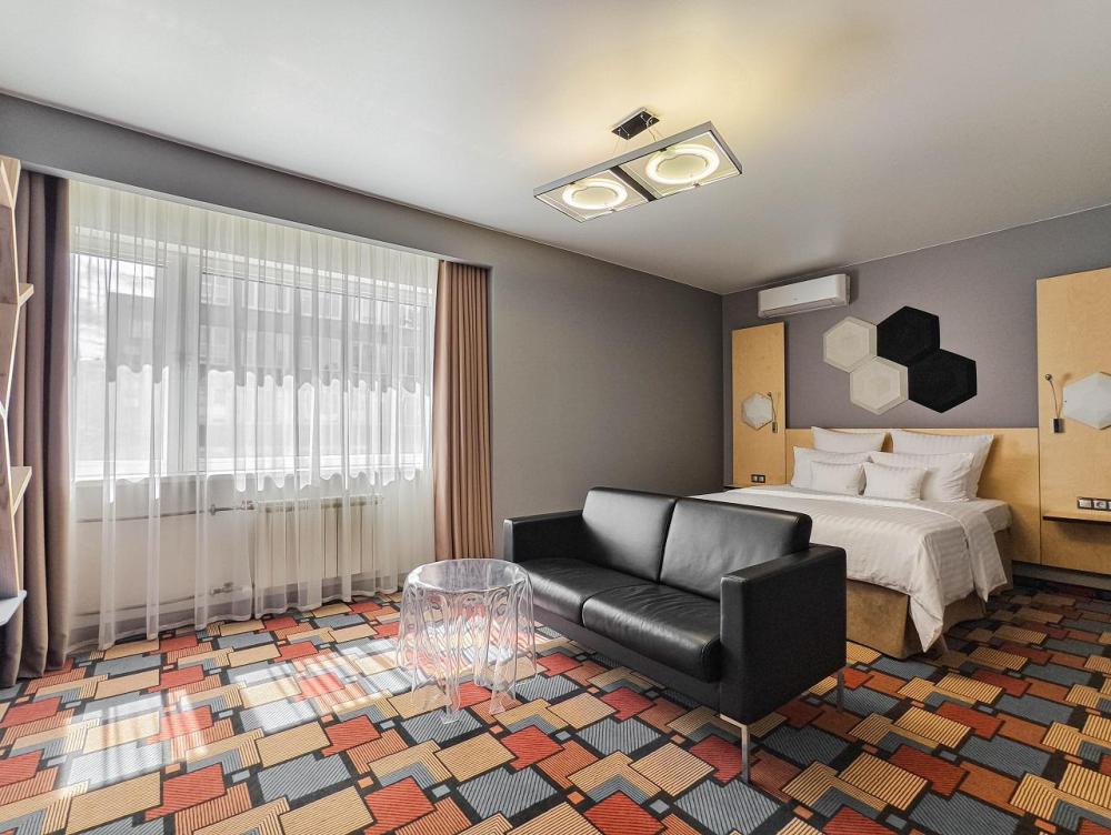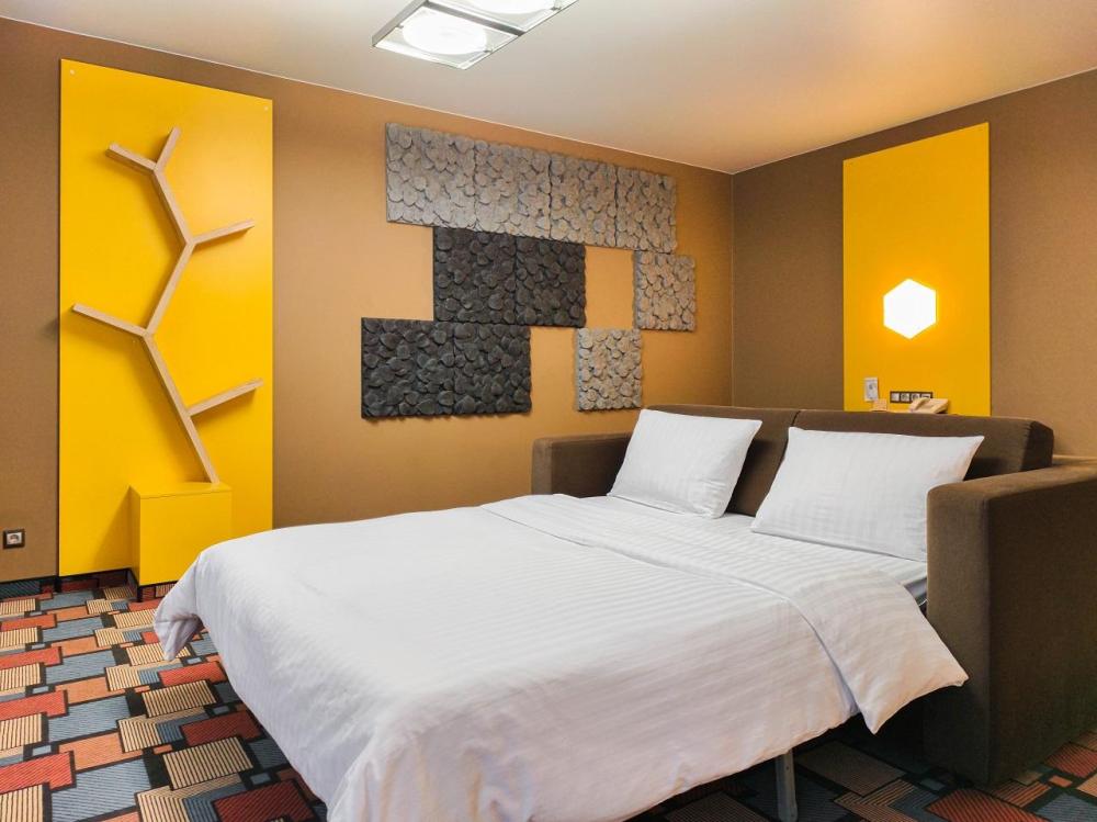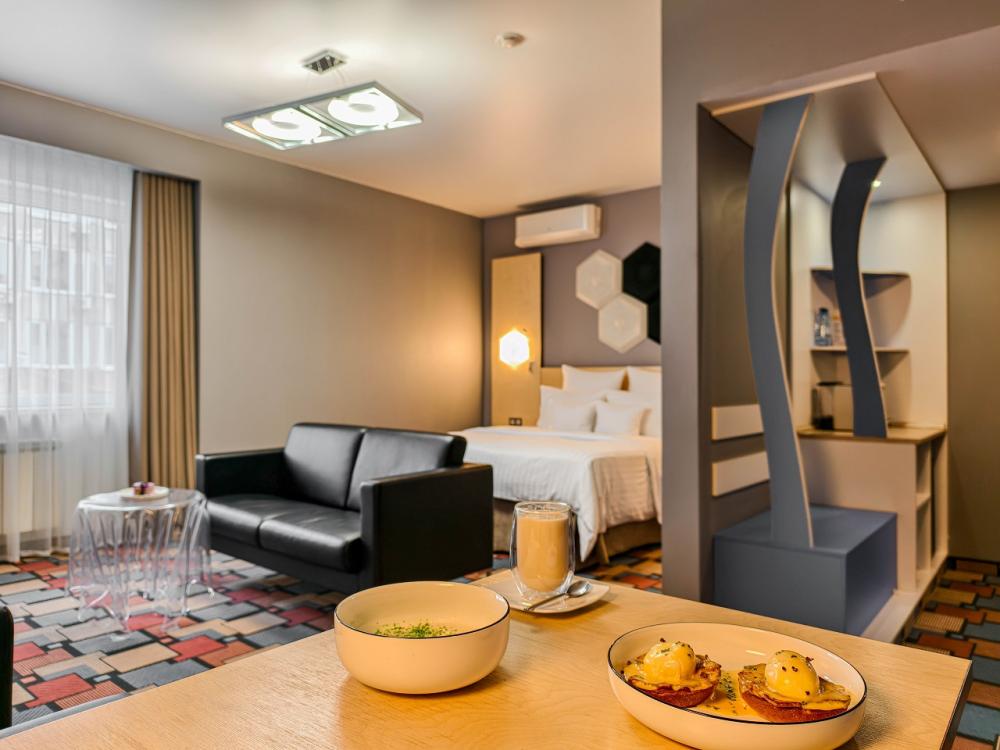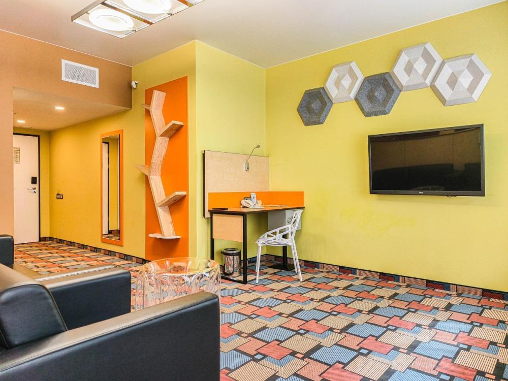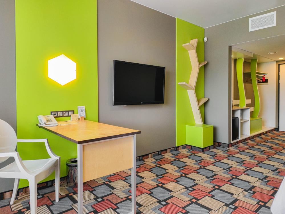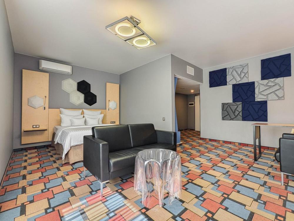 В номере: двуспальная кровать и диван-кровать, Индивидуальная вентиляция, Мини–холодильник, Мягкая мебель, Кондиционер, Двуспальная кровать, Чайник, Халаты и тапочки, Набор гостеприимства с чайными принадлежностями, Яркий стильный интерьер, Кабельное ТВ, TV диагональю 47, 42", Душевая кабина, Фен, Гостиничная парфюмерия.