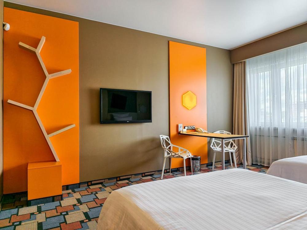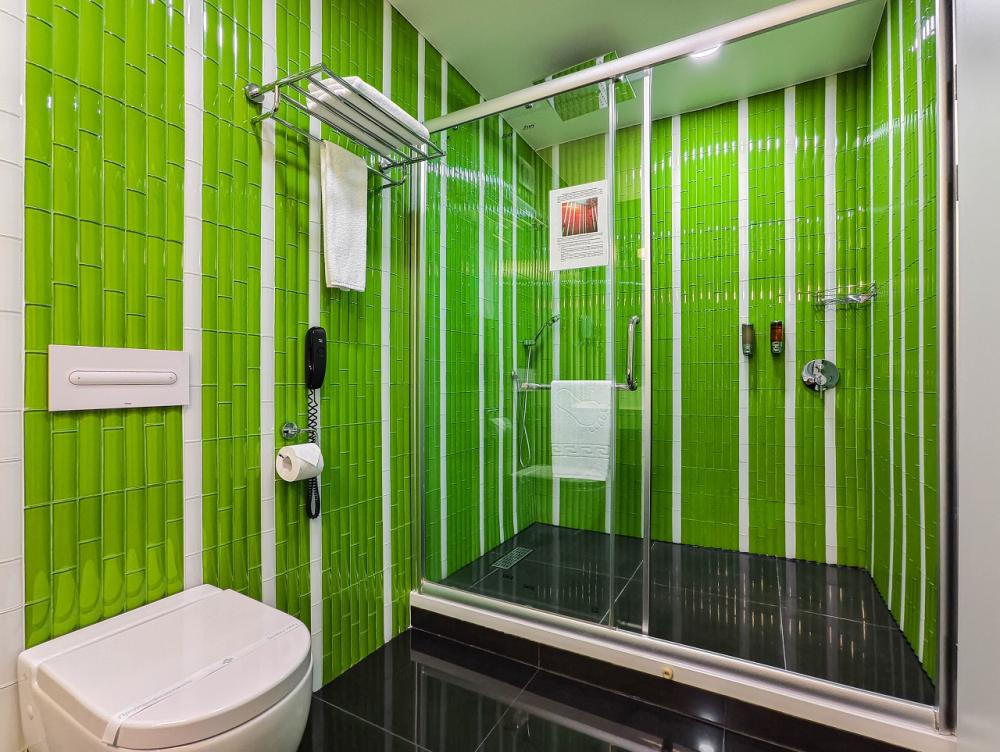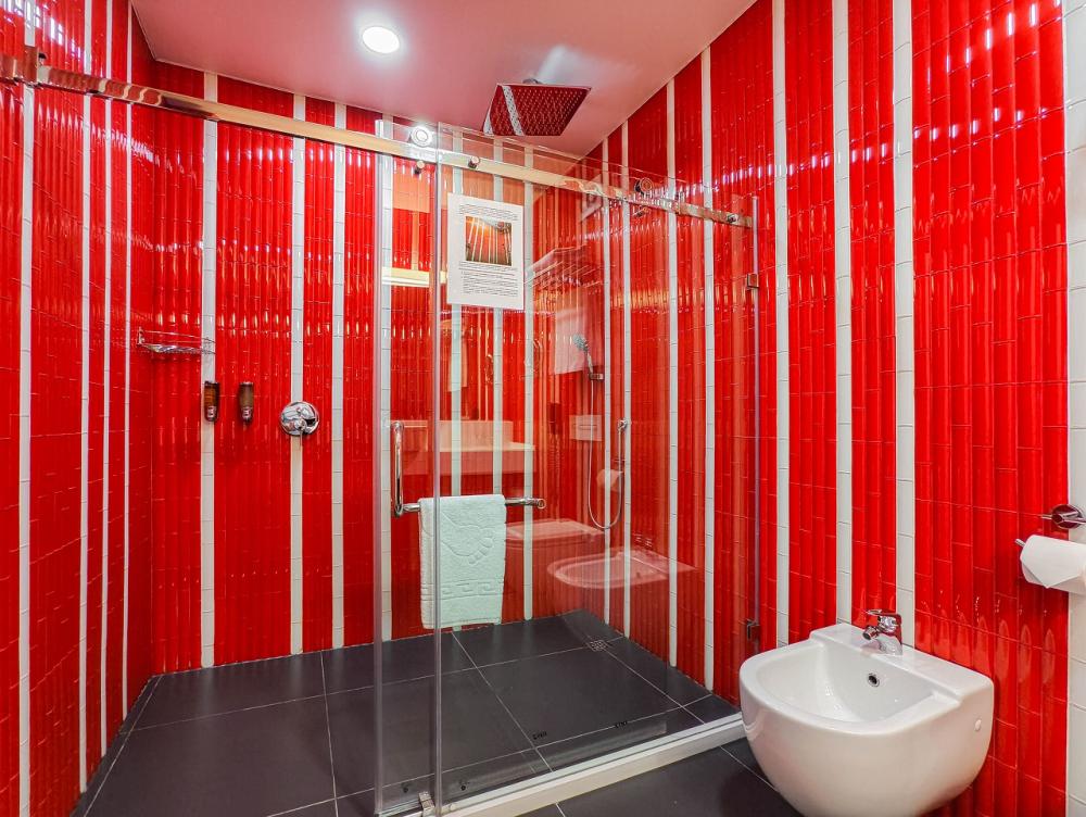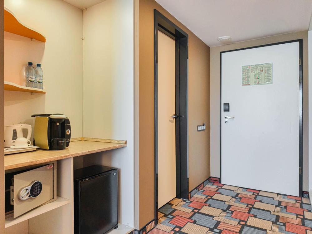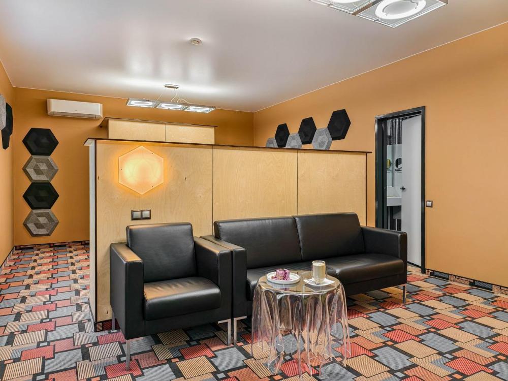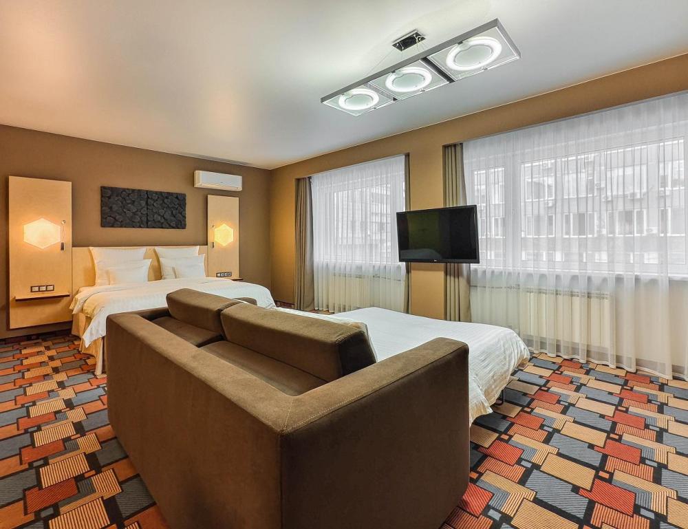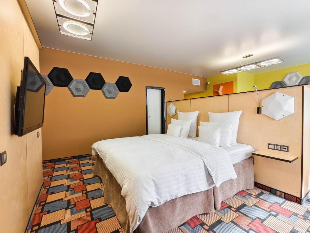 В номере: двуспальная кровать и диван-кровать, Индивидуальная вентиляция, Мини–холодильник, Мягкая мебель, Кондиционер, Двуспальная кровать, Чайник, Халаты и тапочки, Набор гостеприимства с чайными принадлежностями, Яркий стильный интерьер, Кабельное ТВ, TV диагональю 47, 42", Душевая кабина, Фен, Гостиничная парфюмерия.