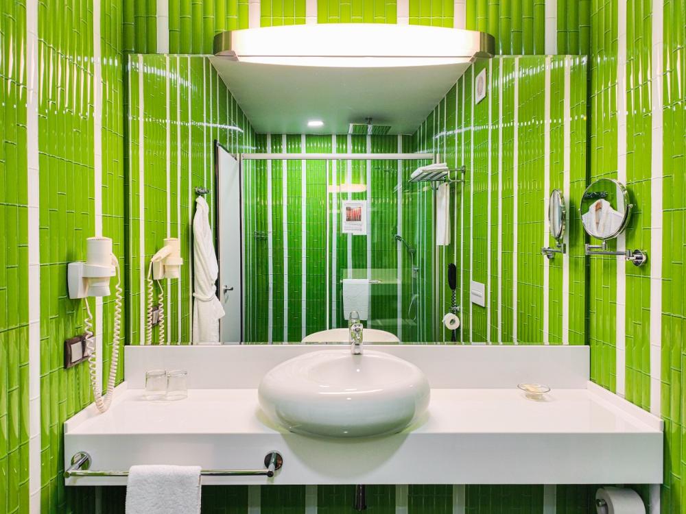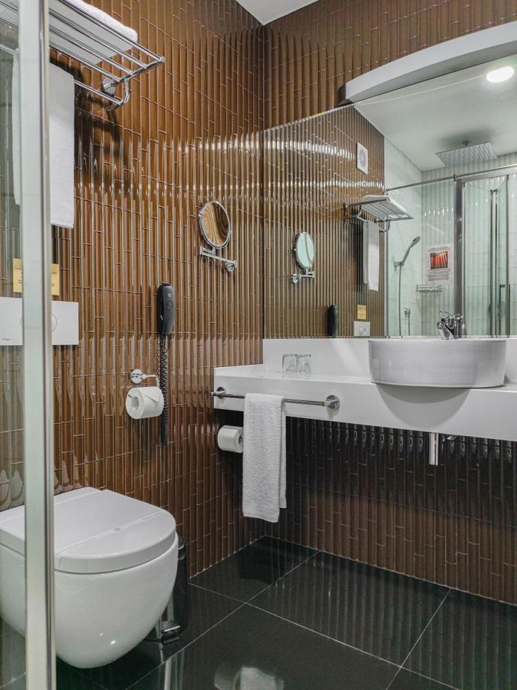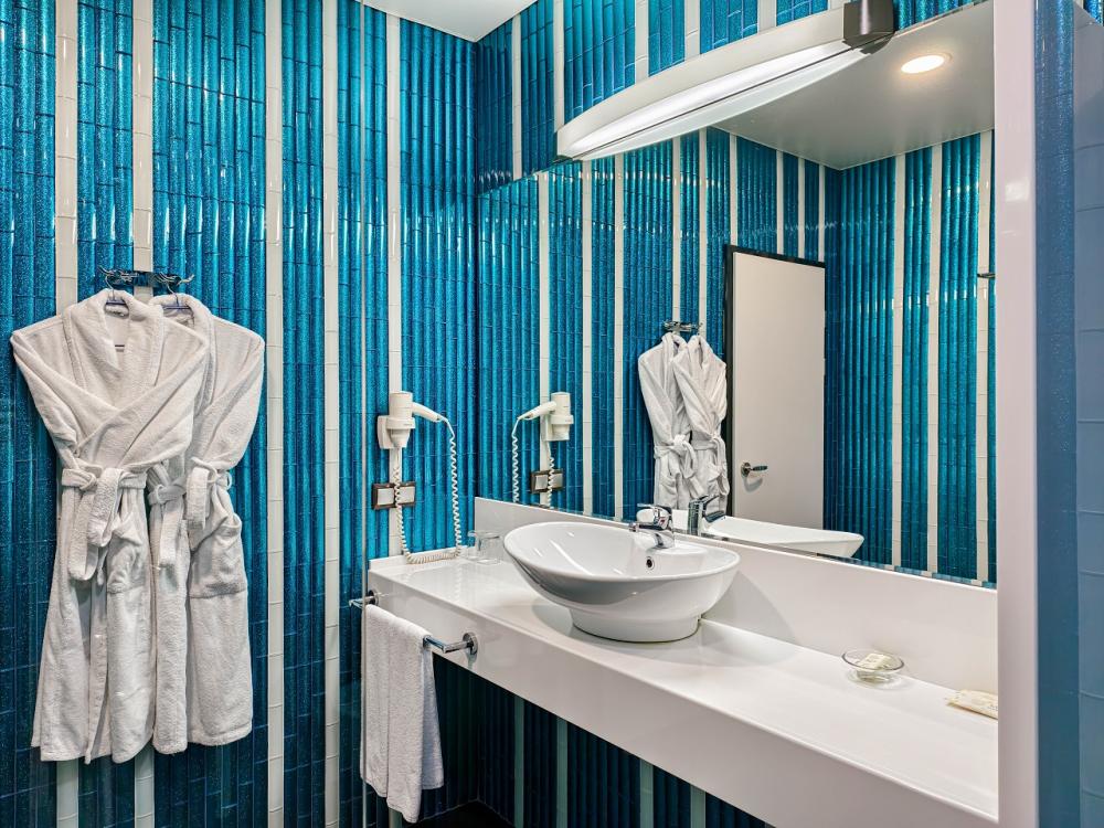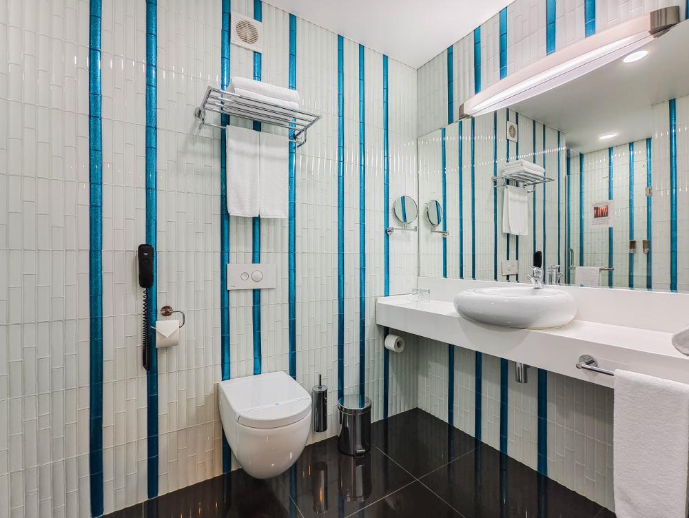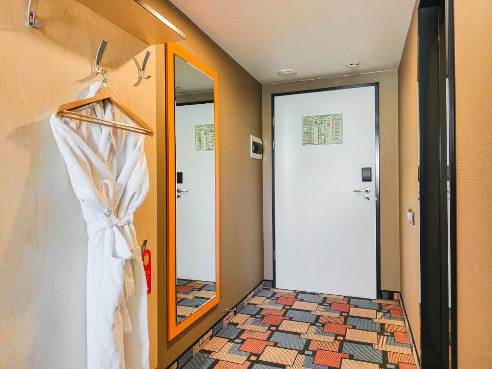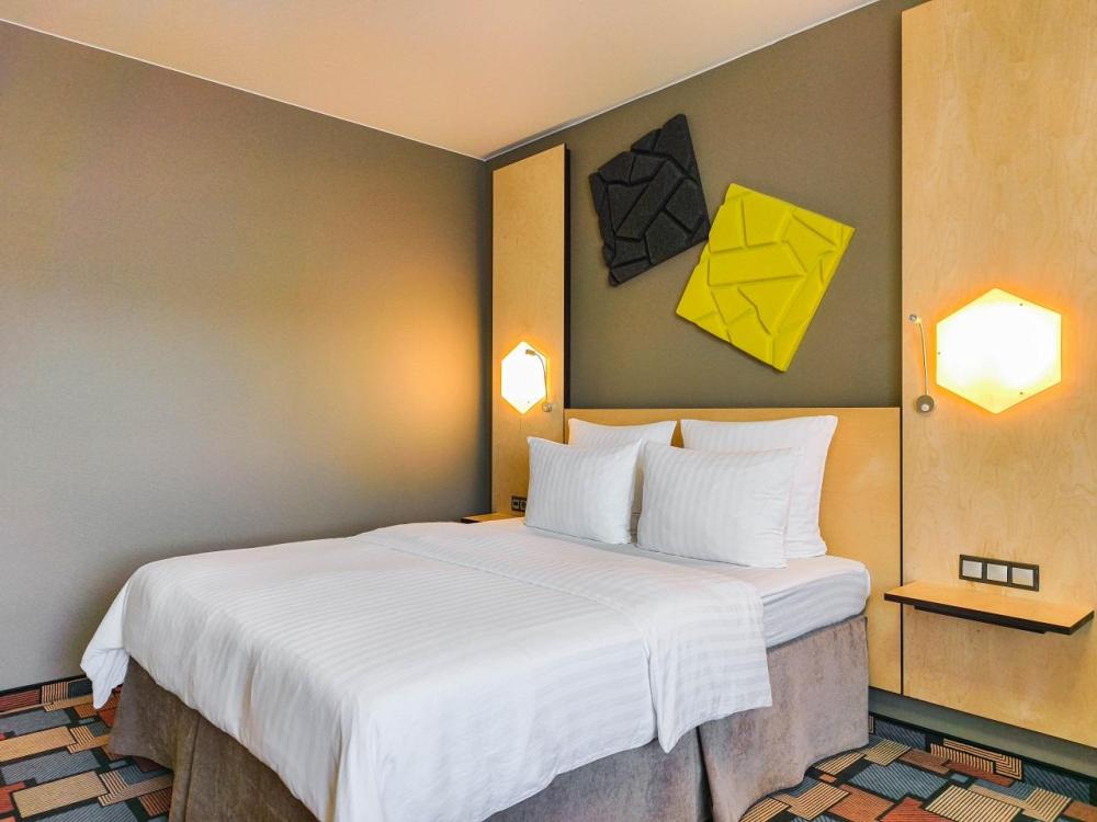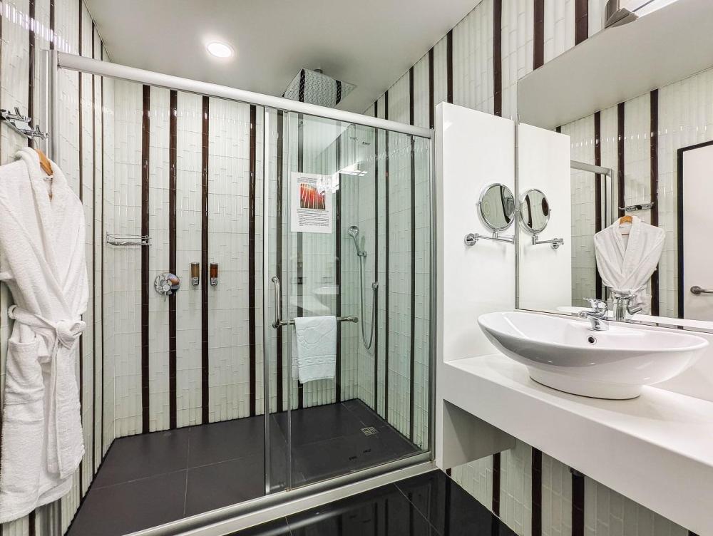 В номере: двуспальная кровать и диван-кровать, Индивидуальная вентиляция, Мини–холодильник, Мягкая мебель, Кондиционер, Двуспальная кровать, Чайник, Халаты и тапочки, Набор гостеприимства с чайными принадлежностями, Яркий стильный интерьер, Кабельное ТВ, TV диагональю 47, 42", Душевая кабина, Фен, Гостиничная парфюмерия.
