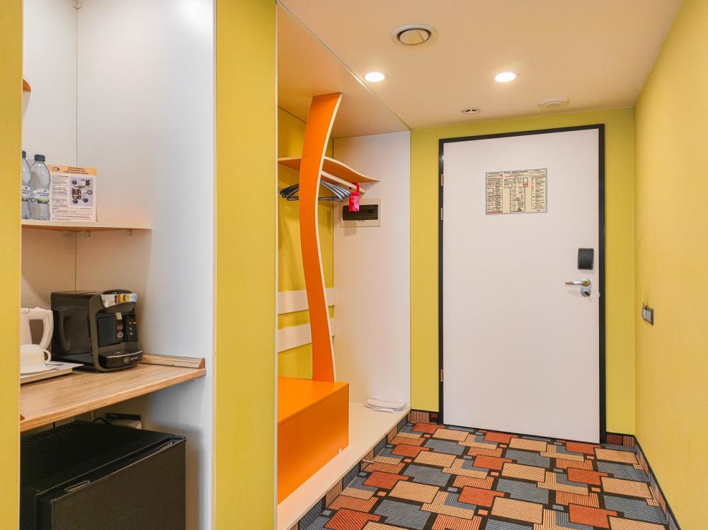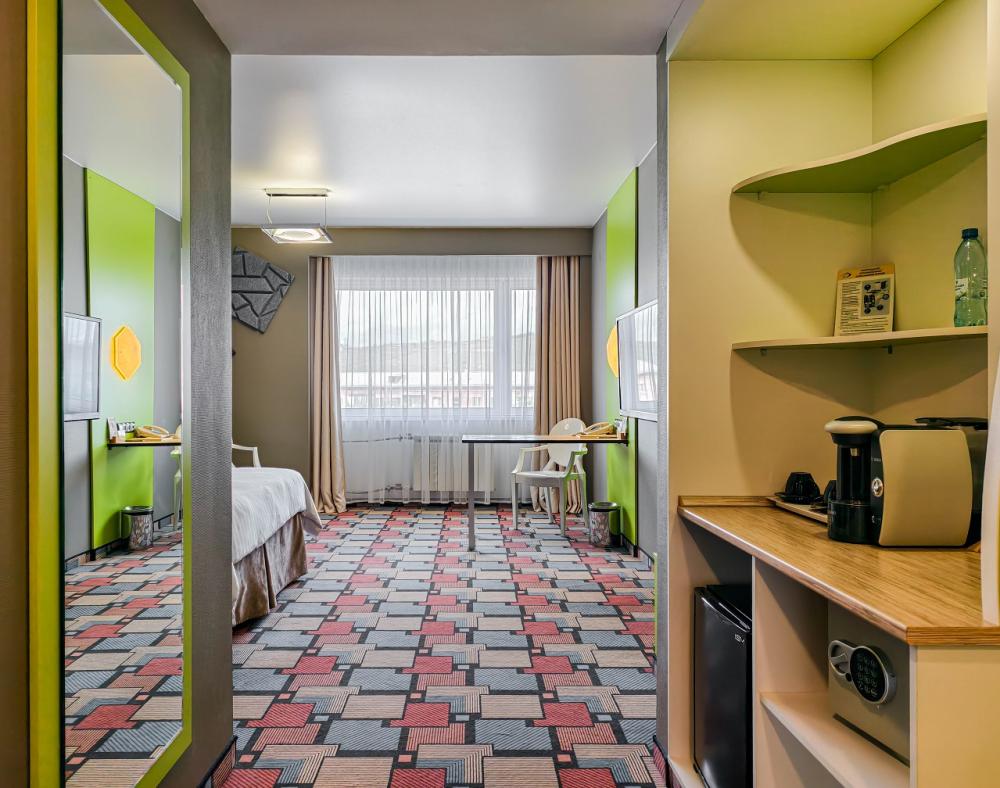 Очень уютный однокомнатный номер, площадью 23 м2, идеальный вариант для одноместного проживания по демократичной цене. В стоимость входит: мини-холодильник, сейф, набор гостеприимства с чайными принадлежностями, фен, гостиничная парфюмерия (гель для душа, шампунь, мыло), халат, тапочки, интернет.
