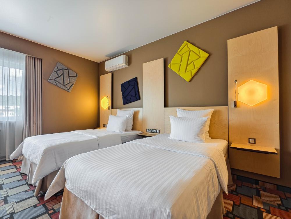 Посторный однокомнатный номер, площадью33 м2, с двумя кроватями (120*200). Отличный выбор при двухместном размещении. В стоимость входит: мини-холодильник, сейф, набор гостеприимства с чайными принадлежностями, фен, гостиничная парфюмерия (гель для душа, шампунь, мыло), халат, тапочки, интернет.