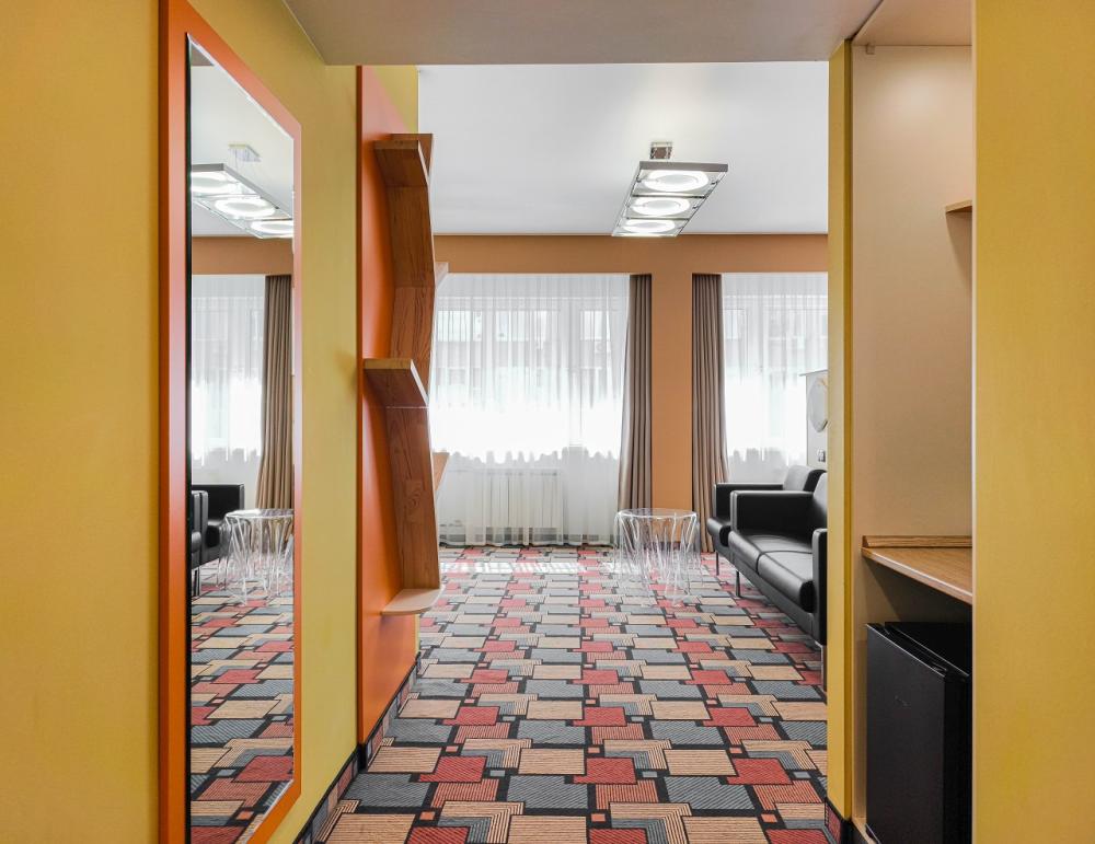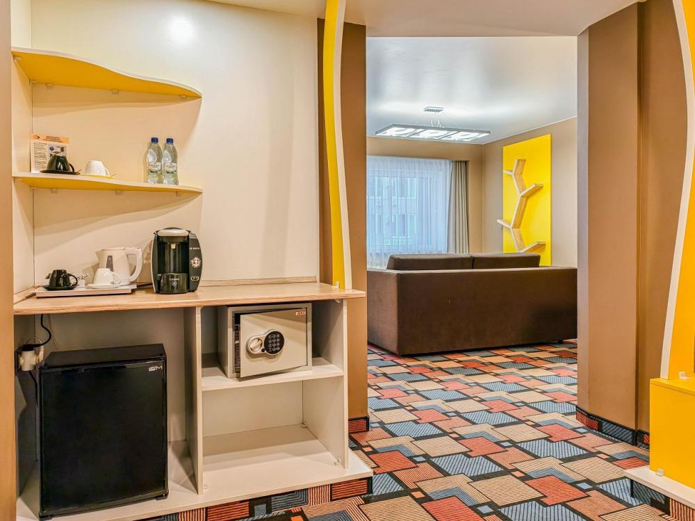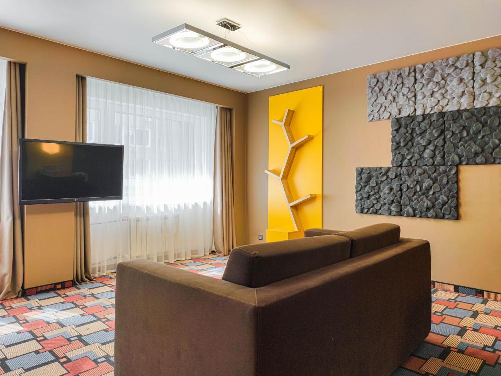 Превосходный двухкомнатный номер, площадь 50м2, с большой двуспальной кроватью (180*200), двумя ТВ, кофемашиной и мягкой мебелью. Для настоящих ценителей комфорта. В стоимость входит: мини-холодильник, сейф, набор гостеприимства с чайными принадлежностями, фен, гостиничная парфюмерия (гель для душа, шампунь, мыло), халат, тапочки, интернет.