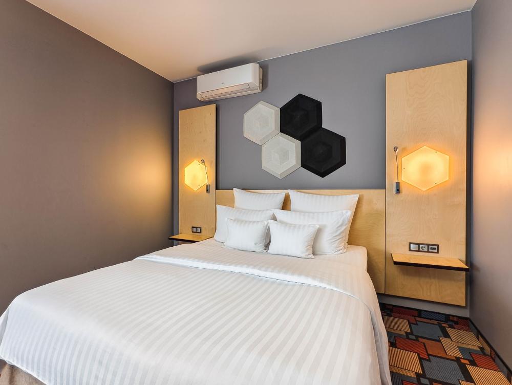 Комфортабельный однокомнатный номер, площадью 33 м2, с двуспальной кроватью (160*200). Рассчитан на проживание 1-2 человек. В стоимость входит: мини-холодильник, сейф, набор гостеприимства с чайными принадлежностями, фен, гостиничная парфюмерия (гель для душа, шампунь, мыло), халат, тапочки, интернет.