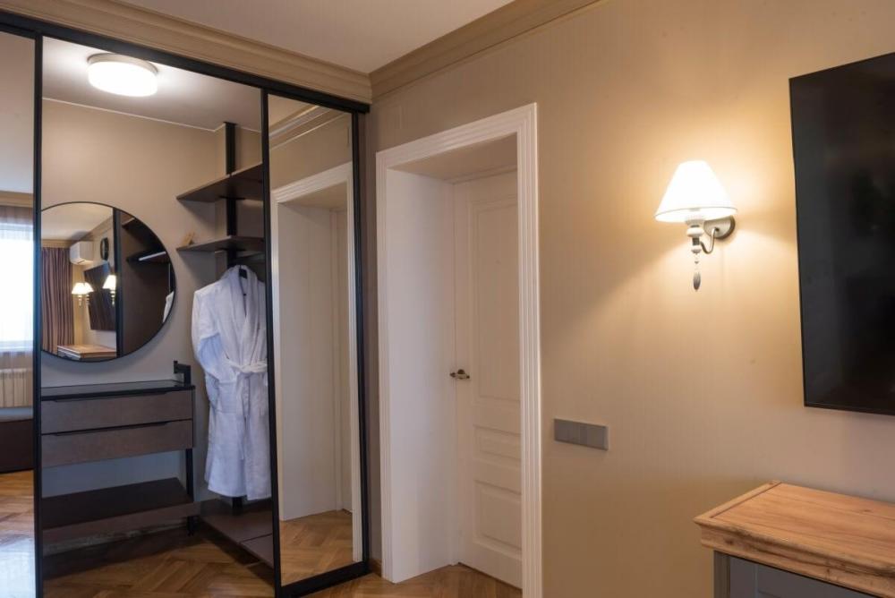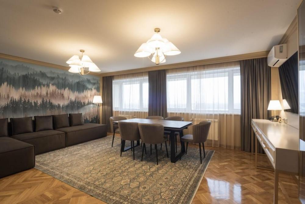 Просторный однокомнатный или двухкомнатный номер, площадью 36 кв.м., разграниченный на гостиную, кабинет и зону отдыха с двуспальной кроватью и мягкой мебелью. Идеально подходит как для размещения семьи так и для комфортного отдыха одного человека. Оборудование номера: кровать с ортопедическим матрасом размером 1600х2000; 32" плазменная панель; холодильник (наполнение мини-бара по требованию гостя); сейф; телефон с выходом на междугороднюю и международную связь; кондиционер; бесплатный Интернет по технологии Wi-Fi; электронный замок; светонепроницаемые шторы blackout; электрочайник, кружка, чай и кофе в пакетиках, сахар, сливки; махровый халат; тапочки махровые; губка и лопатка для обуви, щетка для одежды. Оснащение санузла: 3 махровых полотенца; коврик для ног; шампунь; гель для душа; мыло; шапочка для душа; зубная щетка и паста; расческа; лосьон для тела; фен.