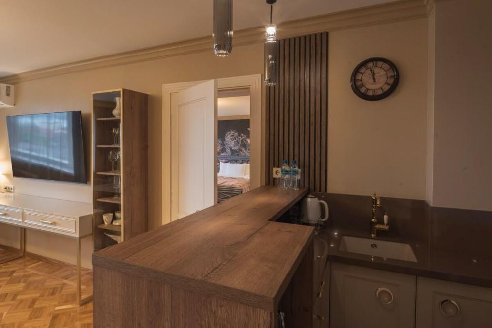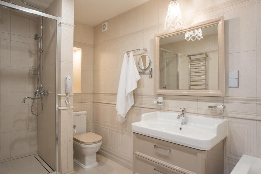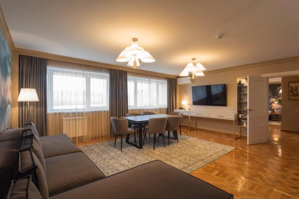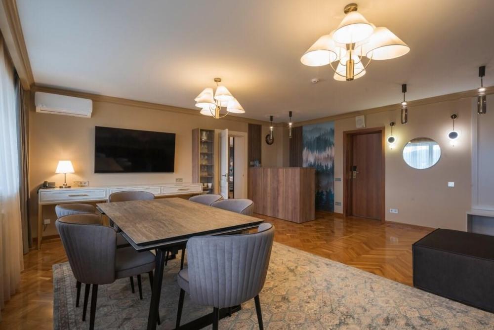 Три двухкомнатных номера площадью 61 кв.м., состоящих из гостиной и просторной спальни с двуспальной кроватью. В номерах имеется небольшая кухня, обеденная группа и мягкая мебель, что делает гостиную уютным пространством для встреч с гостями. Оборудование номера: кровать с ортопедическим матрасом размером 1600х2000; 32" плазменная панель; холодильник (наполнение мини-бара по требованию гостя); сейф; телефон с выходом на междугороднюю и международную связь; кондиционер; бесплатный Интернет по технологии Wi-Fi; электронный замок; светонепроницаемые шторы blackout; электрочайник, кружка, чай и кофе в пакетиках, сахар, сливки; махровый халат; тапочки махровые; губка и лопатка для обуви, щетка для одежды. Оснащение санузла: 3 махровых полотенца; коврик для ног; шампунь; гель для душа; мыло; шапочка для душа; зубная щетка и паста; расческа; лосьон для тела; фен.