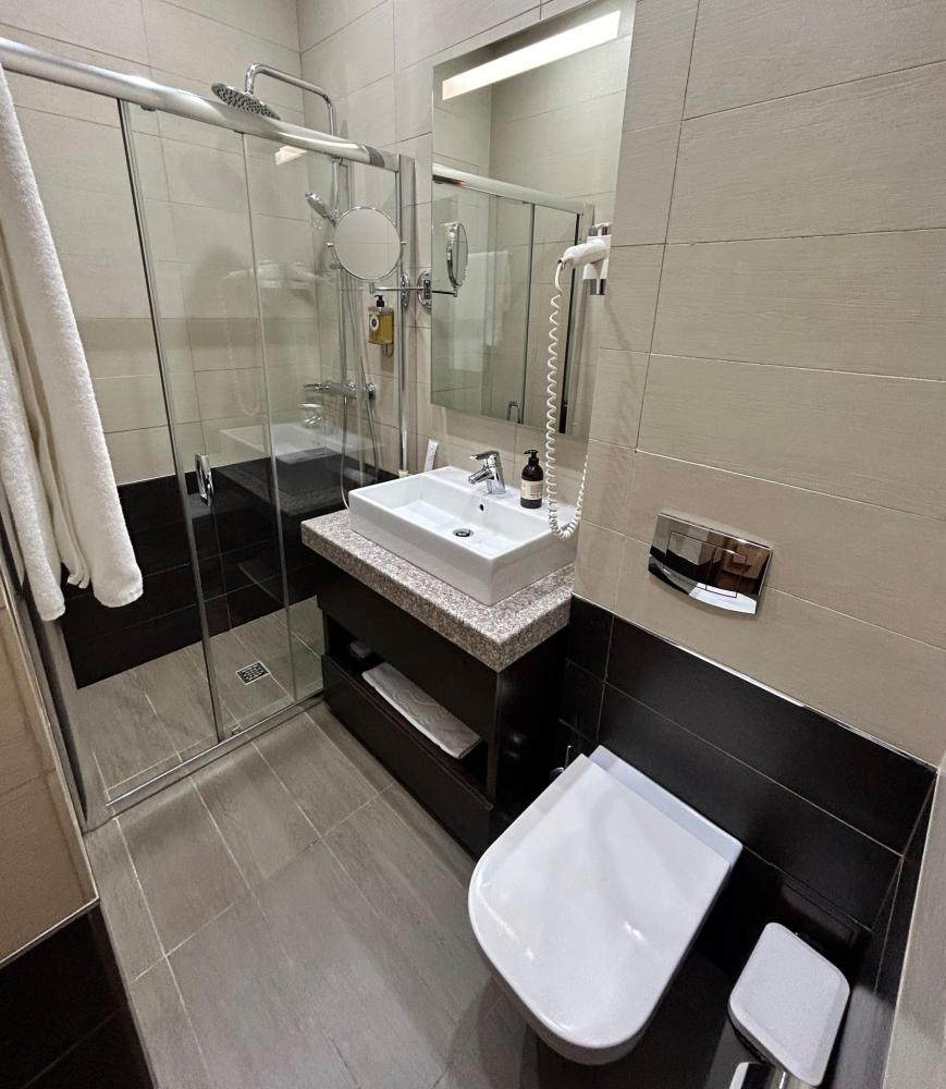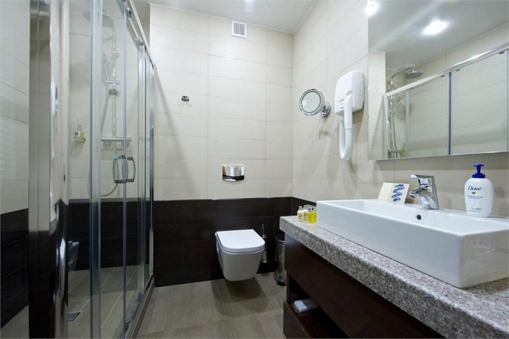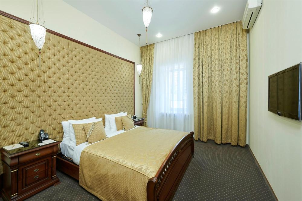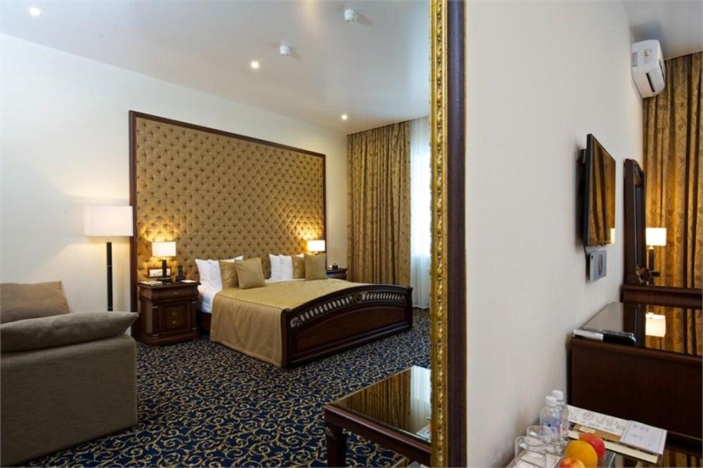 Площадь номера: 26м2 В номере: двуспальная кровать, плазменный теле визир, тумбочка, мини-бар, радиотелефон, CD магнитола, сейф, кондиционер, подогрев пола, холодильник, фен, махровые халаты, тапочки, санузел.