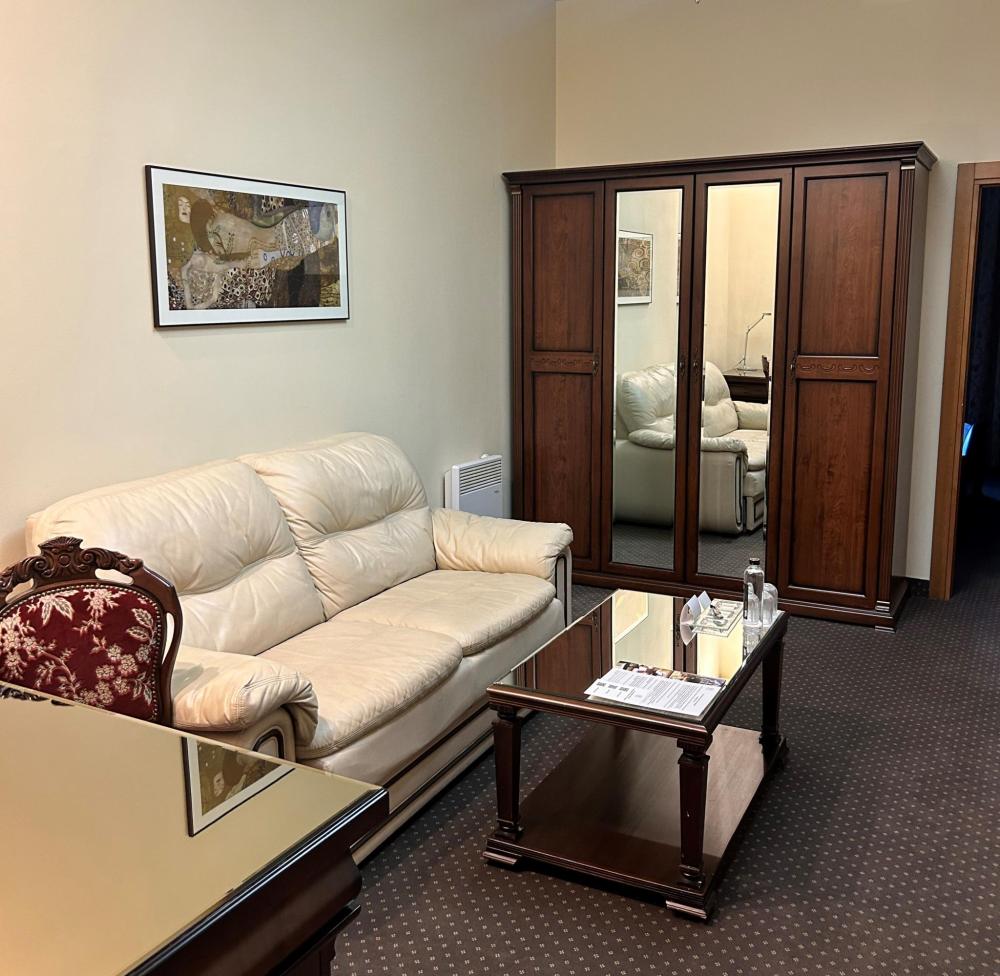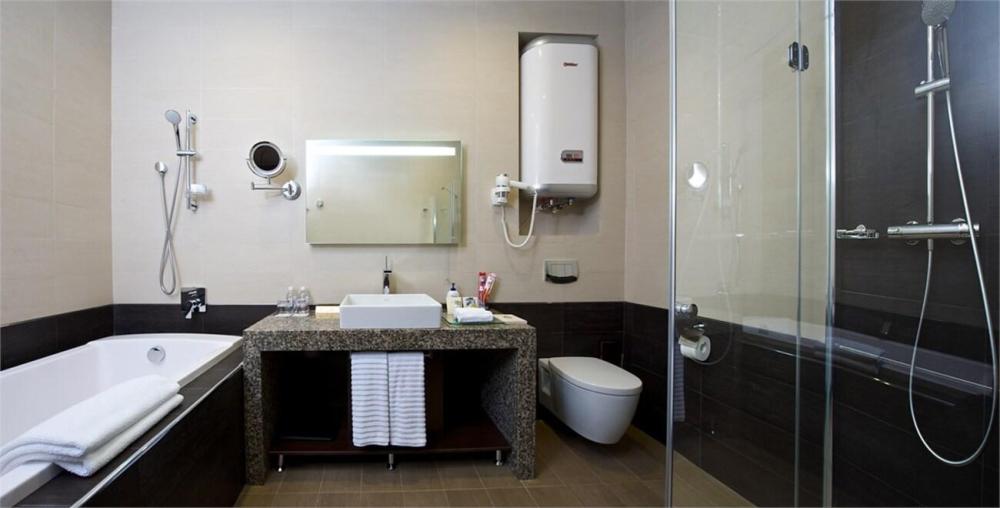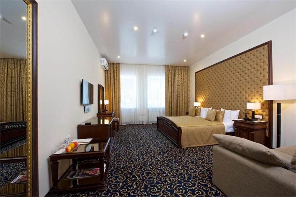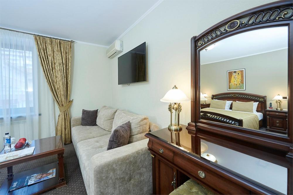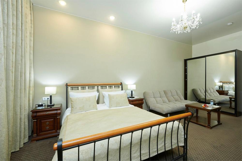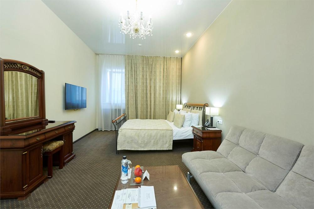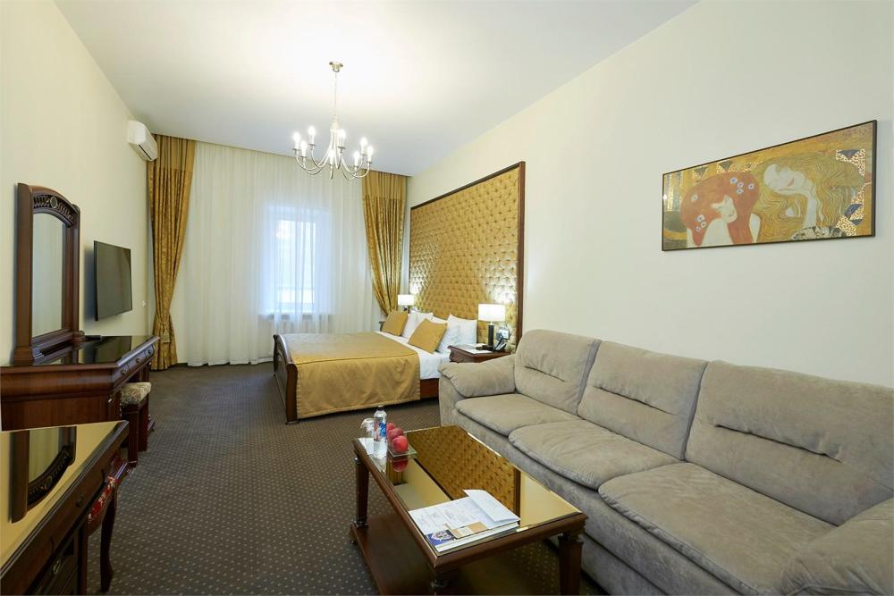 Площадь номера: 40м2 В номере: двуспальная кровать, прикроватная тумбочка, мягкий диван, телевизор, мини-бар, радиотелефон, CD магнитола, сейф, кондиционер, подогрев пола, фен, махровые халаты, тапочки, большой санузел с ванной и душевой кабиной.