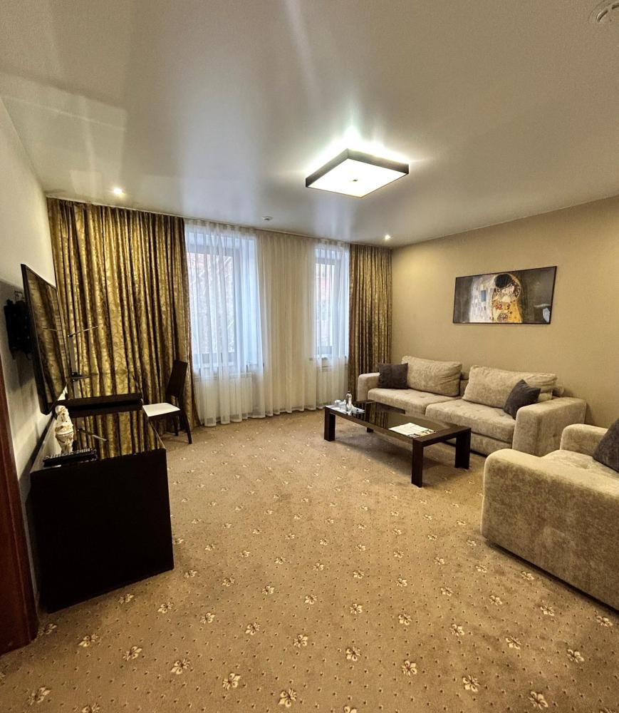 Площадь номера: 40м2 В номере: двуспальная кровать, прикроватная тумбочка, мягкая мебель, телевизор, мини-бар, радиотелефон, CD магнитола, сейф, кондиционер, подогрев пола, фен, махровые халаты, тапочки, санузел.