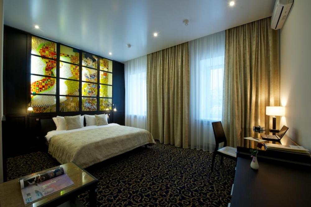 В номере: двуспальная кровать, прикроватная тумбочка, мягкая кожаная мебель, телевизор, мини-бар, радиотелефон, сейф, кондиционер, подогрев пола, фен, махровые халаты, тапочки, санузел.