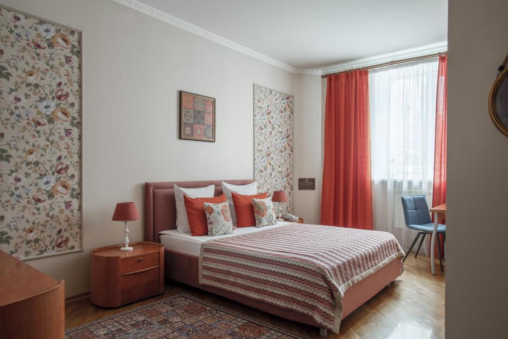 Большие, светлые комнаты с двумя окнами подарят гостям отеля чувство уюта и комфорта, а большая двуспальная кровать подарит крепкий сон. Рабочая зона оборудована письменным столом. В номерах свои собственные ванные комнаты, оснащенные высококачественной сантехникой, фенами, туалетными принадлежностями. Для всех гостей - мягкие махровые халаты и тапочки.