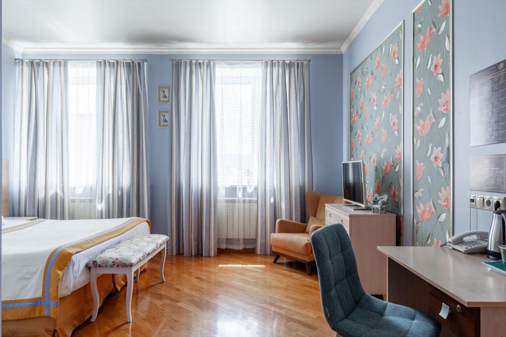 Комфорт – двухместные номера, общей площадью 34 кв.м. Большие, светлые комнаты с двумя окнами подарят гостям отеля чувство уюта и комфорта, а большая двуспальная кровать подарит крепкий сон. Рабочая зона оборудована письменным столом, за которым Вы сможете продуктивно поработать, а в мягком кресле Вы прекрасно проведете вечер за чашечкой вкусного чая и интересной книгой. В номерах свои собственные ванные комнаты, оснащенные высококачественной сантехникой, фенами, туалетными принадлежностями. Для всех гостей - мягкие махровые халаты и тапочки!