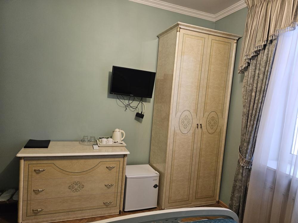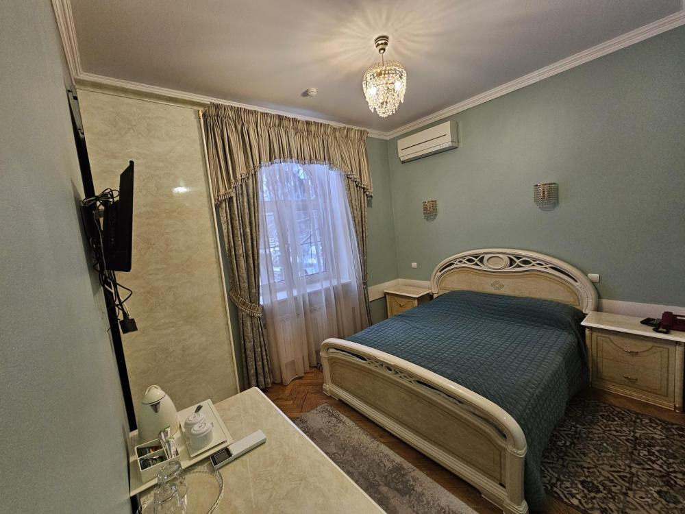 Номера категории Стандарт - однокомнатные номера с одной двуспальной кроватью. Комфортабельные, уютные двухместные номера оснащены всем необходимым для проживания: одна двуспальная кровать 1,6 *200, мини холодильник, кондиционер, телевизор, ванная комната, бесплатный Wi-Fi, косметические принадлежности, полотенца, халаты, тапочки.