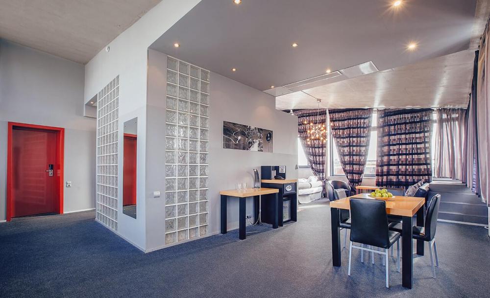 Двухуровневый номер, состоящий из двух комнат: просторной гостиной с высокими потолками и шикарной спальни на (2-м этаже) с большой двухспальной кроватью и двумя лоджиями, выходящими на противоположные стороны. В номере на первом этаже туалет с раковиной, а на втором этаже душевая кабина.