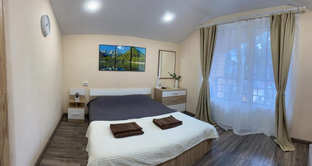 Номер на 2 этаже. В номере двуспальная кровать, раскладной диван шириной 130*190 см. На диване могут разместиться 2 детей или 1 взрослый, также есть возможность поставить раскладушку. В ванной комнате функционирует тёплый пол (электрический), также в холодное время суток функционирует тёплый пол в спальне и на кухне (водяной), отлично подойдёт для круглогодичного проживания. Площадь кухни 8м2. Балкон застекленный.