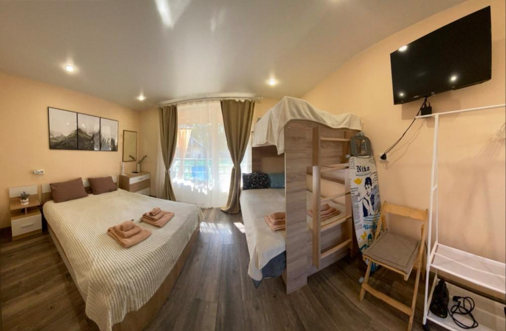 Номер на 1 этаже. В номере двуспальная кровать, двухъярусная кровать с 2-мя спальными местами на 1 этаже (120*190 см) и 1 местом на 2 этаже (90*190 см), также есть возможность поставить раскладушку. В ванной комнате функционирует тёплый пол (электрический), также в холодное время суток функционирует тёплый пол в спальне и на кухне (водяной), отлично подойдёт для круглогодичного проживания. Площадь кухни 8м2. Балкон застекленный.