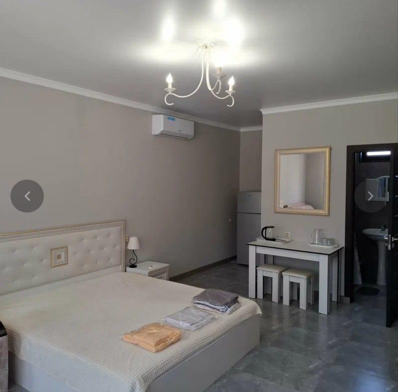 В номере двуспальная кровать, диванчик раскладной, душ, туалет, фен, кондиционер, тв, холодильник, чайник.