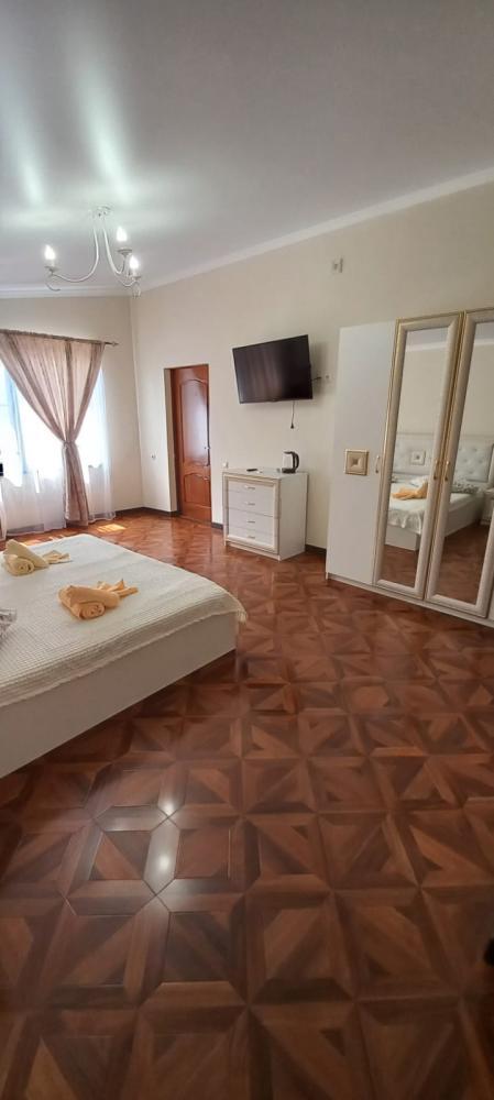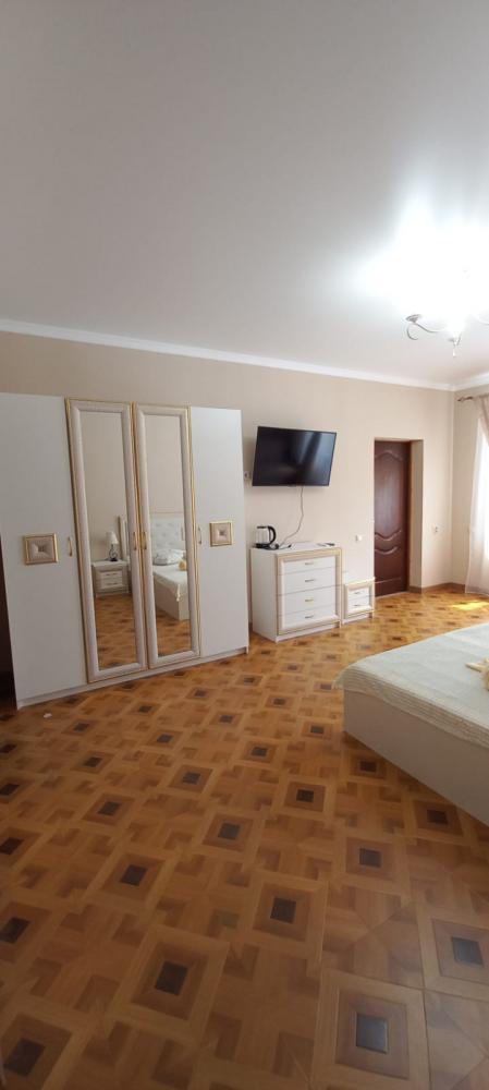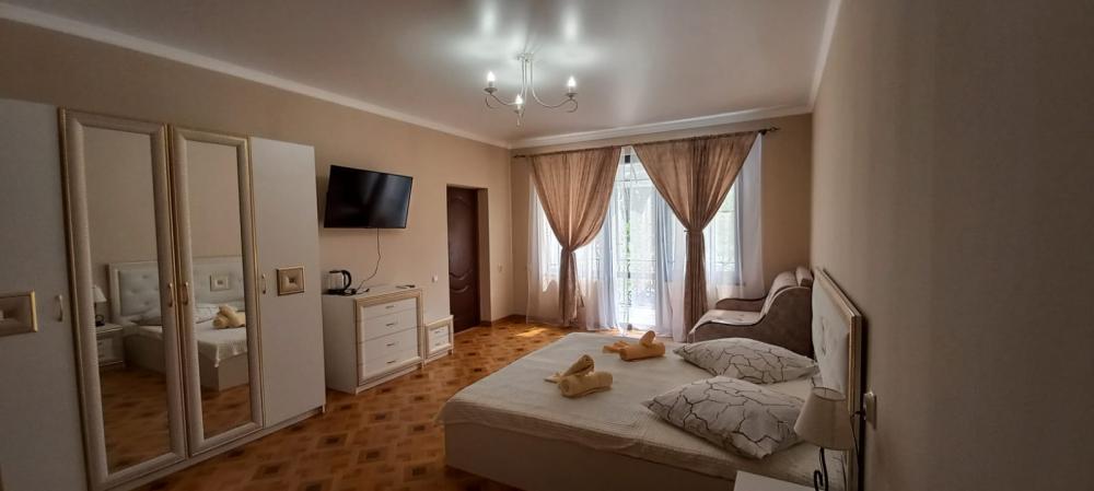 В номере двуспальная кровать, диванчик раскладной, душ, туалет, фен, кондиционер, тв, холодильник, чайник, личный балкон.