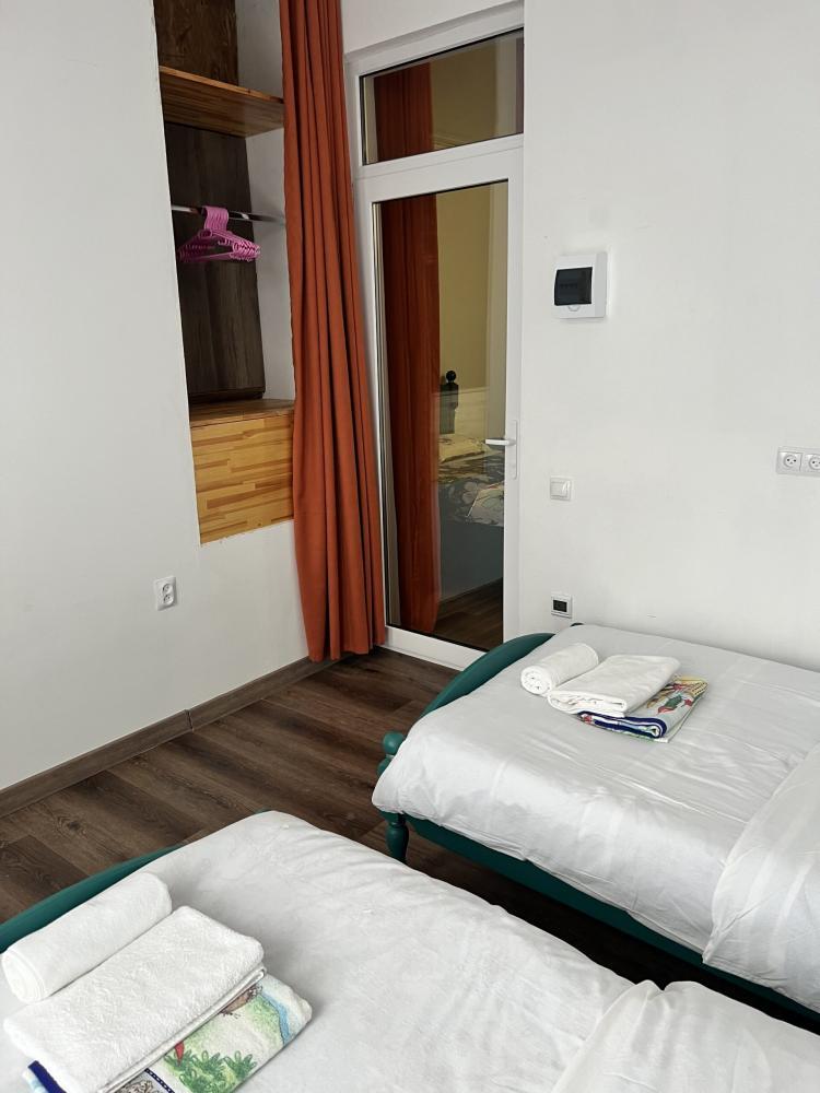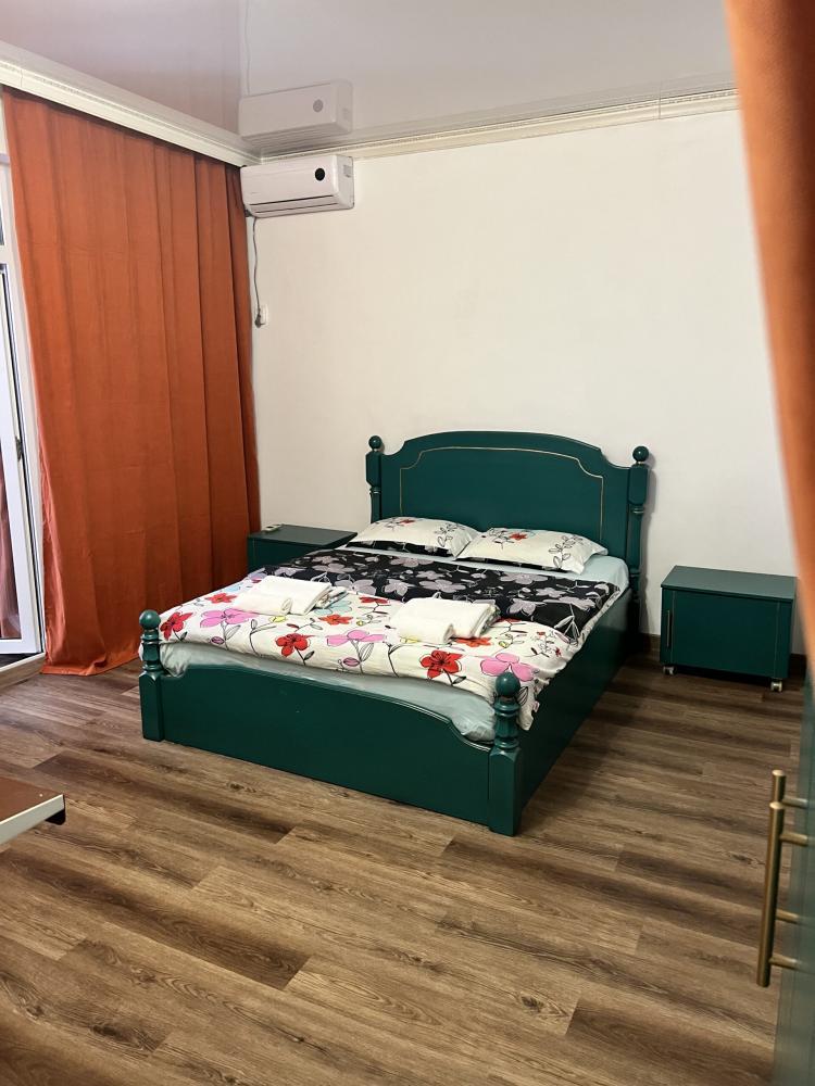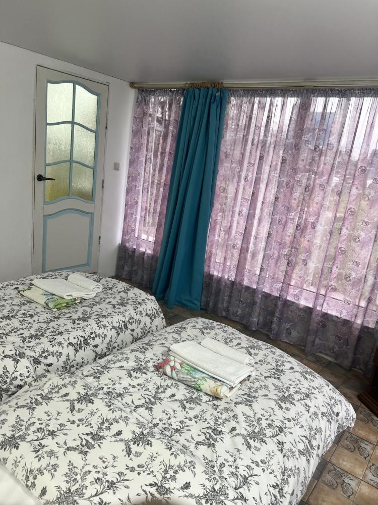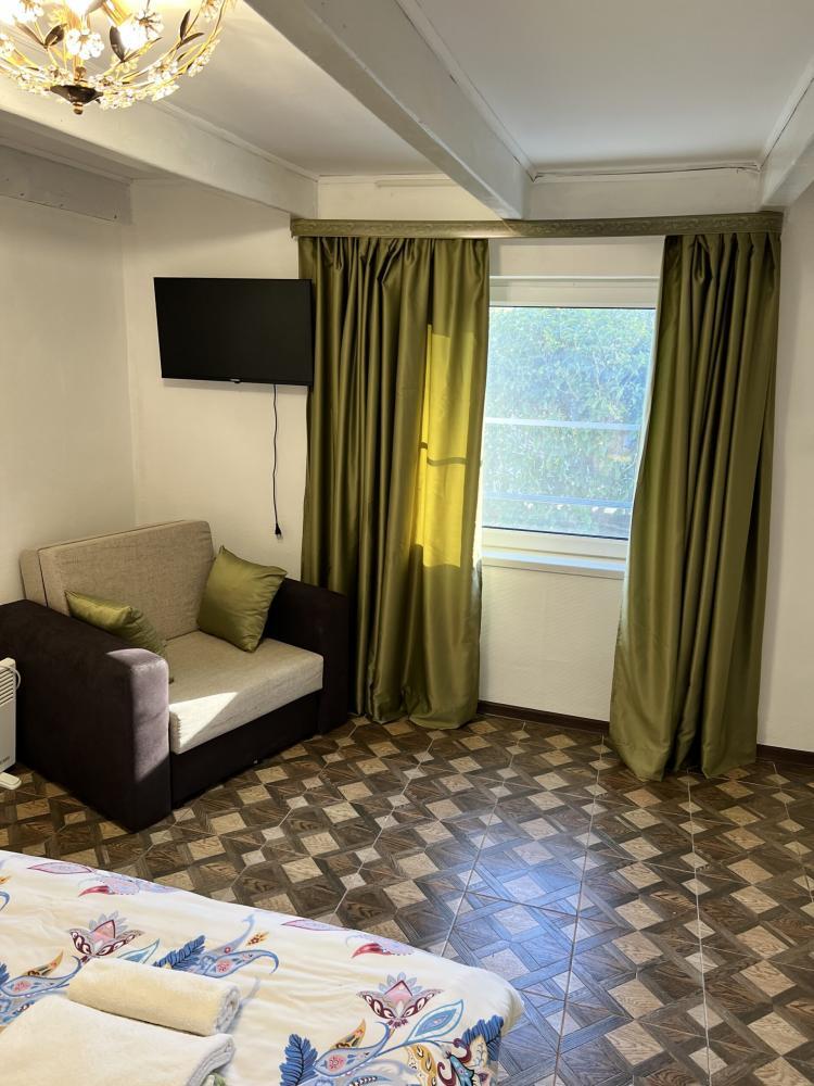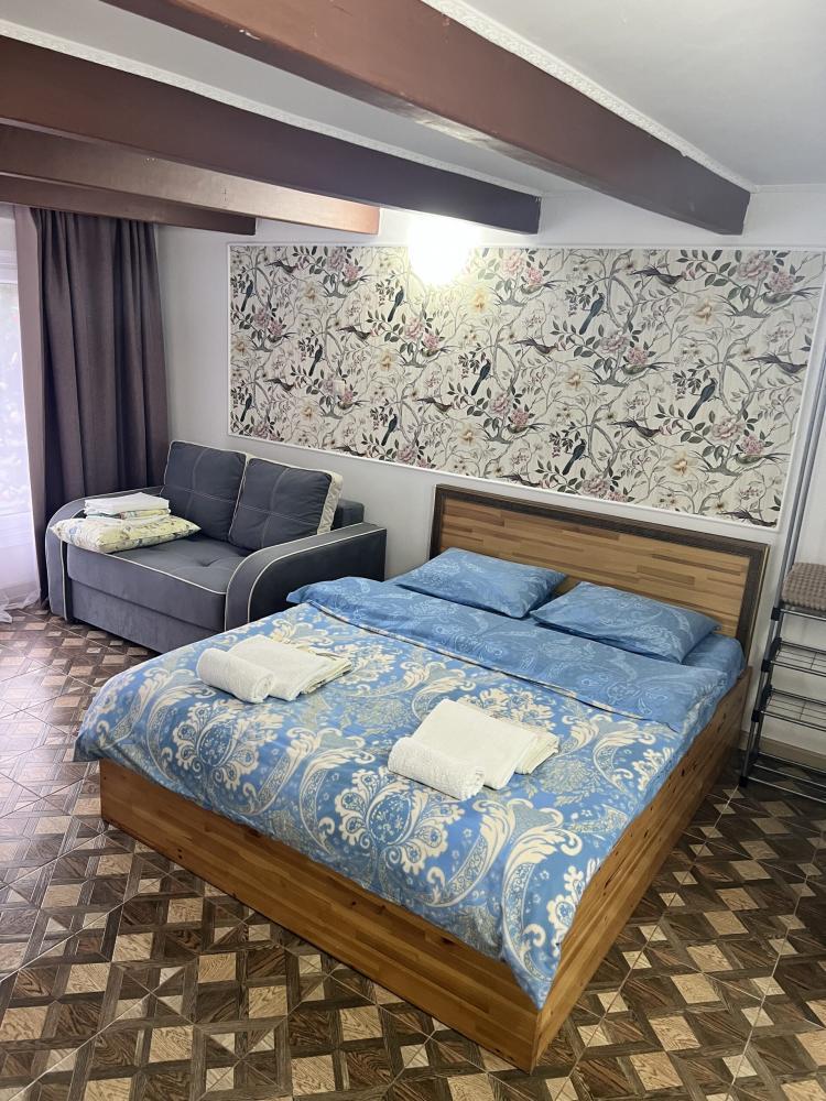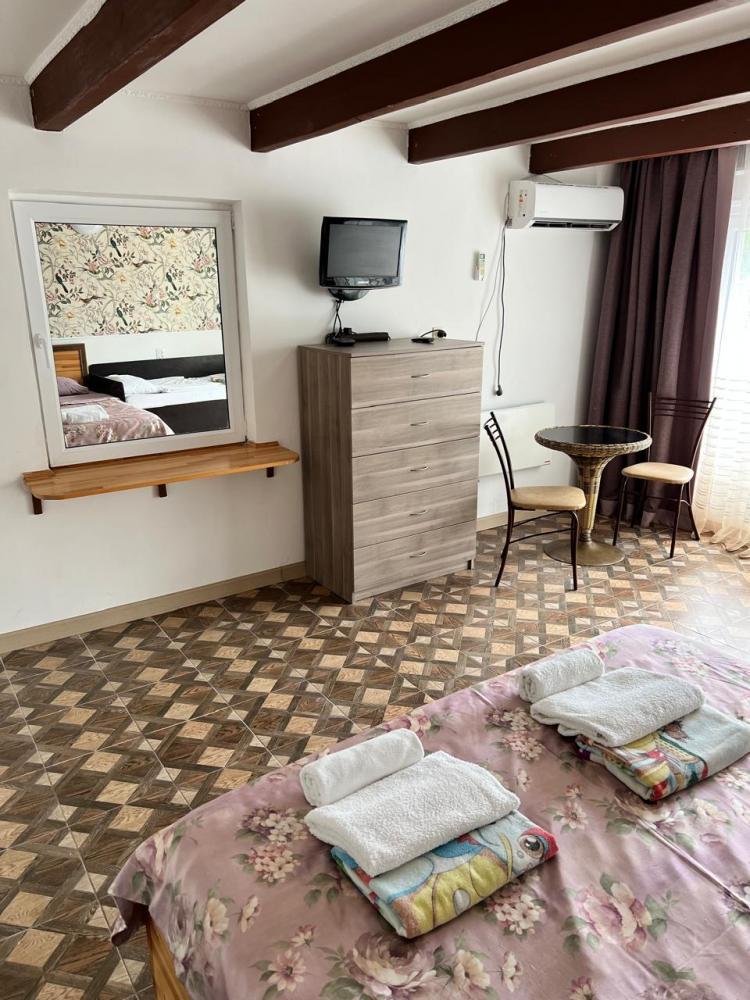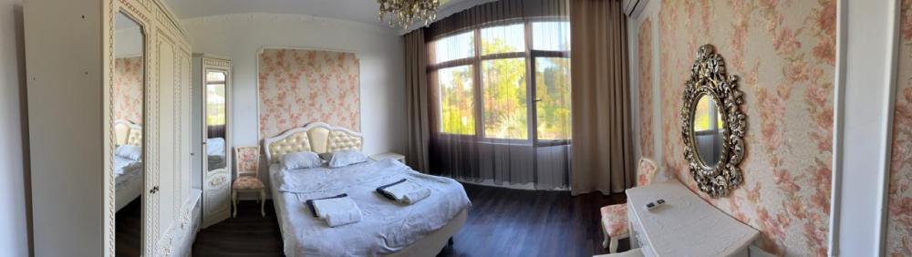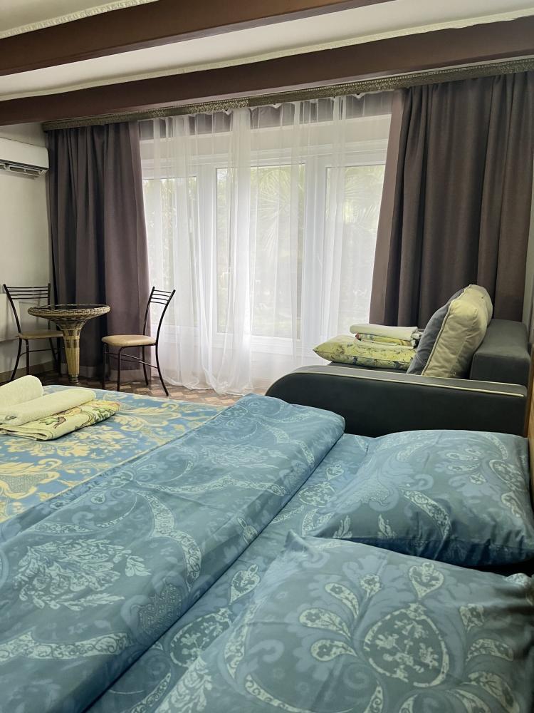 Апартаменты находятся на втором этаже гостевого дома. Апартаменты с отдельным входом. Апартаменты состоят из большой гостиной с двумя большими диванами, журнальным столиком, изолированной комнаты с двуспальной кроватью, шкафом для одежды, двумя тумбочками, еще одной изолированной комнаты с двуспальной кроватью. Отдельный туалет, ванная комната с джакузи, и центральным балконом с видом на сад и море. Имеется веранда с уютными диванчиками. Максимум 6 человек. Кухня общая.