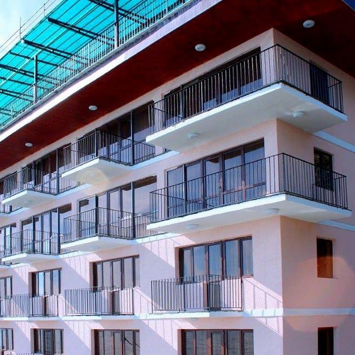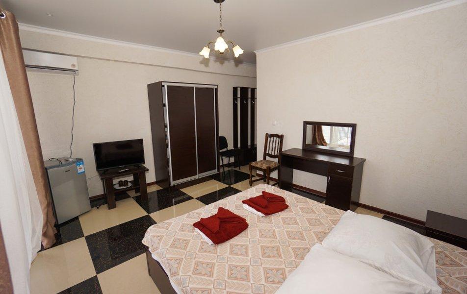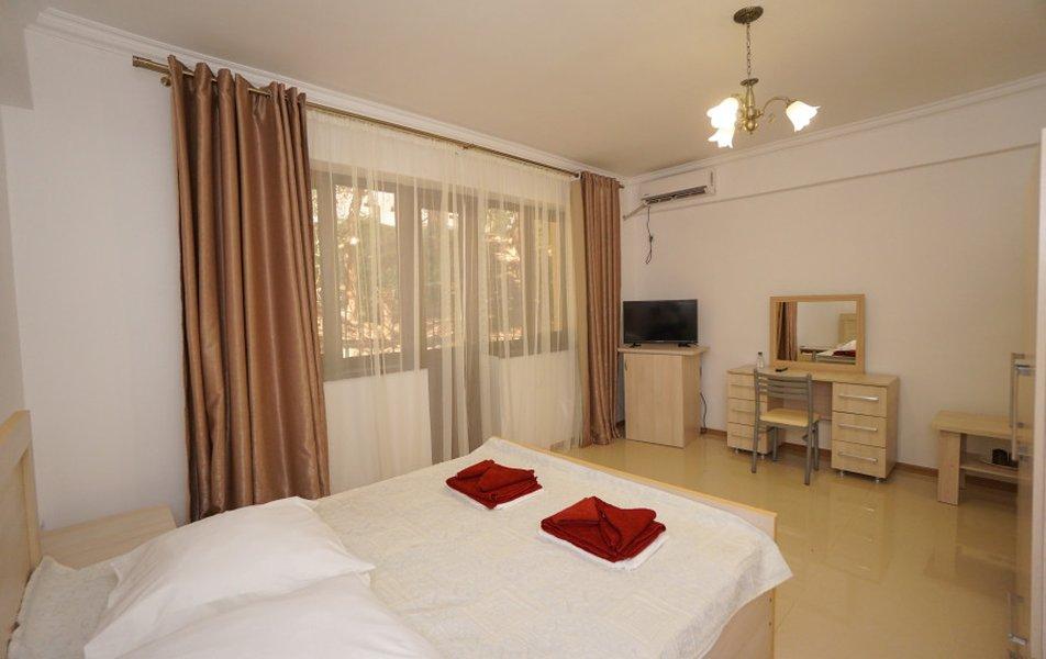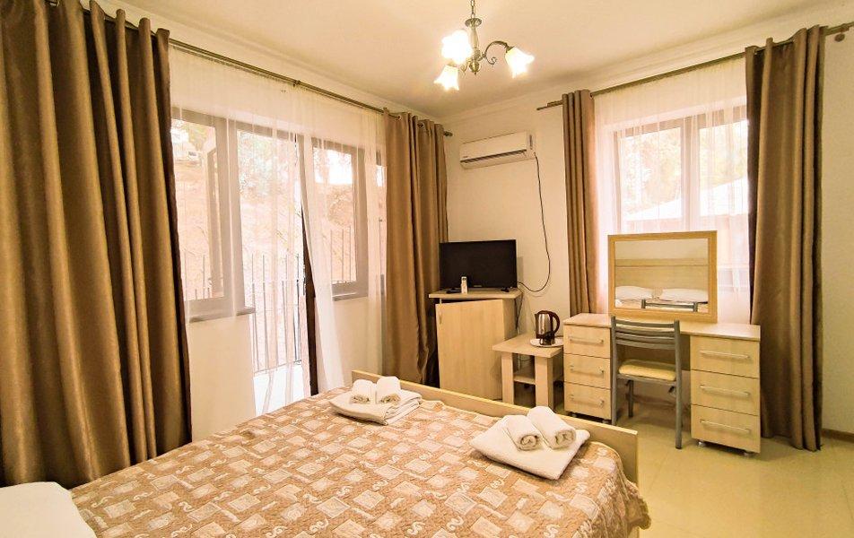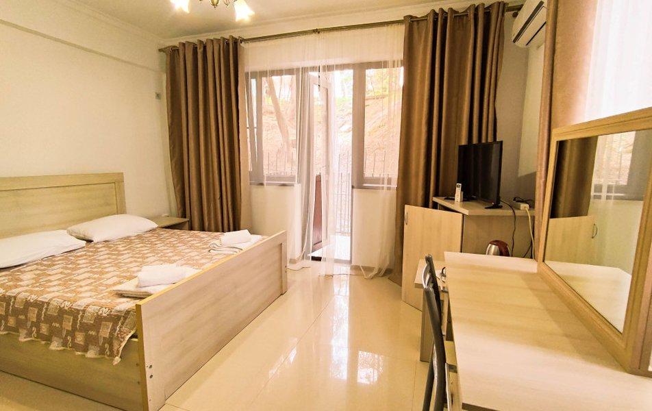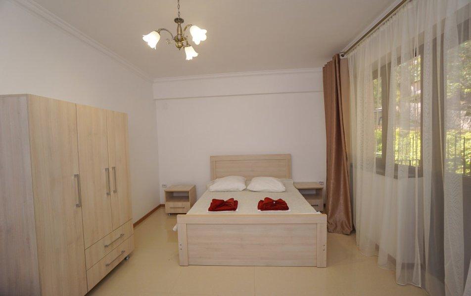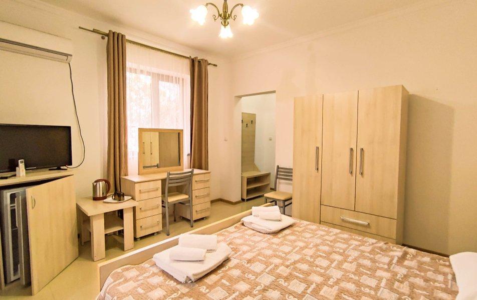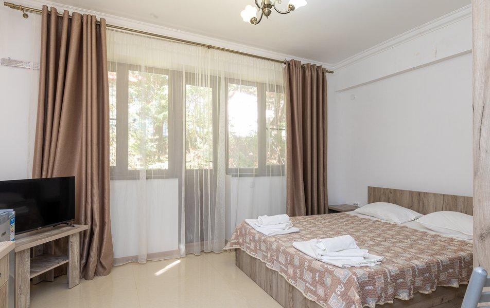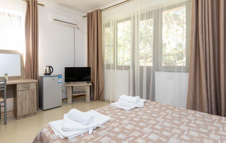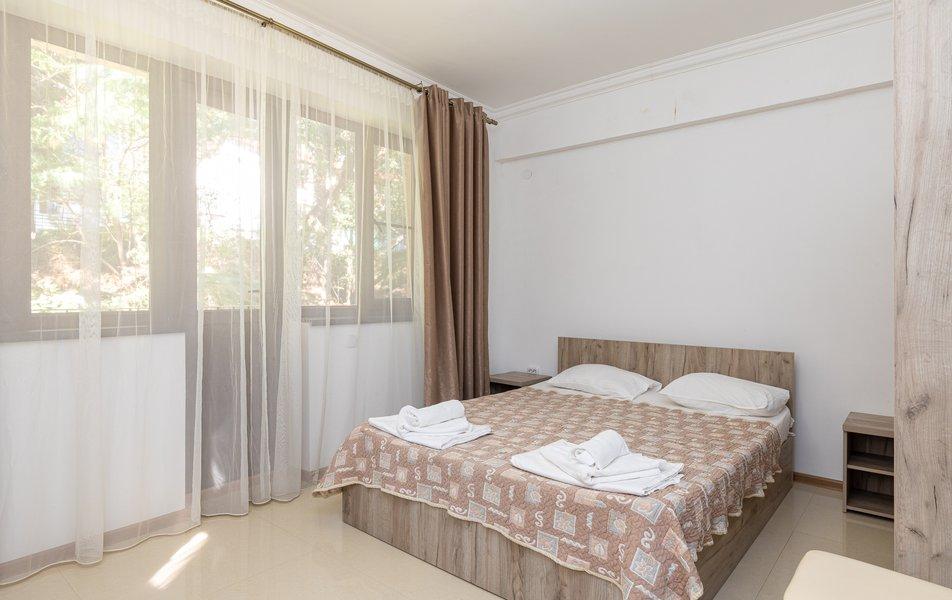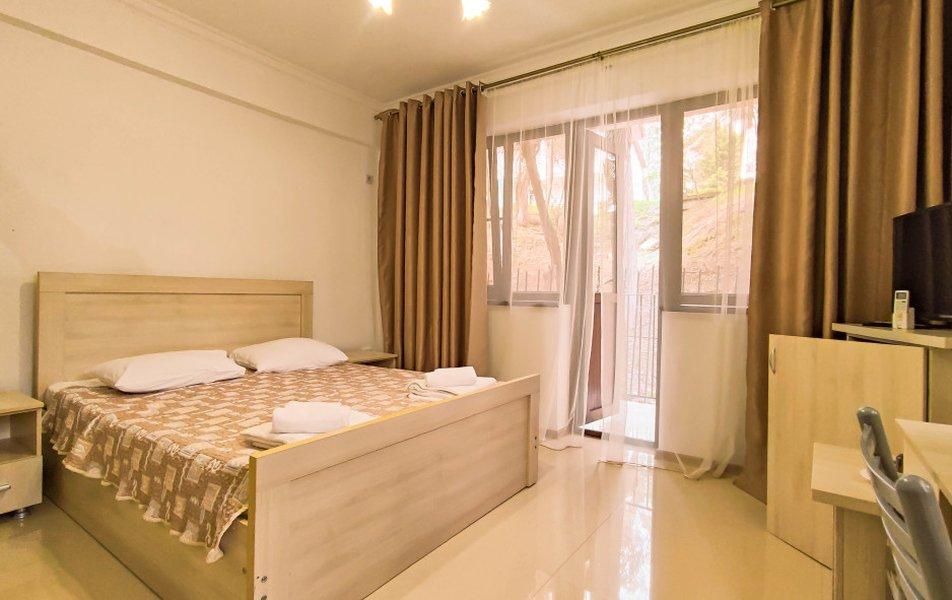 Номера на 3 этажах с выходом на аллею. В номере двуспальная кровать, раскладной диван в гостиной.
