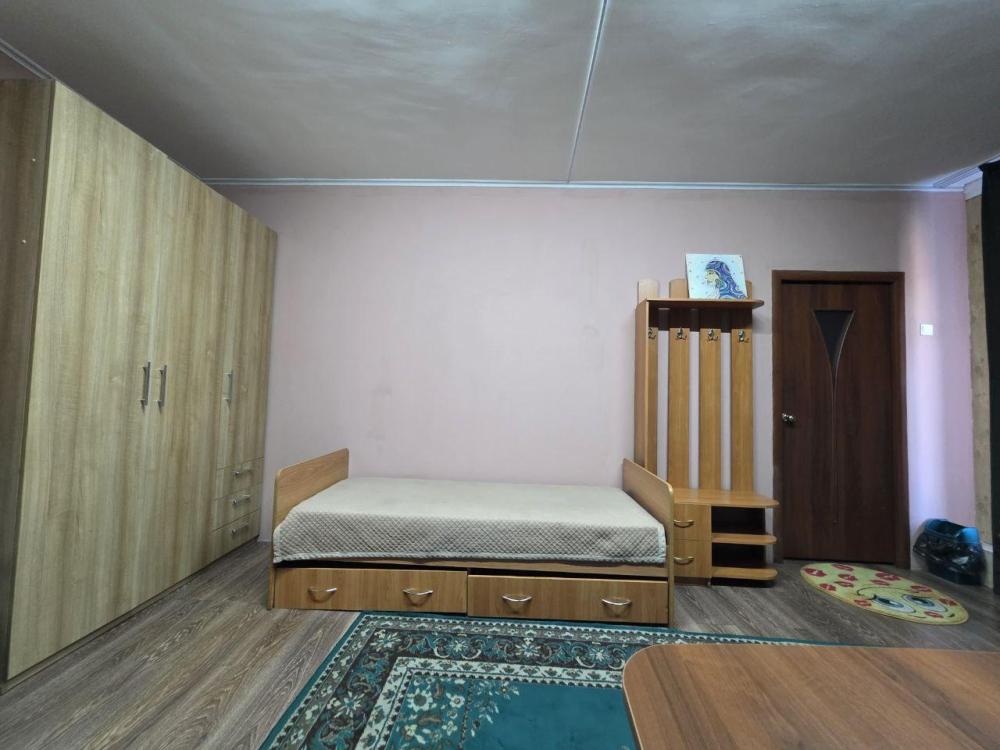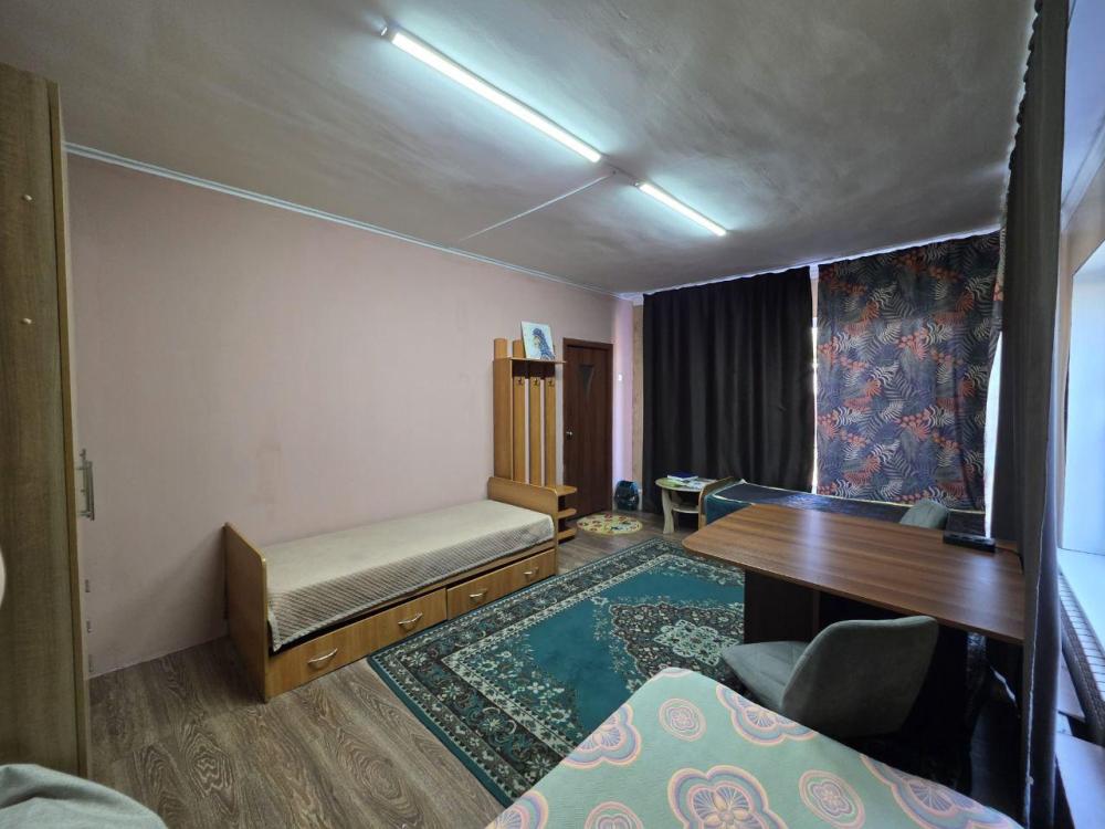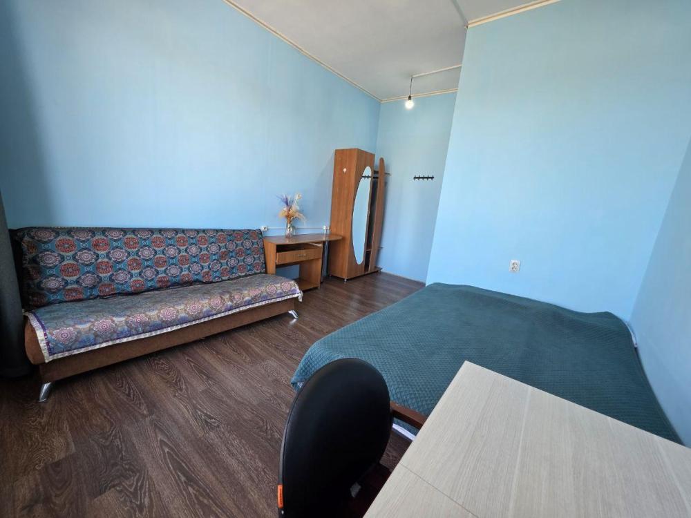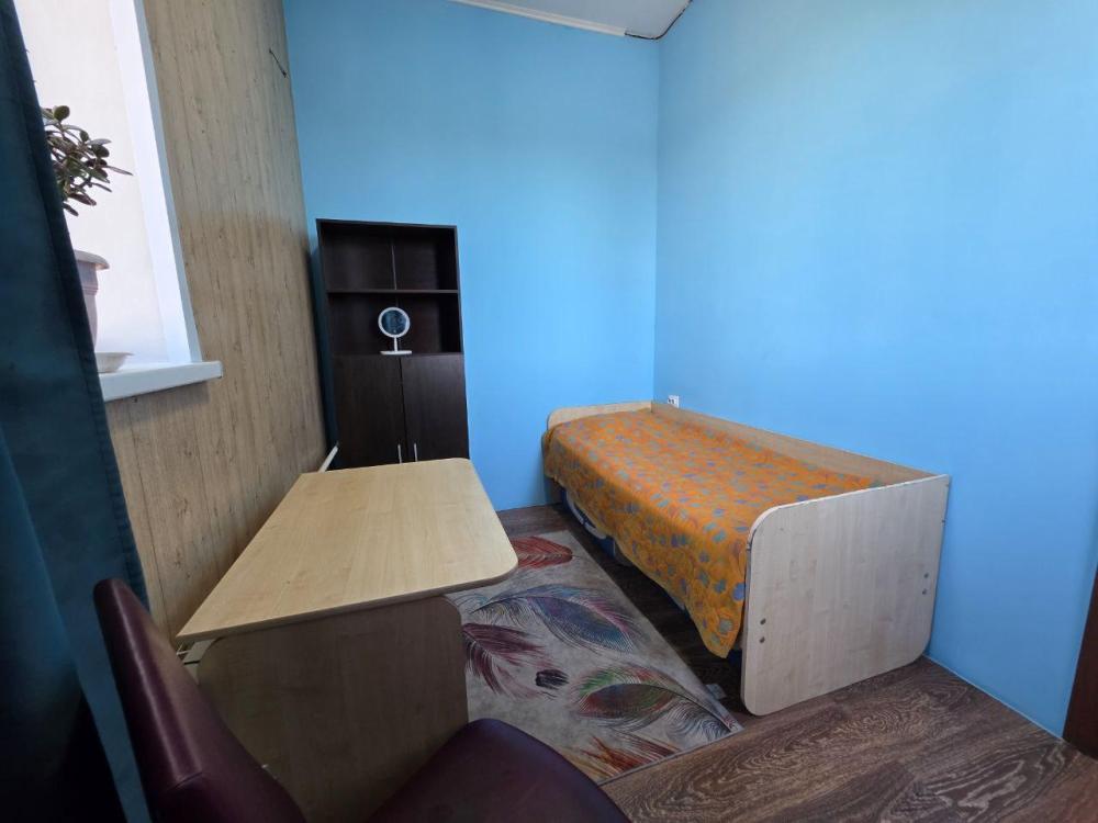 Комната "Весенняя степь" для проживания 1 человека: 1 одноместная кровать, стол, шкаф, стул. На этаже - общий санузел, ванна с душем, кухонная зона с плитой, холодильником, микроволновкой и посудой.
