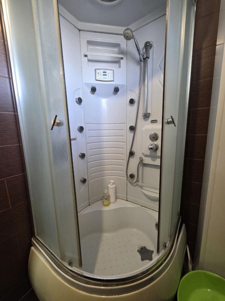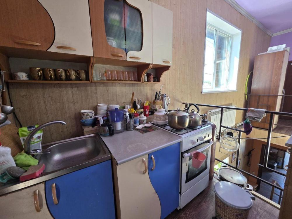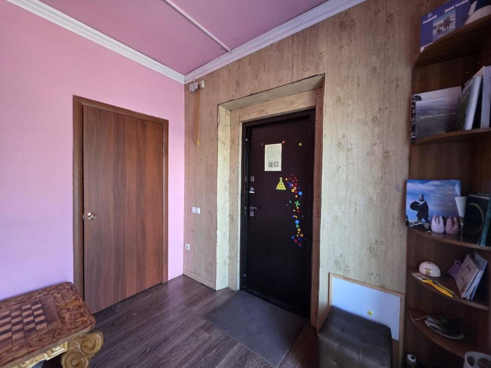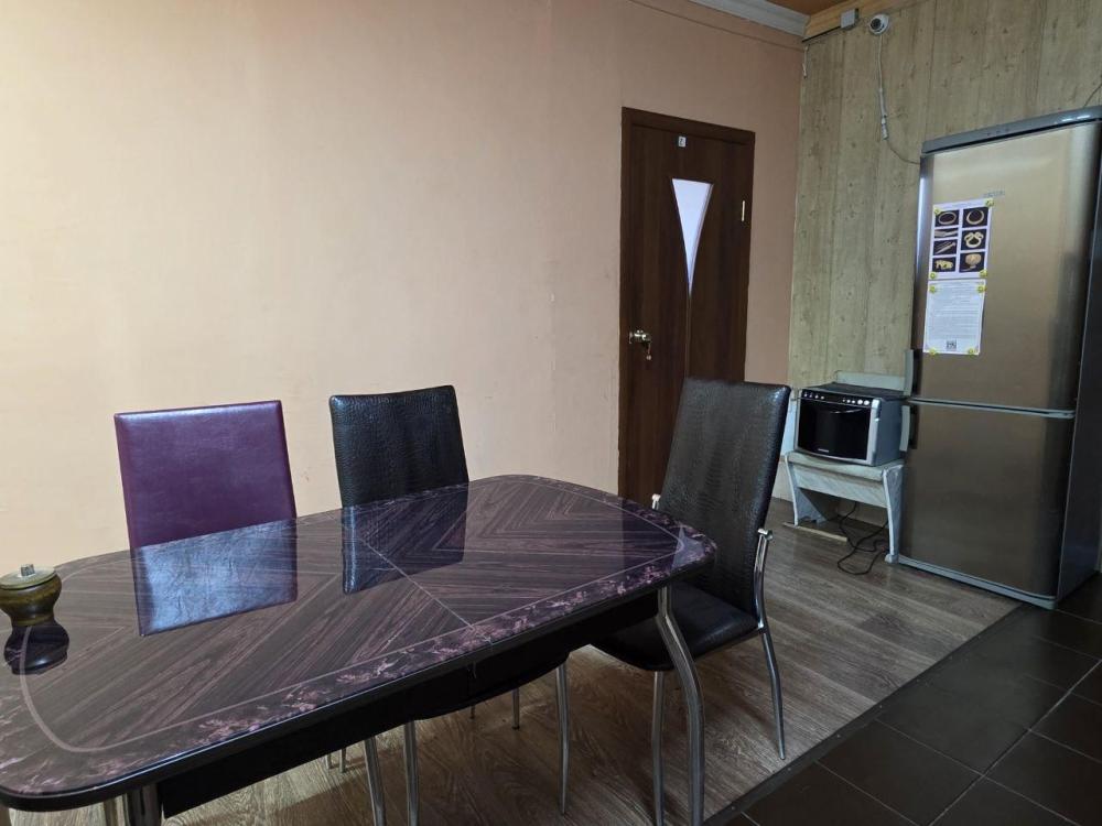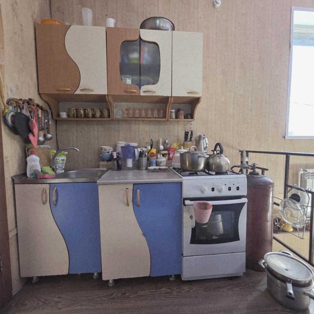Комната "Саянские горы" для проживания до 3 человек: 1 двуспальная кровать, диван-книжка, стол, шкаф, стулья. На этаже - общий санузел, ванна с душем, кухонная зона с плитой, холодильником, микроволновкой и посудой.