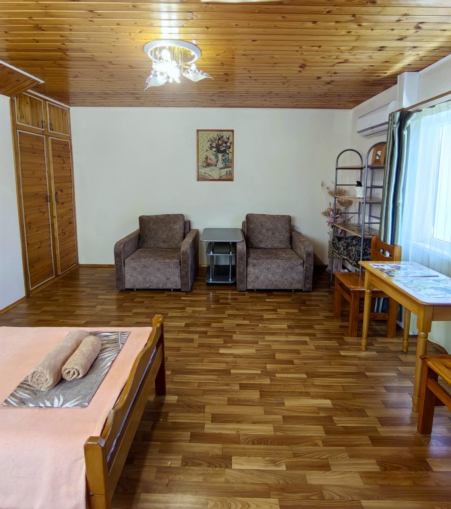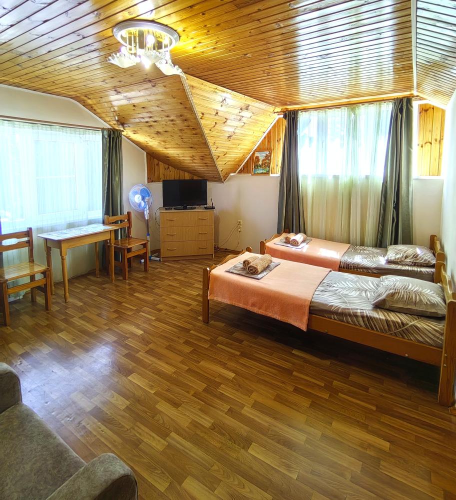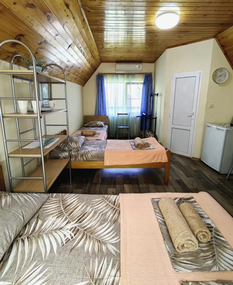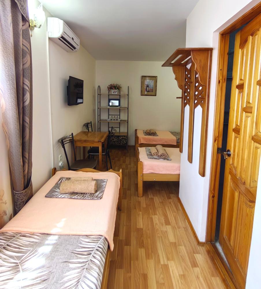 Уютный четырехместный номер с мини балконом/террасой. Для комфортного проживания в номере телевизор, wi-fi, холодильник, кондиционер, стол, стулья, набор посуды ,чайник. Санузел в номере. Постельное бельё, пледы и полотенца предоставляем. Гладильная доска и утюг на этаже.