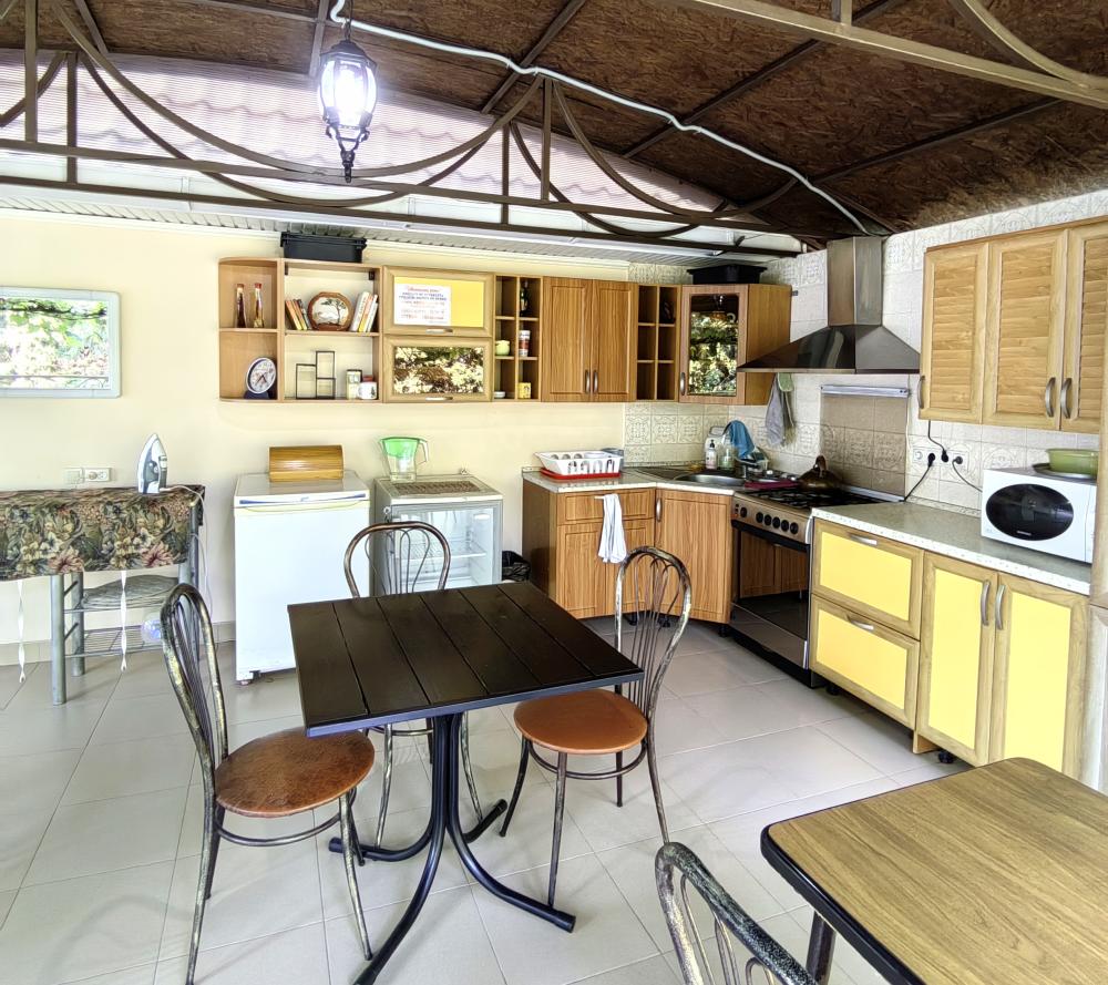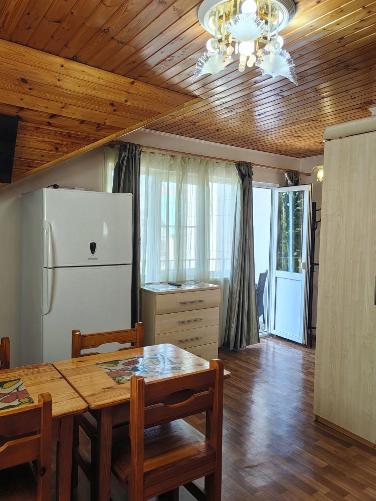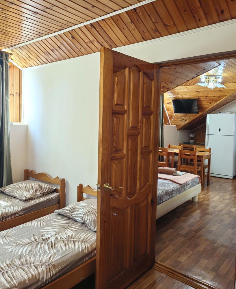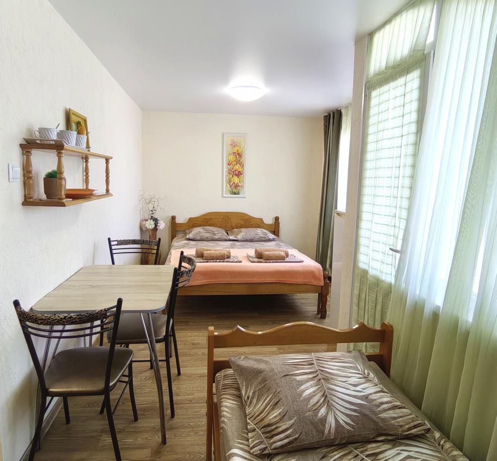 Уютный четырехместный номер с мини балконом/террасой. Для комфортного проживания в номере телевизор, wi-fi, холодильник, кондиционер, стол, стулья, набор посуды ,чайник. Санузел в номере. Постельное бельё, пледы и полотенца предоставляем. Гладильная доска и утюг на этаже.