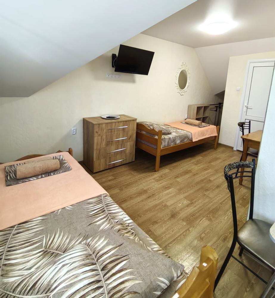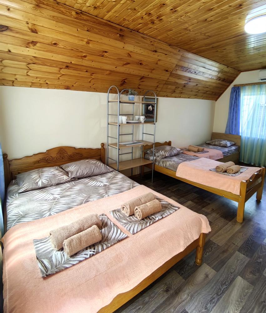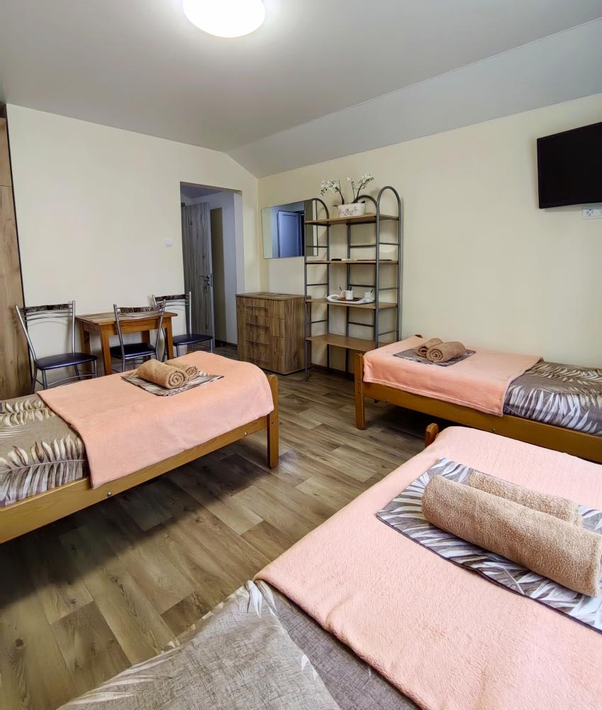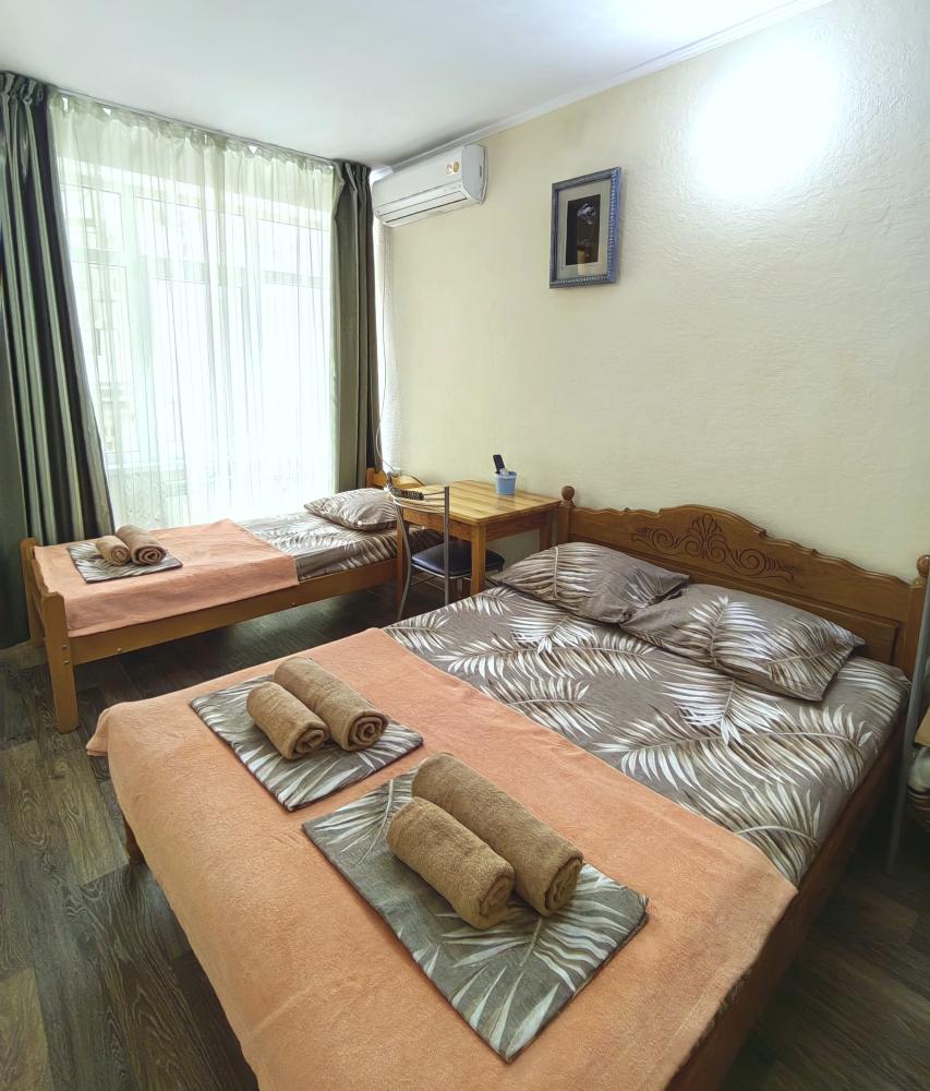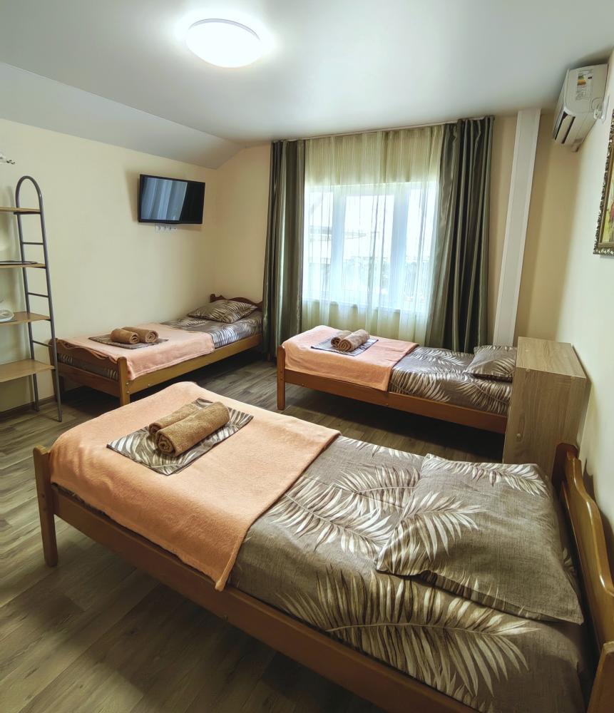 Уютный трехместный номер. Для комфортного проживания в номере телевизор, wi-fi, холодильник, кондиционер, стол, стулья, необходимая посуда. Санузел в номере. Постельное бельё, пледы и полотенца предоставляем. Чайник, гладильная доска и утюг на этаже.