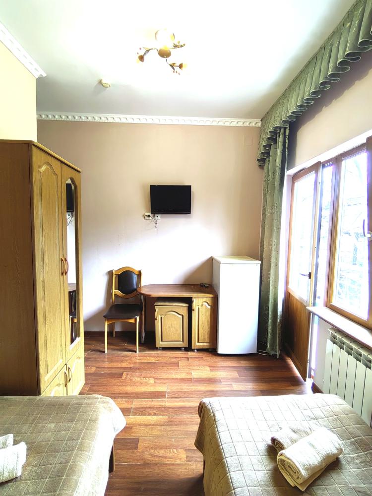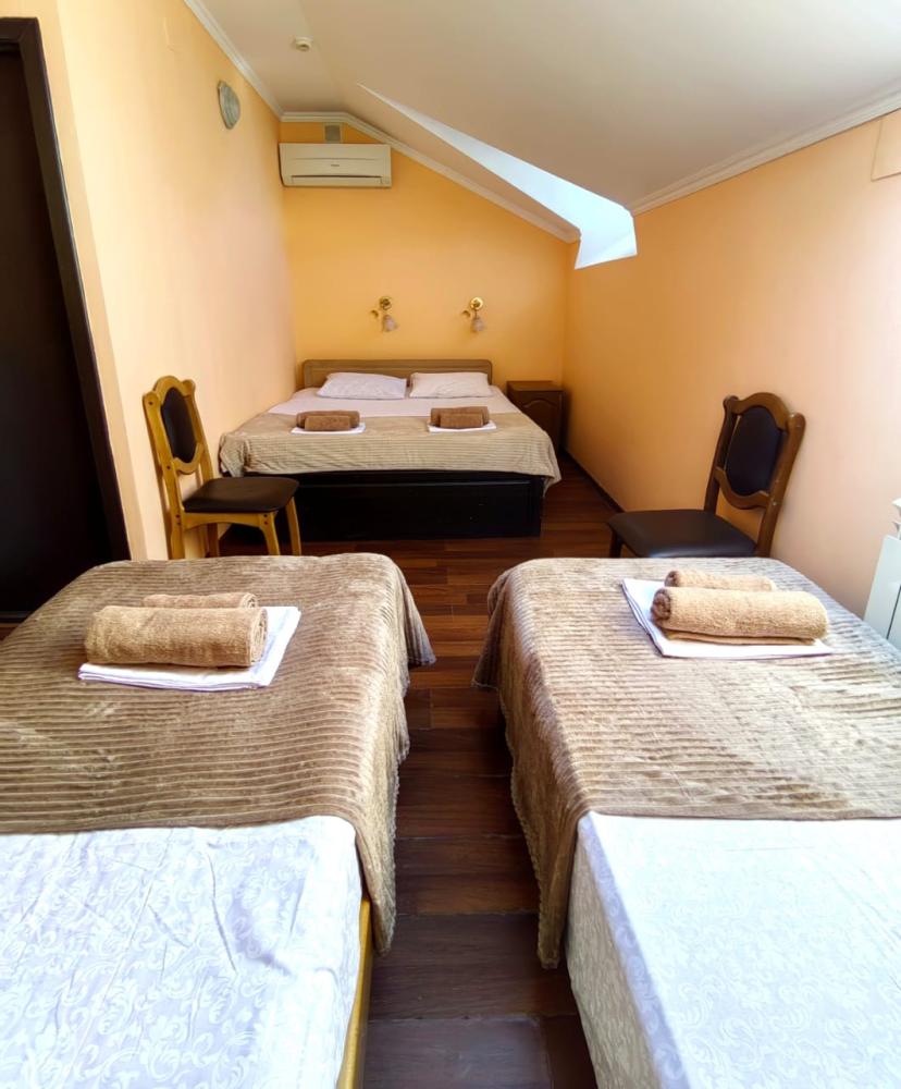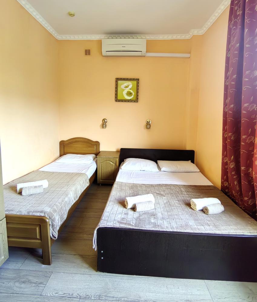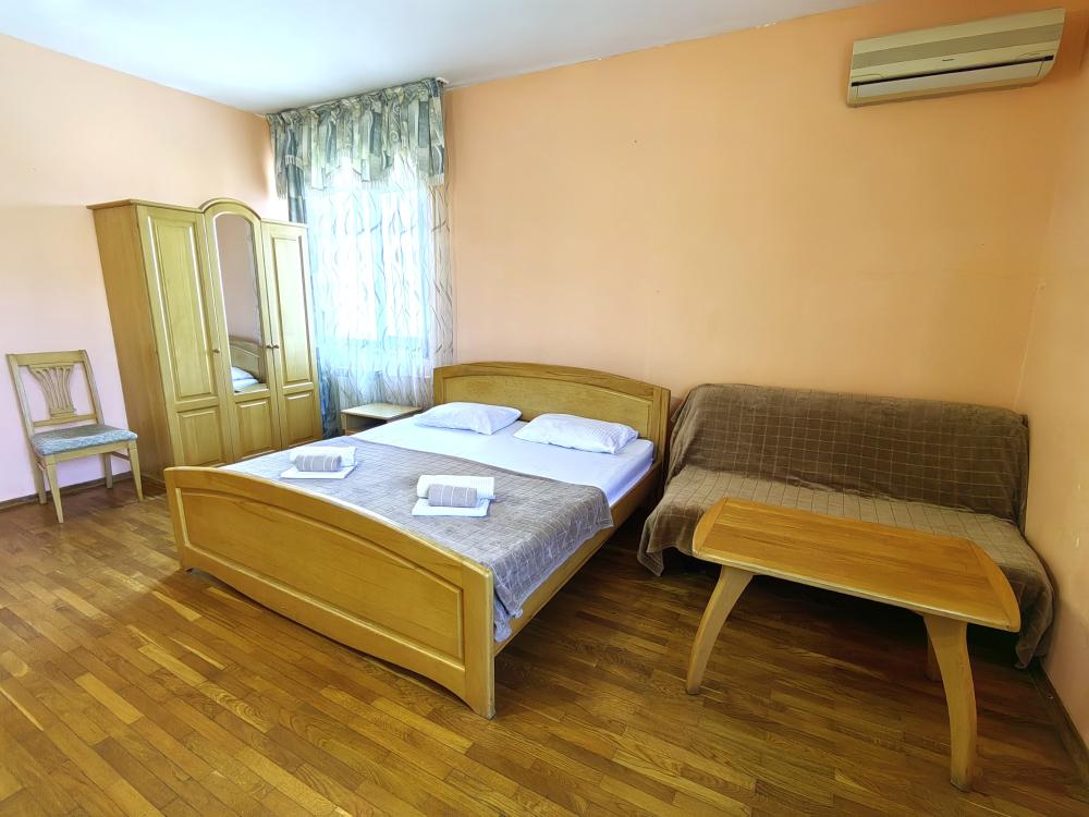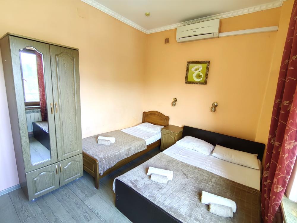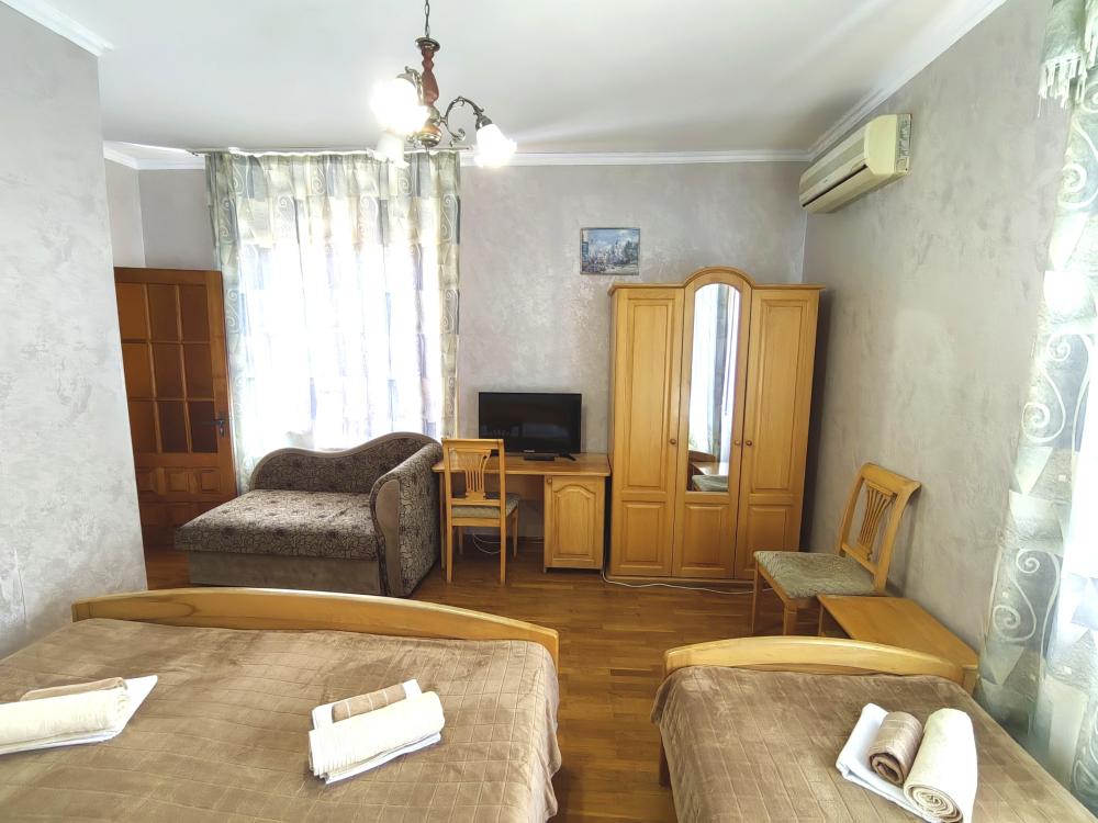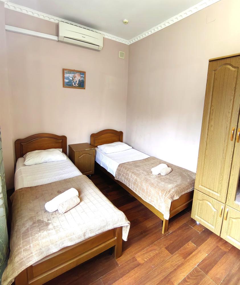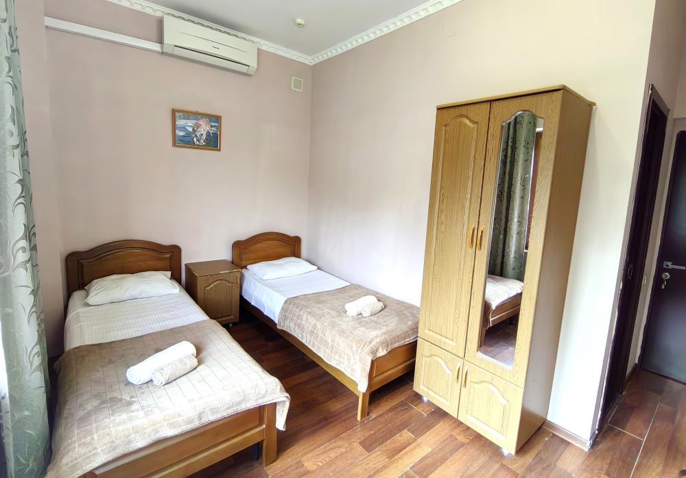 Кровати, диван, кресло-кровать, тумбочки, вешалка, шкаф, зеркало, телевизор, сплит-система, холодильник, Wi-Fi, комплект полотенец, санузел, душ.