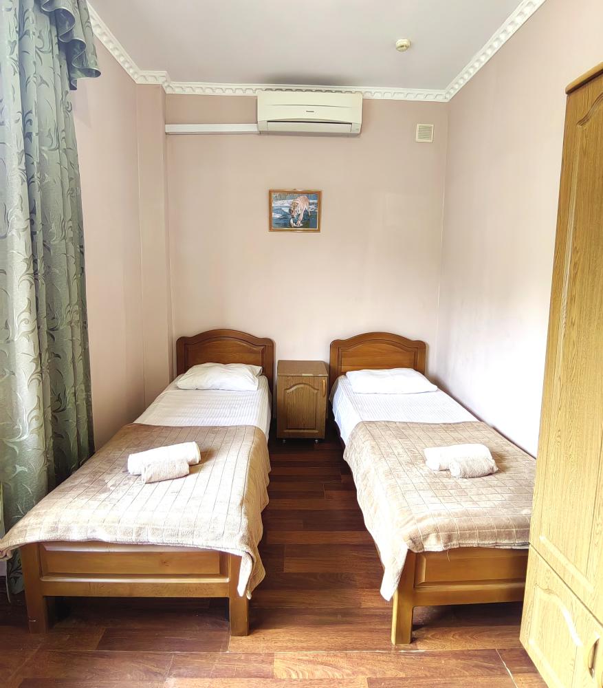 Кровати, тумбочки, вешалка, шкаф, зеркало, телевизор, сплит-система, холодильник, Wi-Fi, комплект полотенец, санузел, душ.