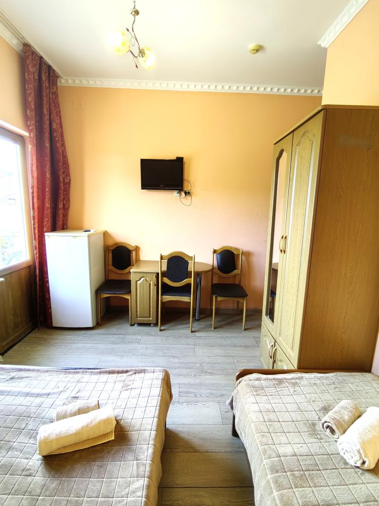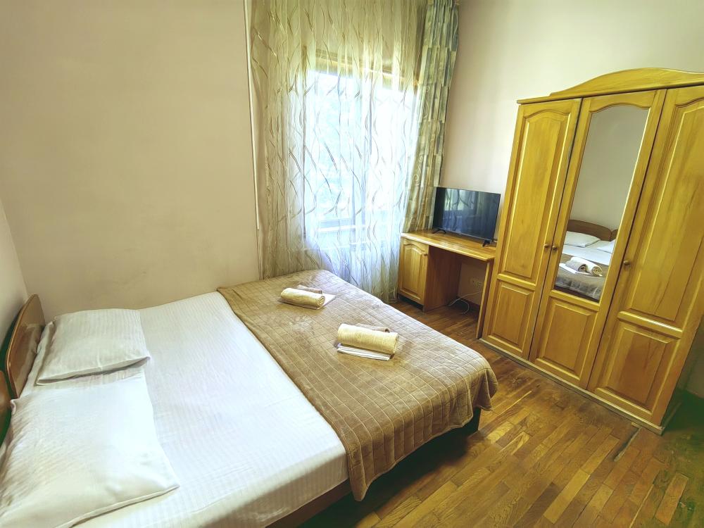 Двуспальная и/или односпальные кровати, тумбочки, вешалка, шкаф, зеркало, телевизор, сплит-система, холодильник, Wi-Fi, комплект полотенец, санузел, душ.