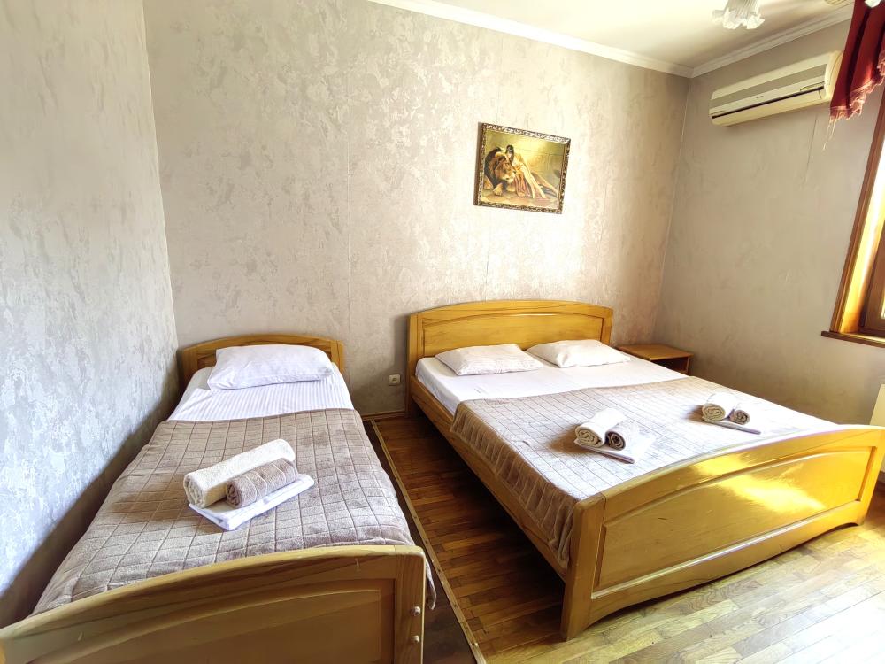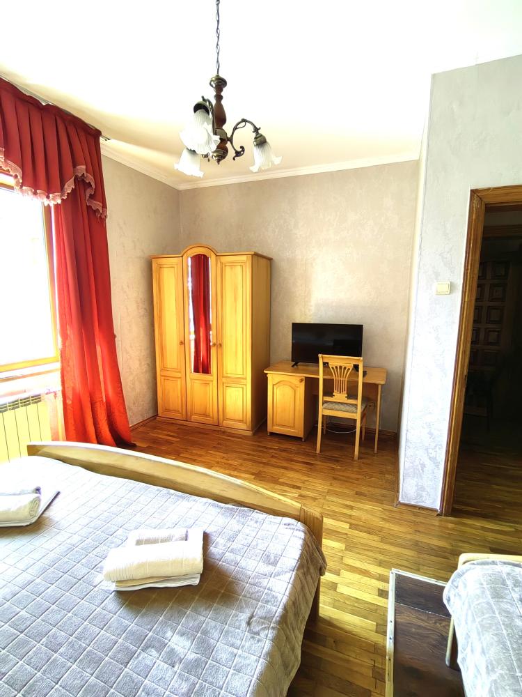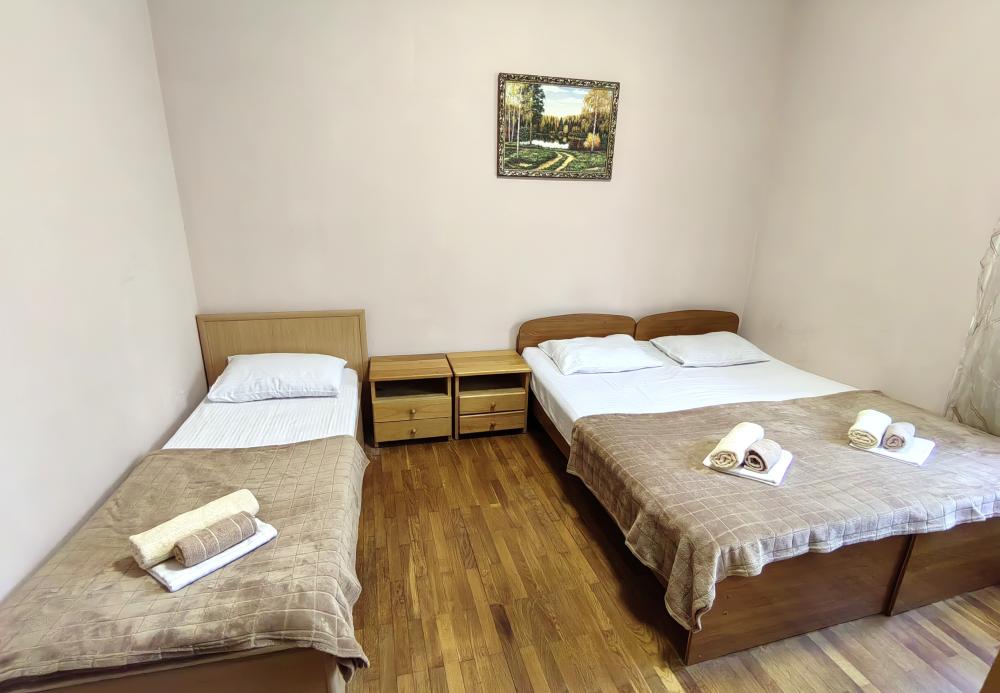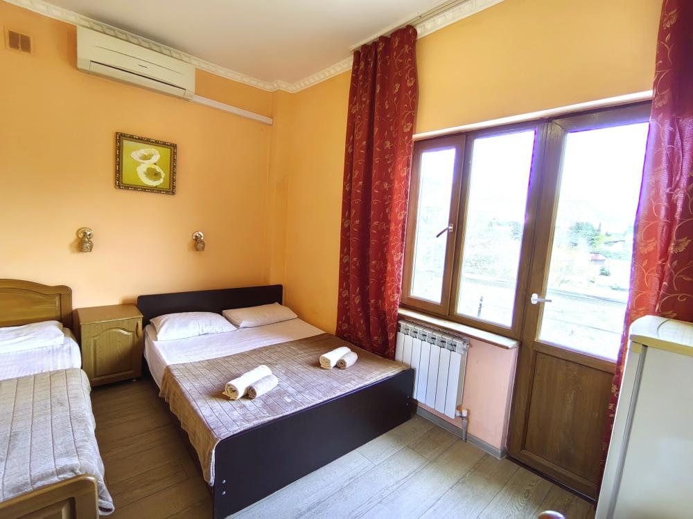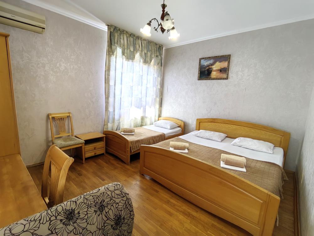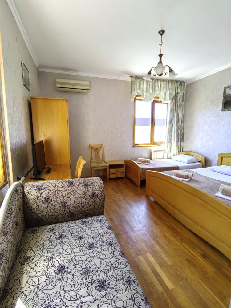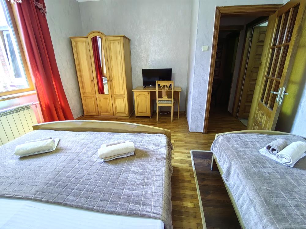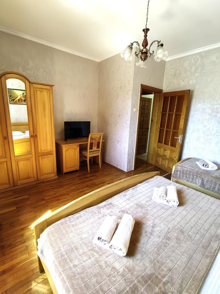 Двуспальная кровать, односпальные кровати или диван, тумбочки, вешалка, шкаф, зеркало, телевизор, сплит-система, холодильник, Wi-Fi, комплект полотенец, санузел, душ.