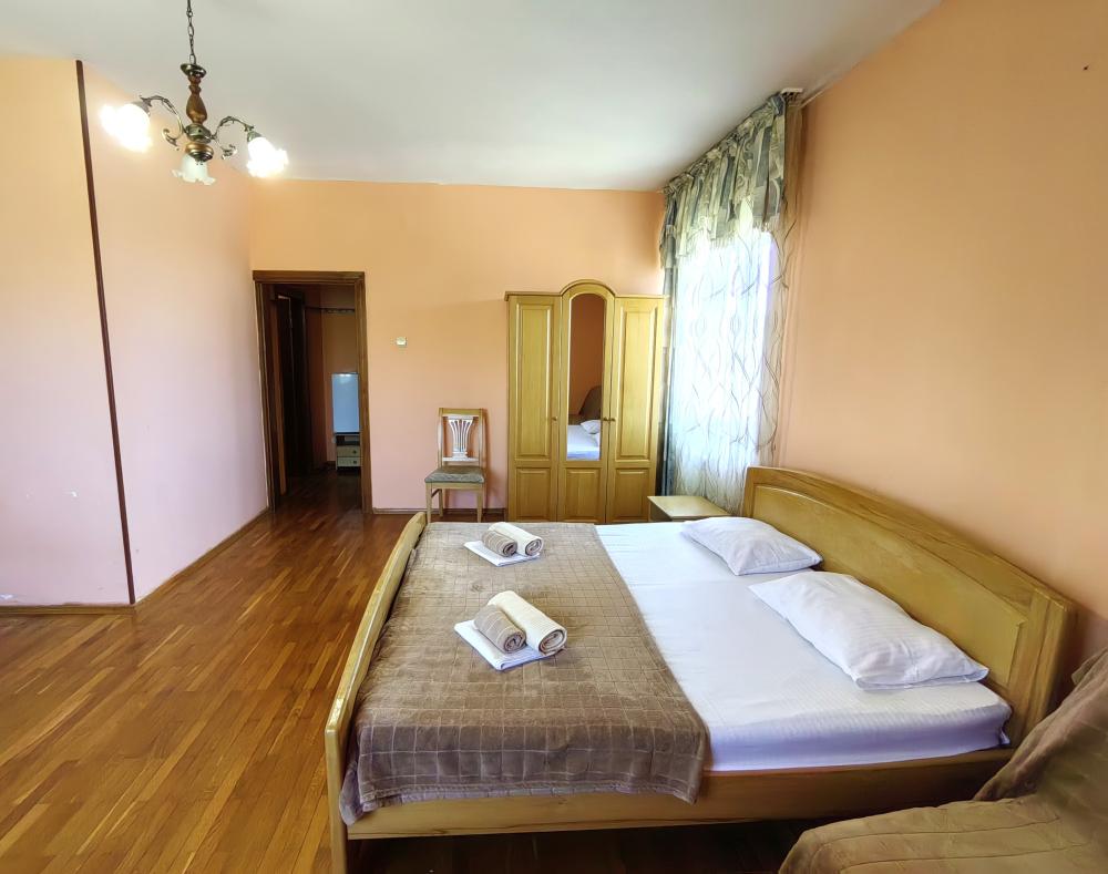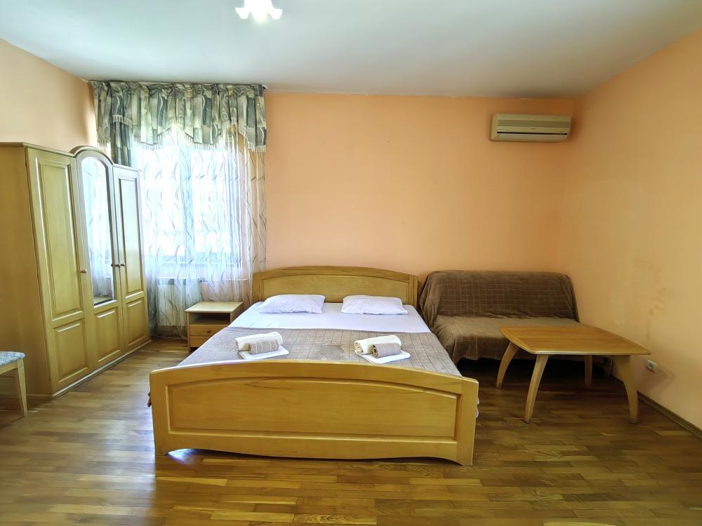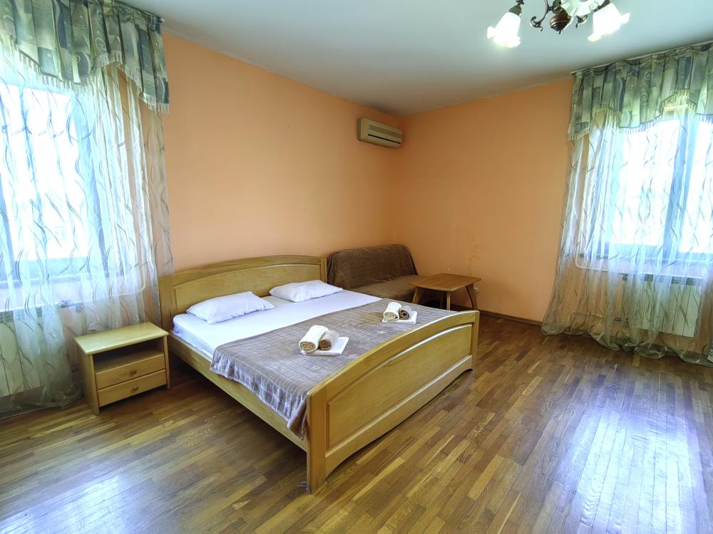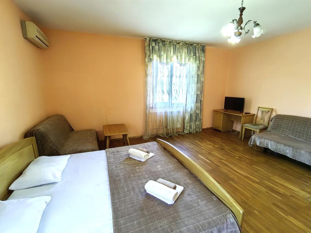 Двуспальная кровать, двуспальный диван, кресло-кровать, тумбочки, вешалка, шкаф, зеркало, телевизор, сплит-система, холодильник, Wi-Fi, комплект полотенец, санузел, душ.
