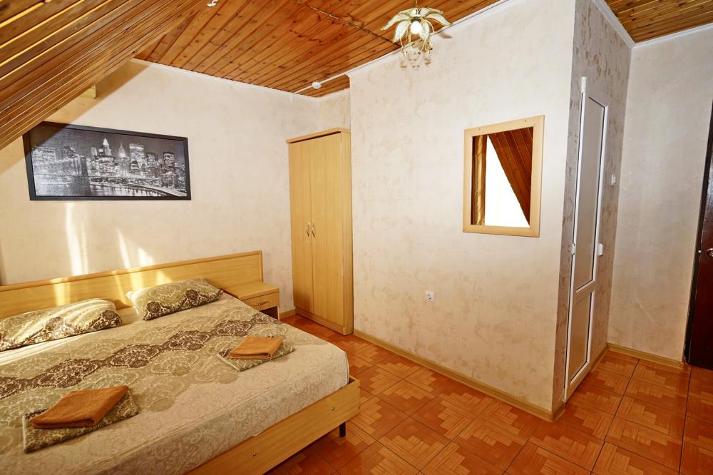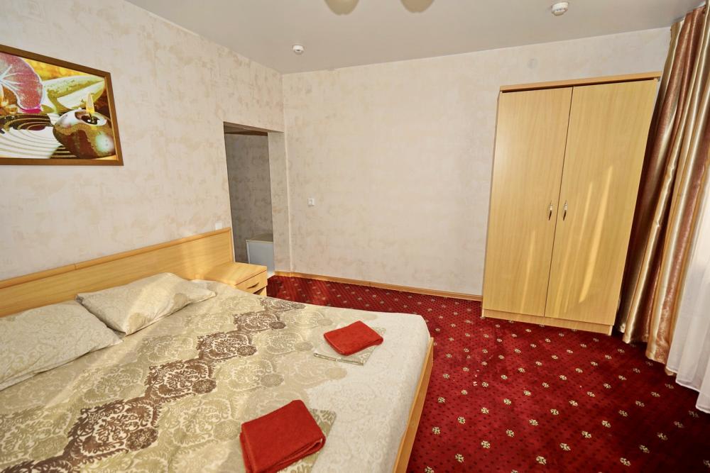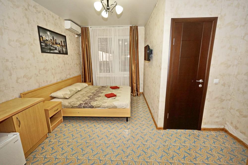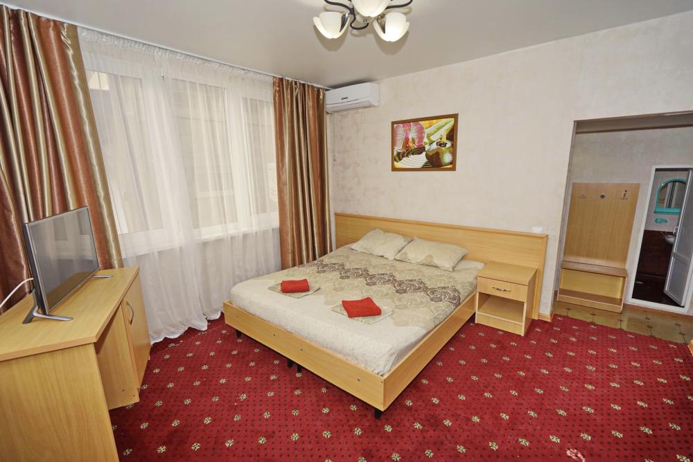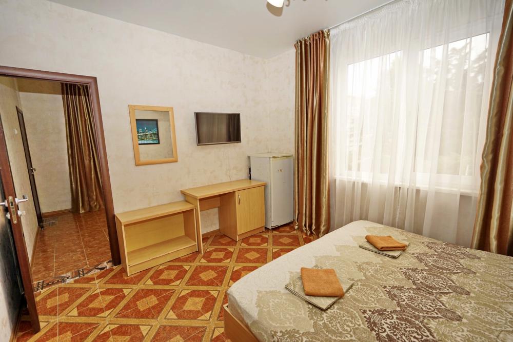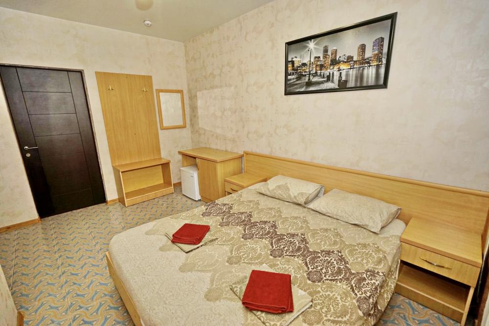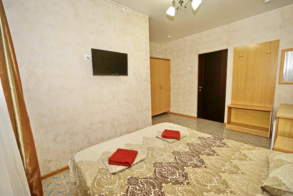 Кровать двуспальная, тумбочки, стол, прихожая, шкаф. Техника: телевизор, холодильник, кондиционер. Удобства: постельное бельё, полотенца, вешалки, спутниковое ТВ, Wi-Fi. Санузел: совмещенный в номере (душ+туалет) Дополнительное место не входит в стоимость номера. Если в номере людей будет проживать больше, чем положено, нужно оплатить дополнительные места. Оплата дополнительного места осуществляется для детей до 3х лет – 300 руб/сутки, с 3х лет стоимость предоставления доп места - 500 руб/сутки. Бесплатное проживание дополнительных гостей гостевой дом не осуществляет независимо от возраста.