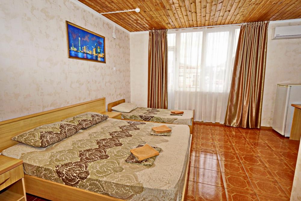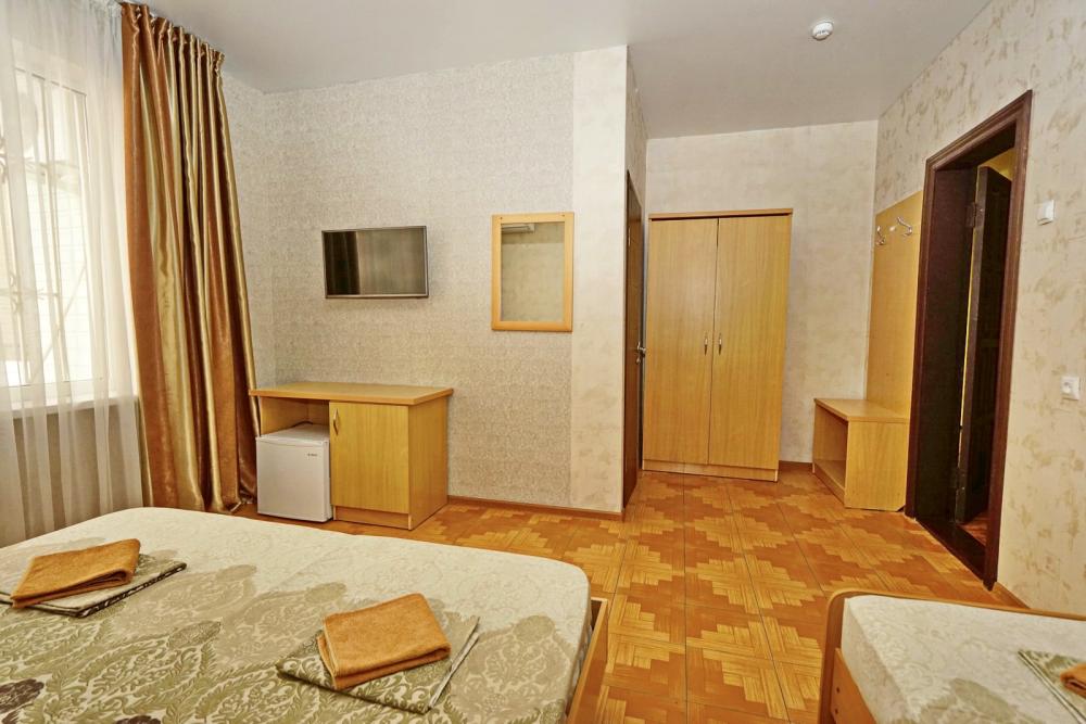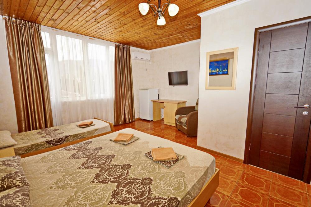 Кровать двуспальная, односпальная кровать или кресло-кровать, тумбочки, стол, прихожая, шкаф. Техника: телевизор, холодильник, кондиционер. Удобства: постельное бельё, полотенца, вешалки, спутниковое ТВ, Wi-Fi. Санузел: совмещенный в номере (душ+туалет) Дополнительное место не входит в стоимость номера. Если в номере людей будет проживать больше, чем положено, нужно оплатить дополнительные места. Оплата дополнительного места осуществляется для детей до 3х лет – 300 руб/сутки, с 3х лет стоимость предоставления доп места - 500 руб/сутки. Бесплатное проживание дополнительных гостей гостевой дом не осуществляет независимо от возраста.