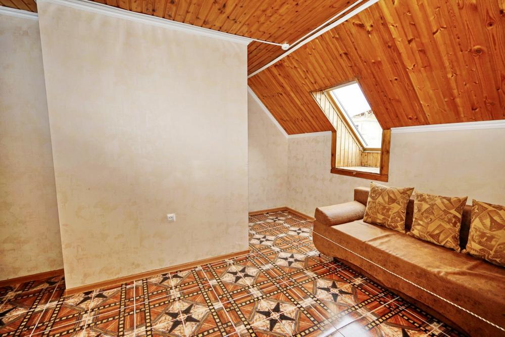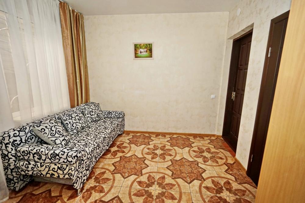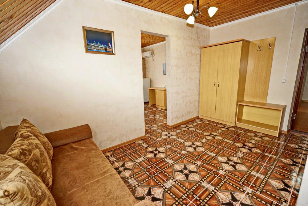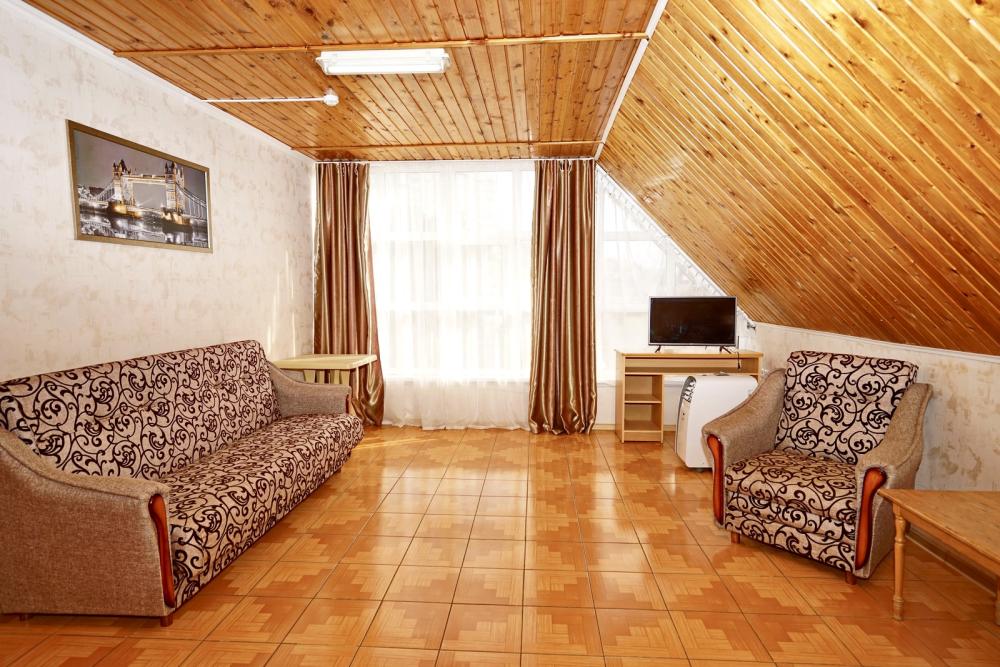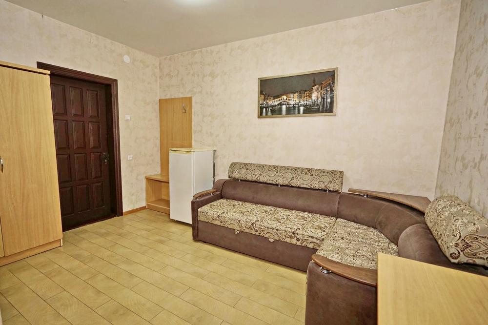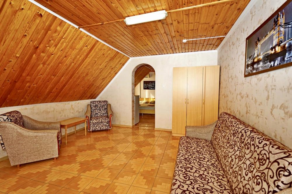 Кровать двуспальная, диван двуспальный, тумбочки, стол, прихожая, шкаф. Техника: телевизор, холодильник, кондиционер. Удобства: постельное бельё, полотенца, вешалки, спутниковое ТВ, Wi-Fi. Санузел: совмещенный в номере (душ+туалет) Дополнительное место не входит в стоимость номера. Если в номере людей будет проживать больше, чем положено, нужно оплатить дополнительные места. Оплата дополнительного места осуществляется для детей до 3х лет – 300 руб/сутки, с 3х лет стоимость предоставления доп места - 500 руб/сутки. Бесплатное проживание дополнительных гостей гостевой дом не осуществляет независимо от возраста.